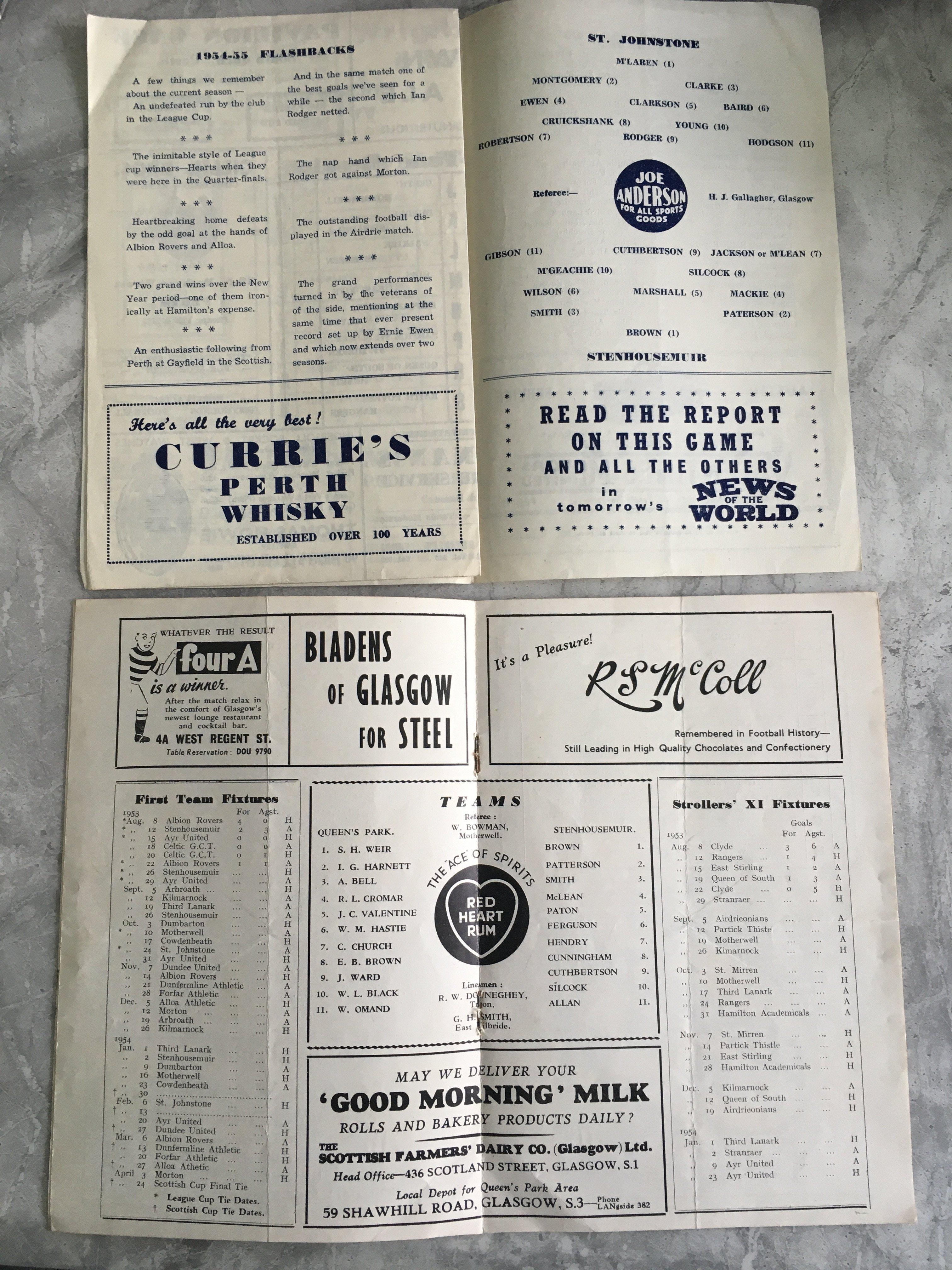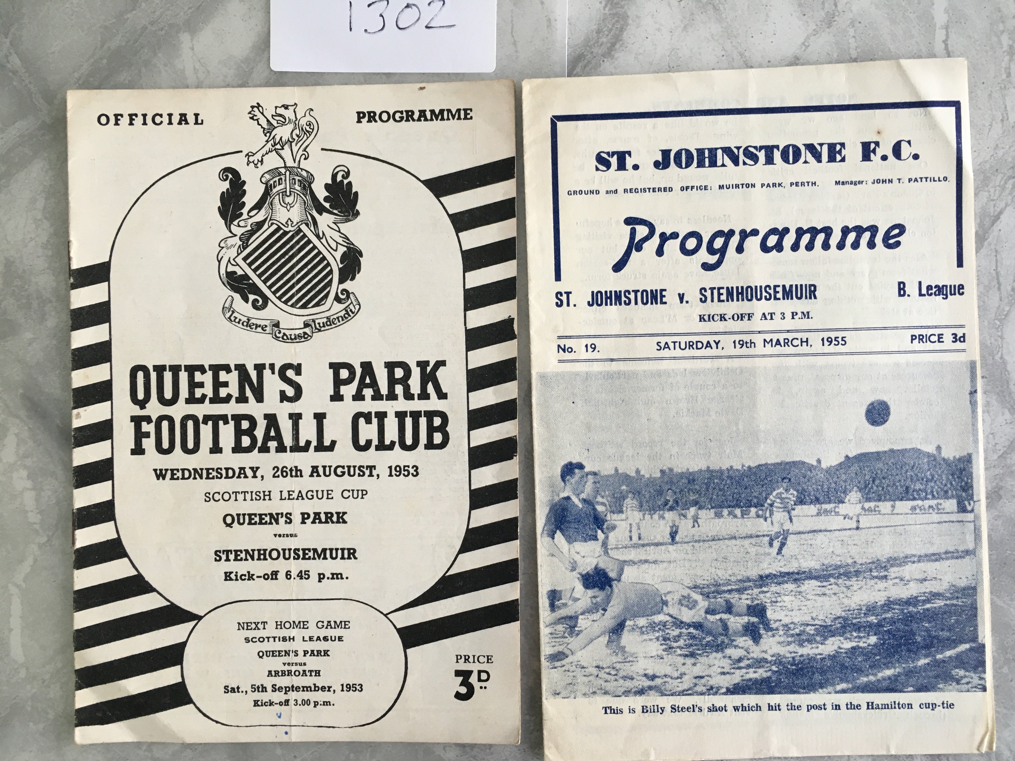 1950s Stenhousemuir Football Programmes: Aways at 54/55 St Johnstone + 53/54 Queens Park cup. Good with no team changes. (2)