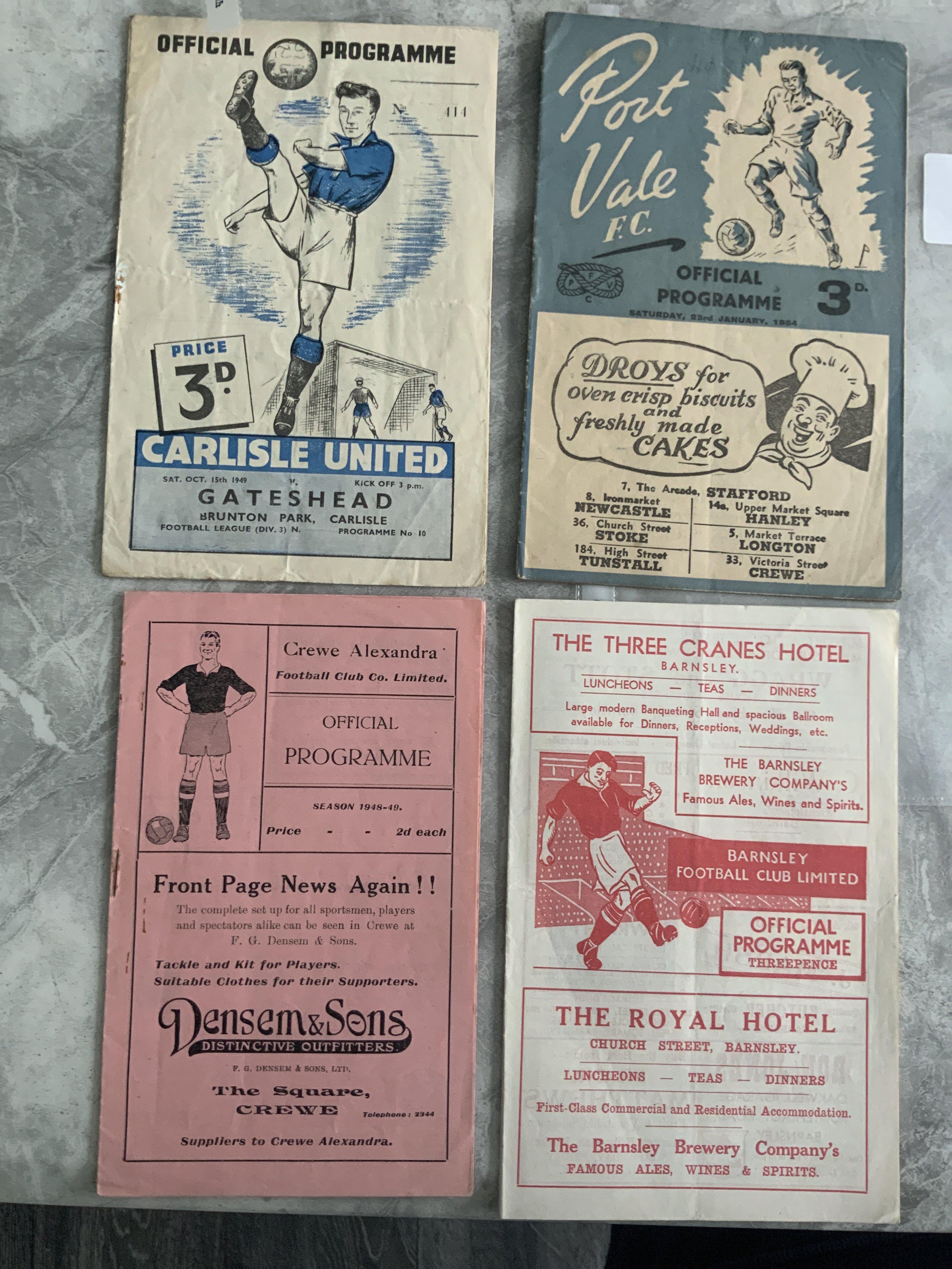 Gateshead Away Football Programmes: 48/49 Crewe, 49/50 Carlisle, 53/54 Port Vale, 54/55 Barnsley. Very good. (4)