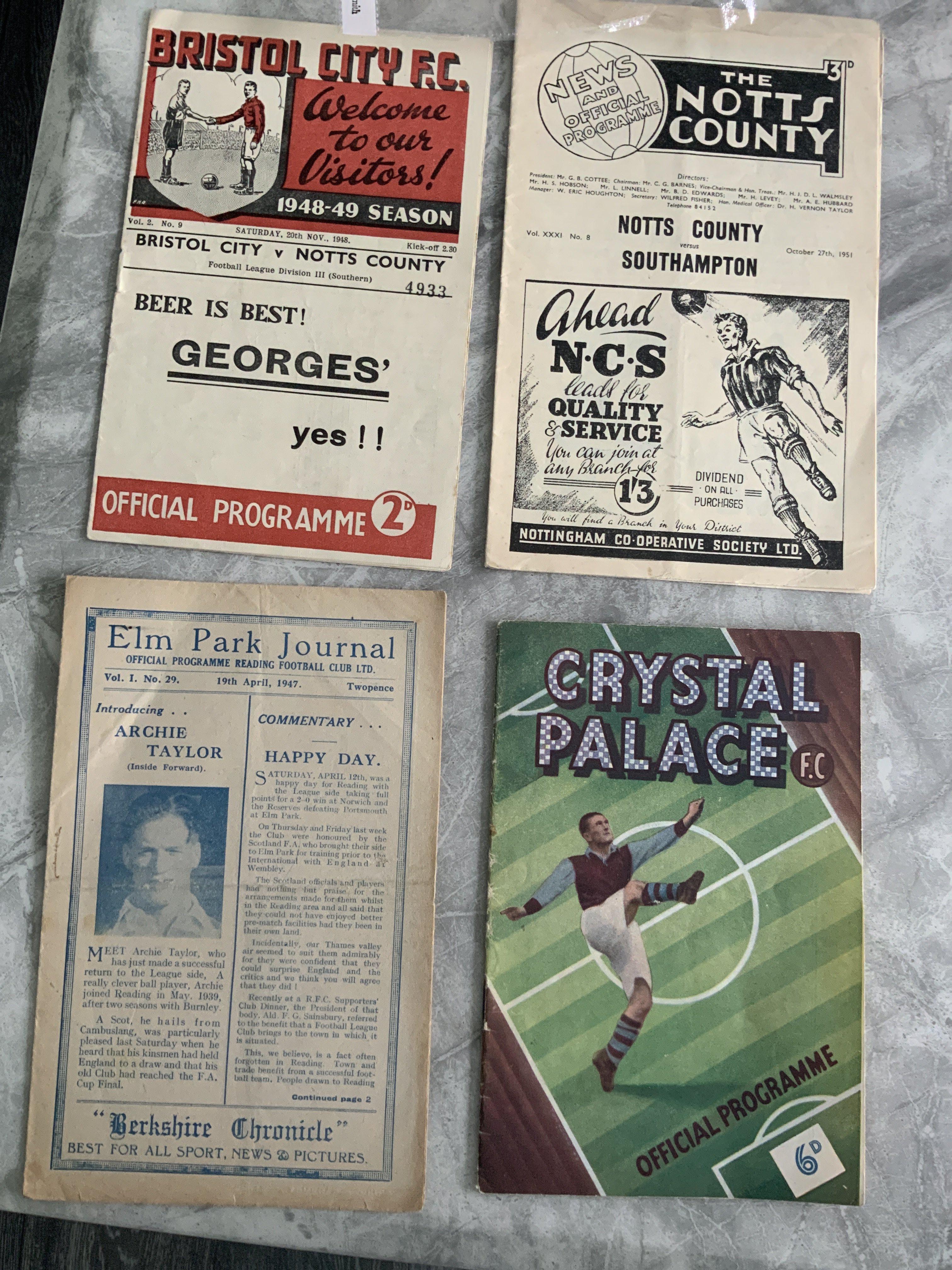 Notts County Football Programmes: Away v 46/47 Reading, 48/49 Bristol,City, 49/50 Crystal Palace and home v 51/52 Southampton. Very good. (4)