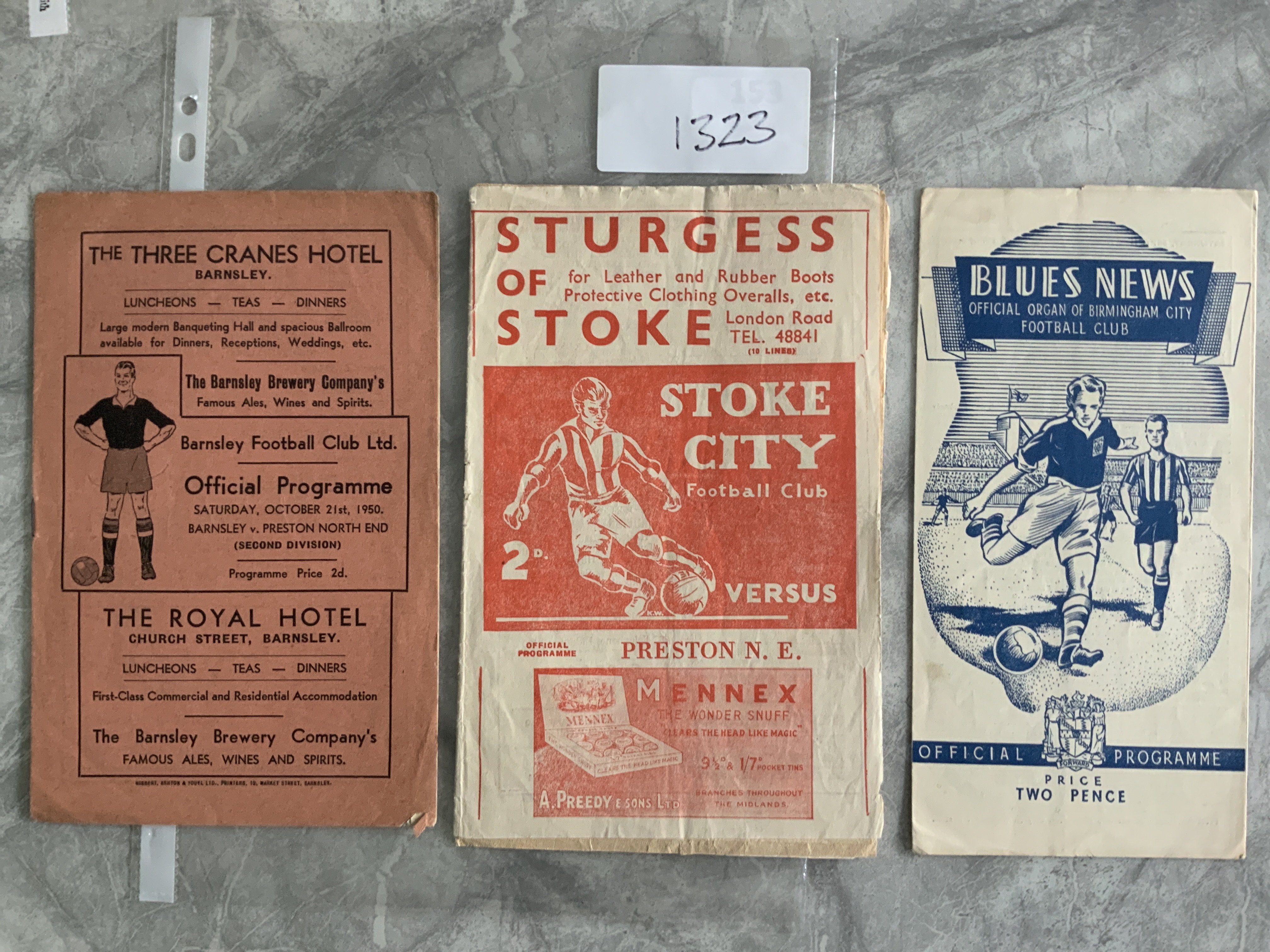 Preston Away Football Programmes: 48/49 Birmingham, 50/51 Barnsley, 51/52 Stoke. Good. (3)