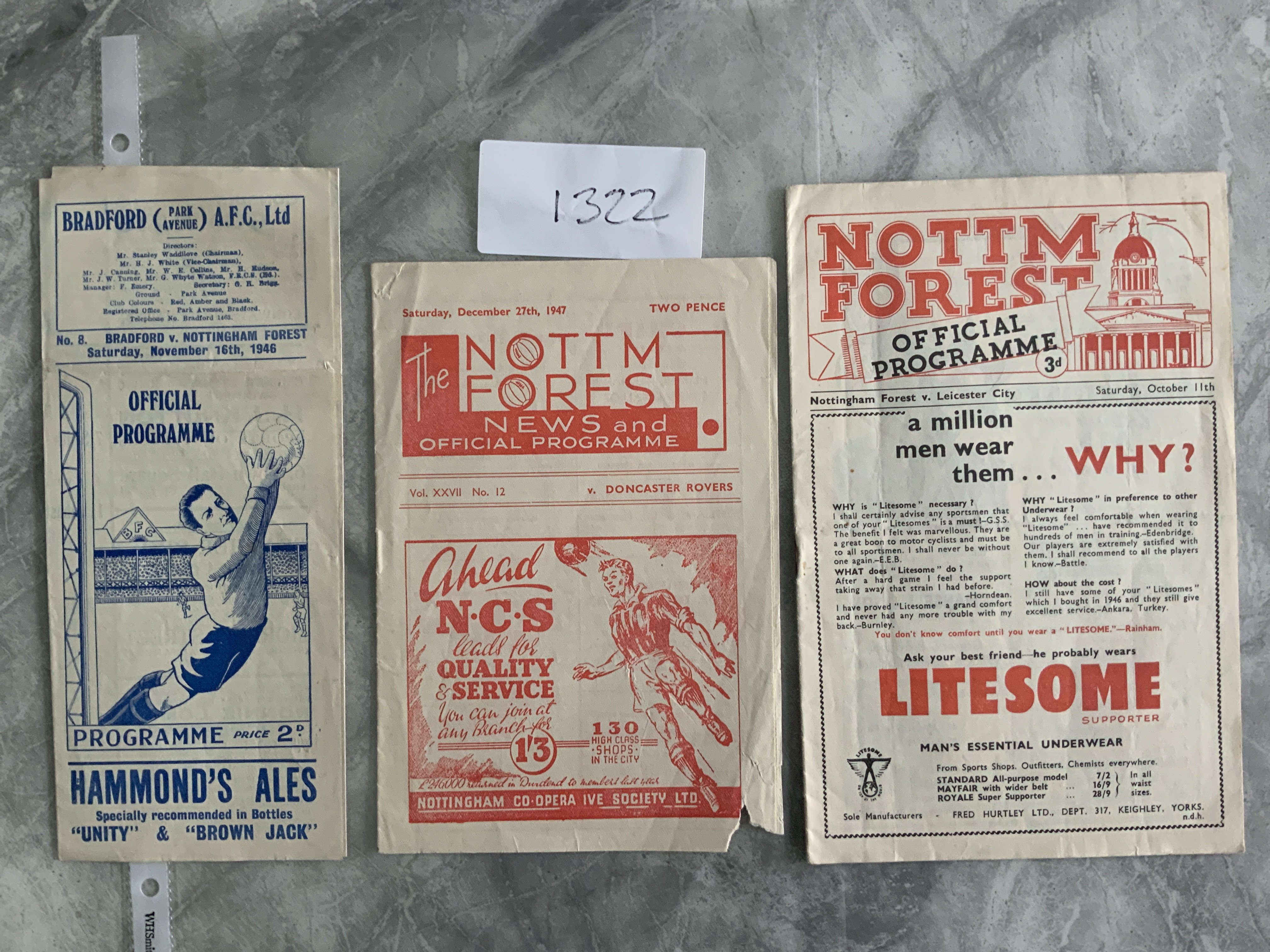 Nottingham Forest Football Programmes: Away to 46/47 Bradford Park Avenue and home to 47/48 Doncaster piece missing from border, 51/52 Leicester. Very good unless stated. (3)