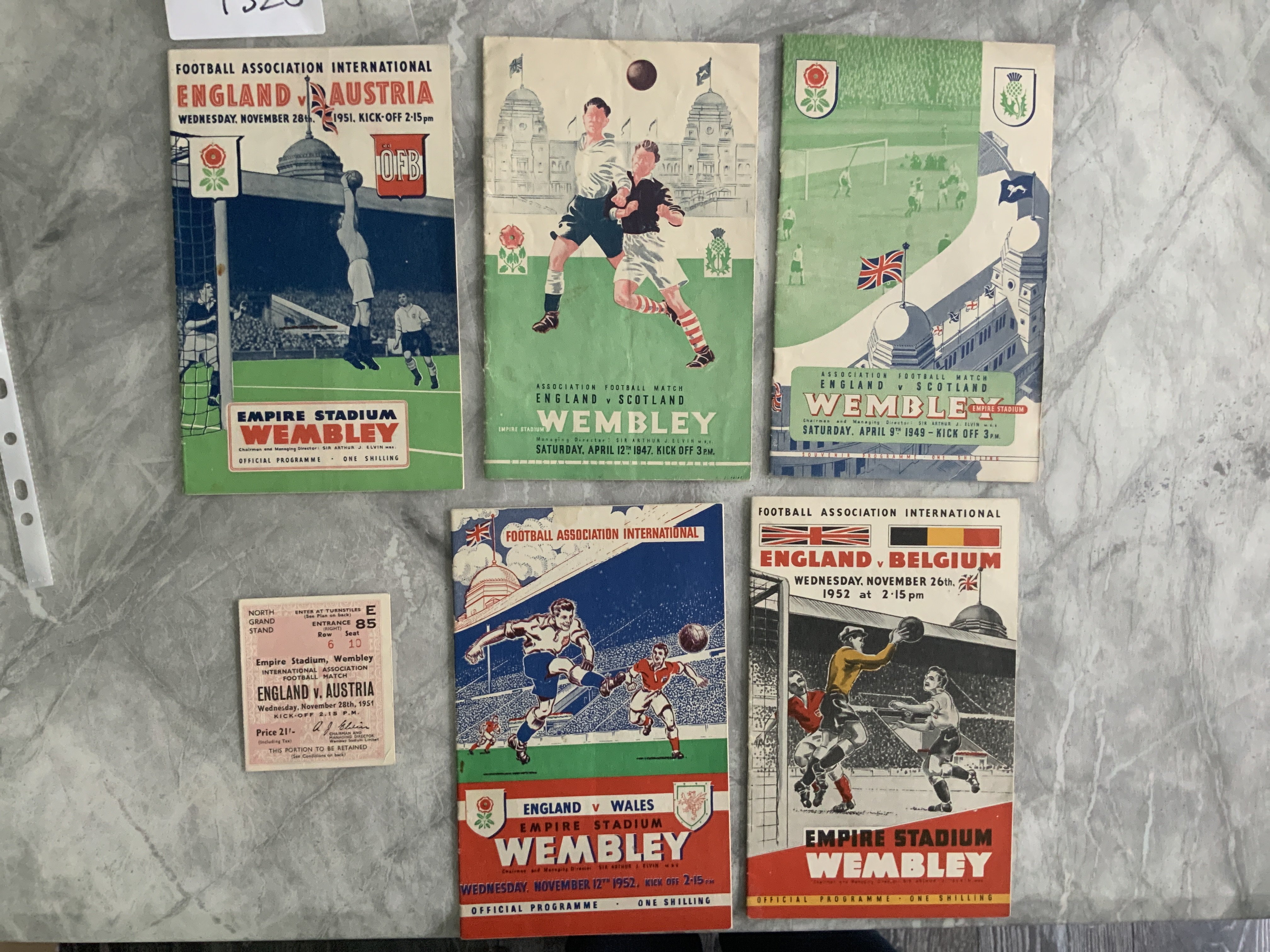 England 1947 - 1952 Home Football Programmes: 1947 + 1949 Scotland, 1951 Austria with ticket, 1952,Belgium + Wales. Very good. (6)