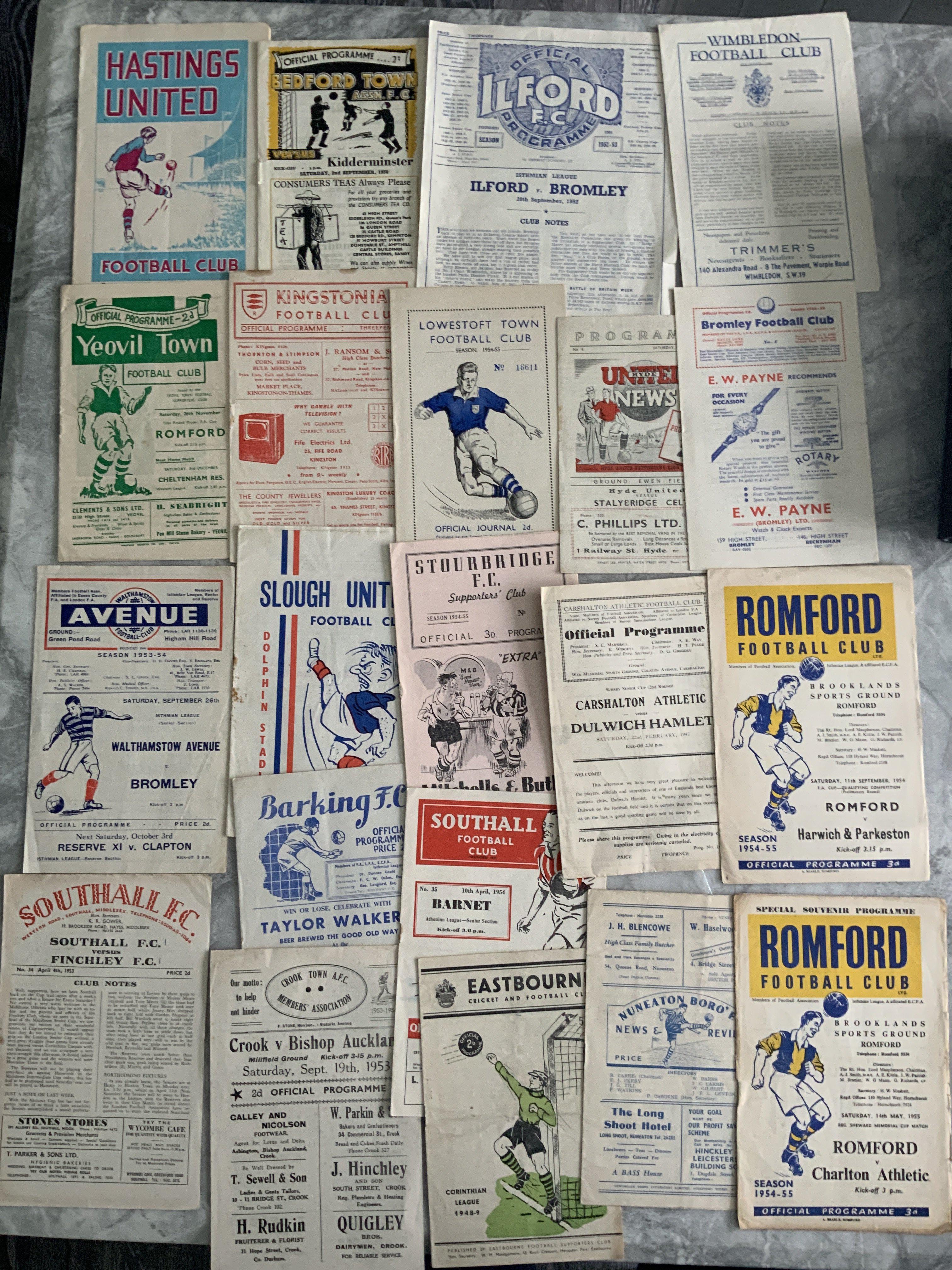 Old Non League Football Programmes: Worth a look with some nice programmes. Includes 46/47 Slough v Bedford, Carshalton v Dulwich, 47/48 Hyde Utd v Staley ridge Celtic, 48/49 Eastbourne v Hounslow, 49/50 Yeovil v Romford FA Cup, 50/51 Bedford v Kidderminster, Hastings v Bedford, 51/52 Kingstonian v Sutton, 52/53 Barking v Corinthians, 53/54 Crook v Bishop Auckland 54/55 Stourbridge v Brierley Hill, Lowestoft v Gorleston and more with the most recent being 54/55. Very good. (21)