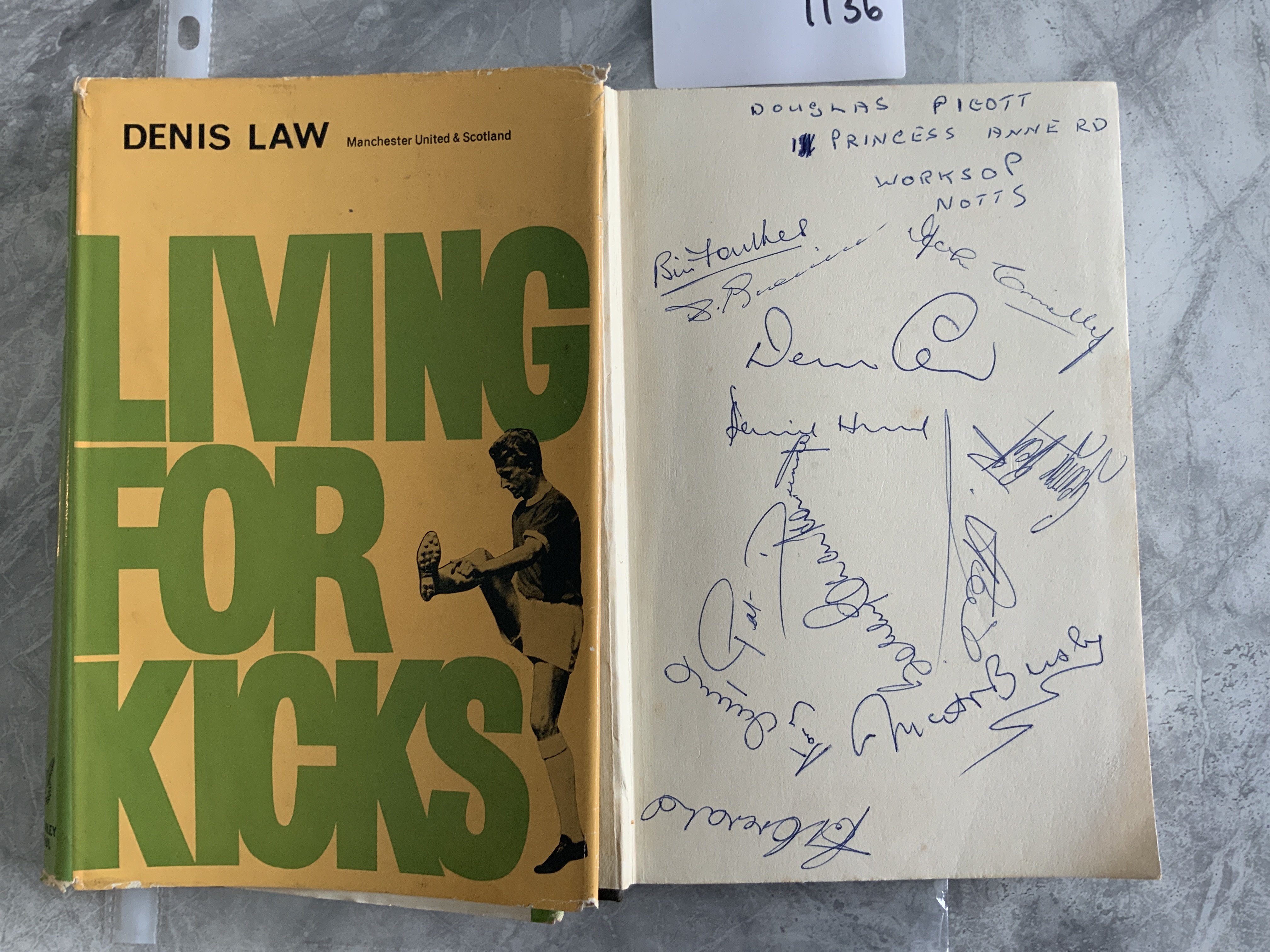 Denis Law Manchester United Multi Signed Football Book: Living For Kicks 1963 with price clipped dust jacket by Stanley Paul. Signed on inside blank page by Law Foulkes Brennan Connelly Herd Best Charlton Busby Crerand and Dunne.