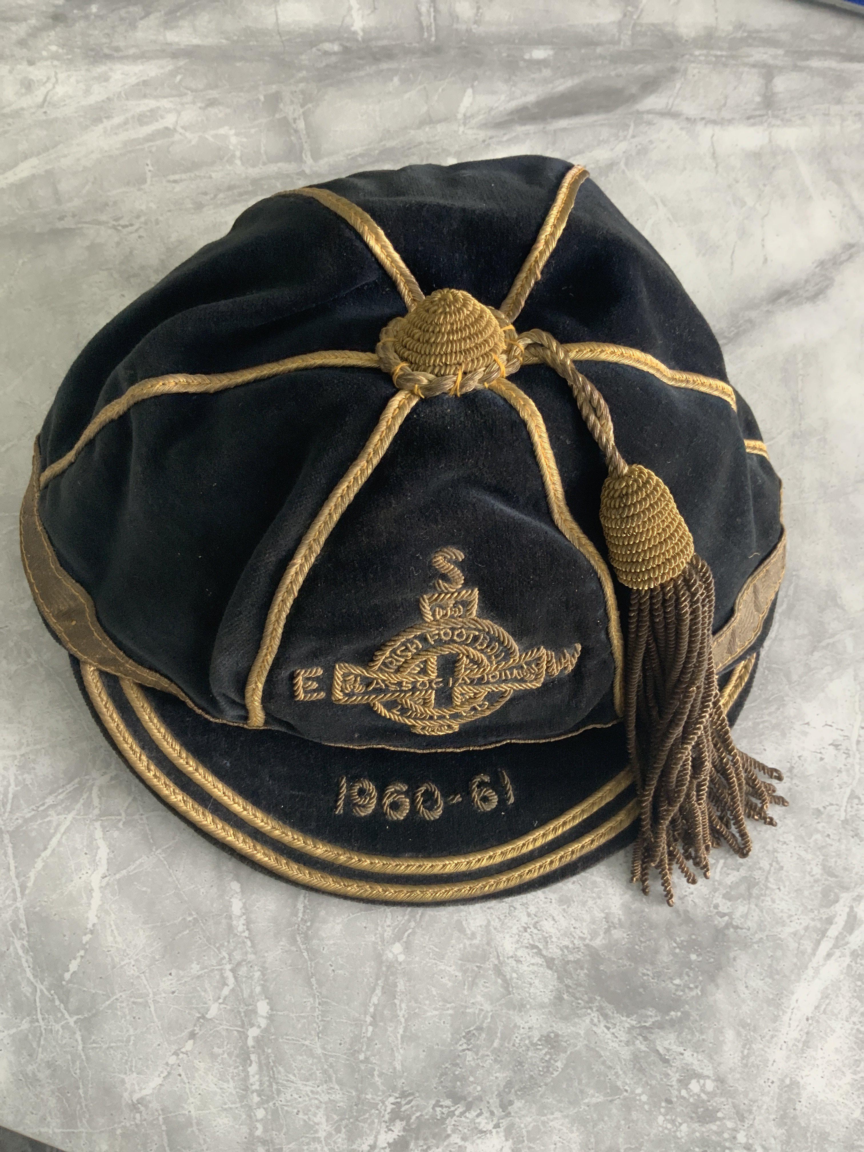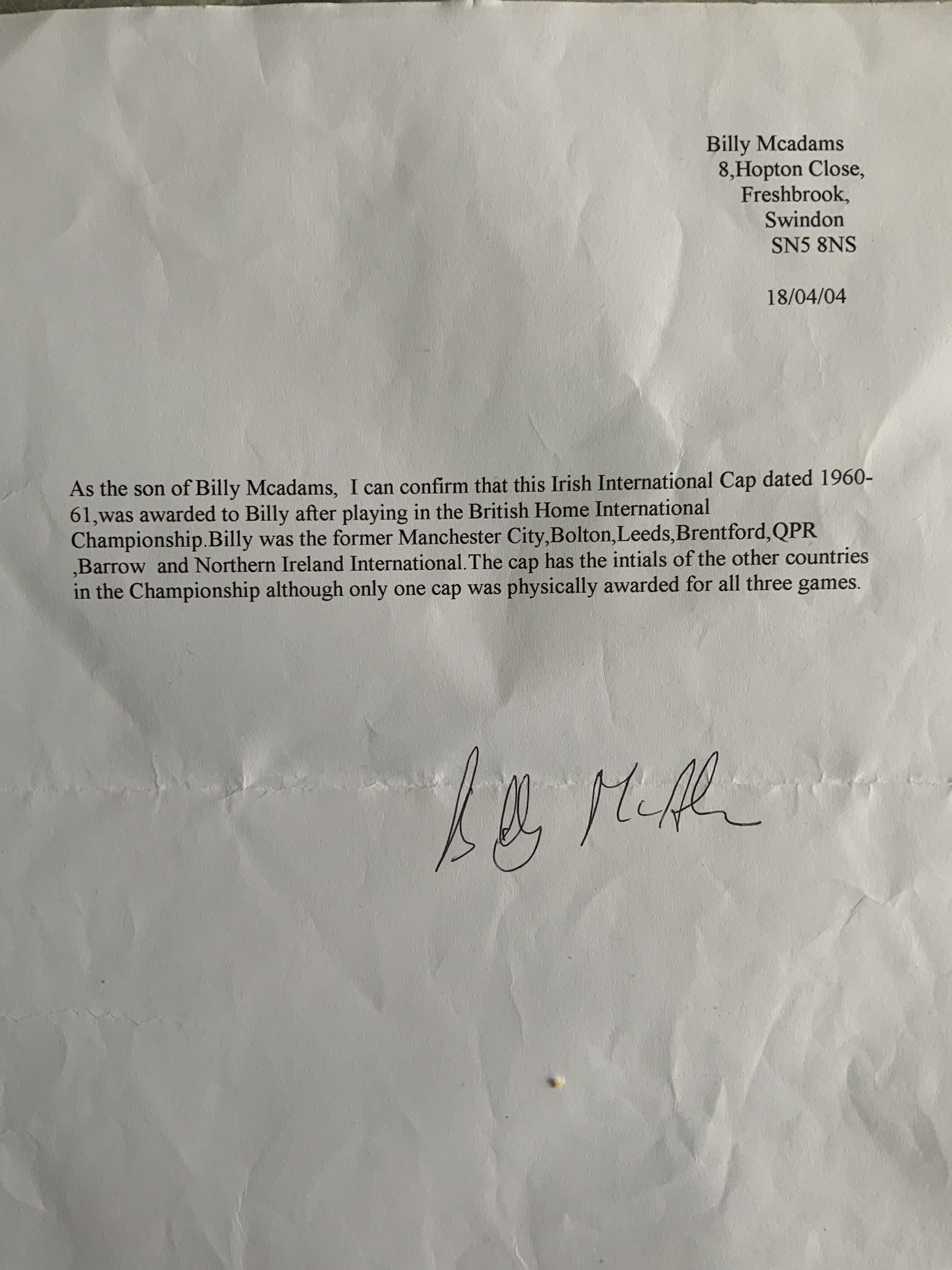 Billy McAdam Northern Ireland 60-61 Football Cap: Front of tasseled cap either side of Irish Football Association badge has the letters E S W. These are the opponents and games that the cap was awarded for which are England Scotland and Wales. Peak has 1960-61. COA from son of Billy.