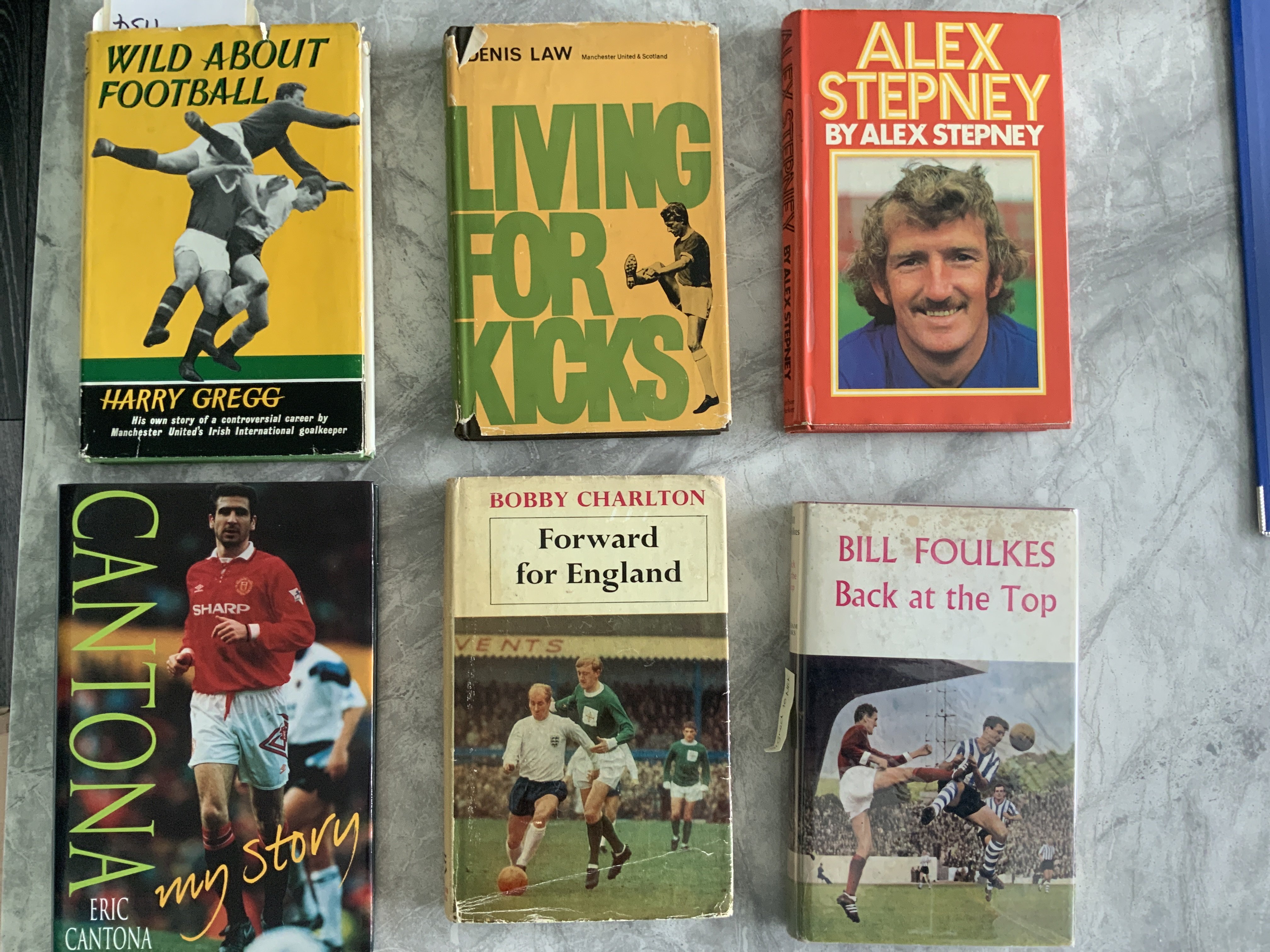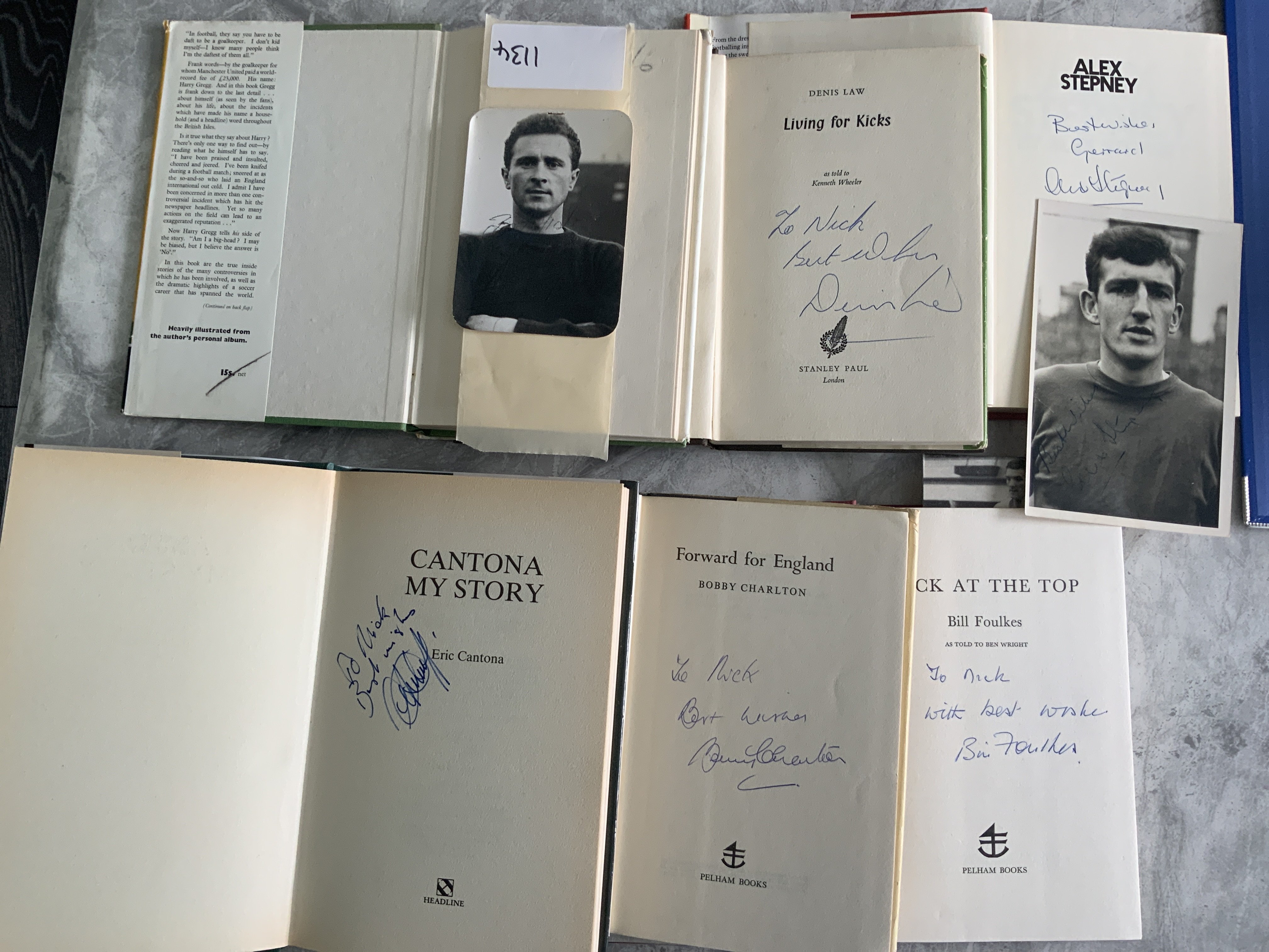 Manchester United Signed + Dedicated Football Books: Autobiographies of Harry Gregg Denis Law Bill Foulkes Alex Stepney Bobby Charlton and Eric Cantona. Mainly dedicated to Nick. Harry Gregg has not signed directly onto book. Additionally Alex Stepney has also signed a photo and Foulkes has additionally signed a few magazine pictures. (6)