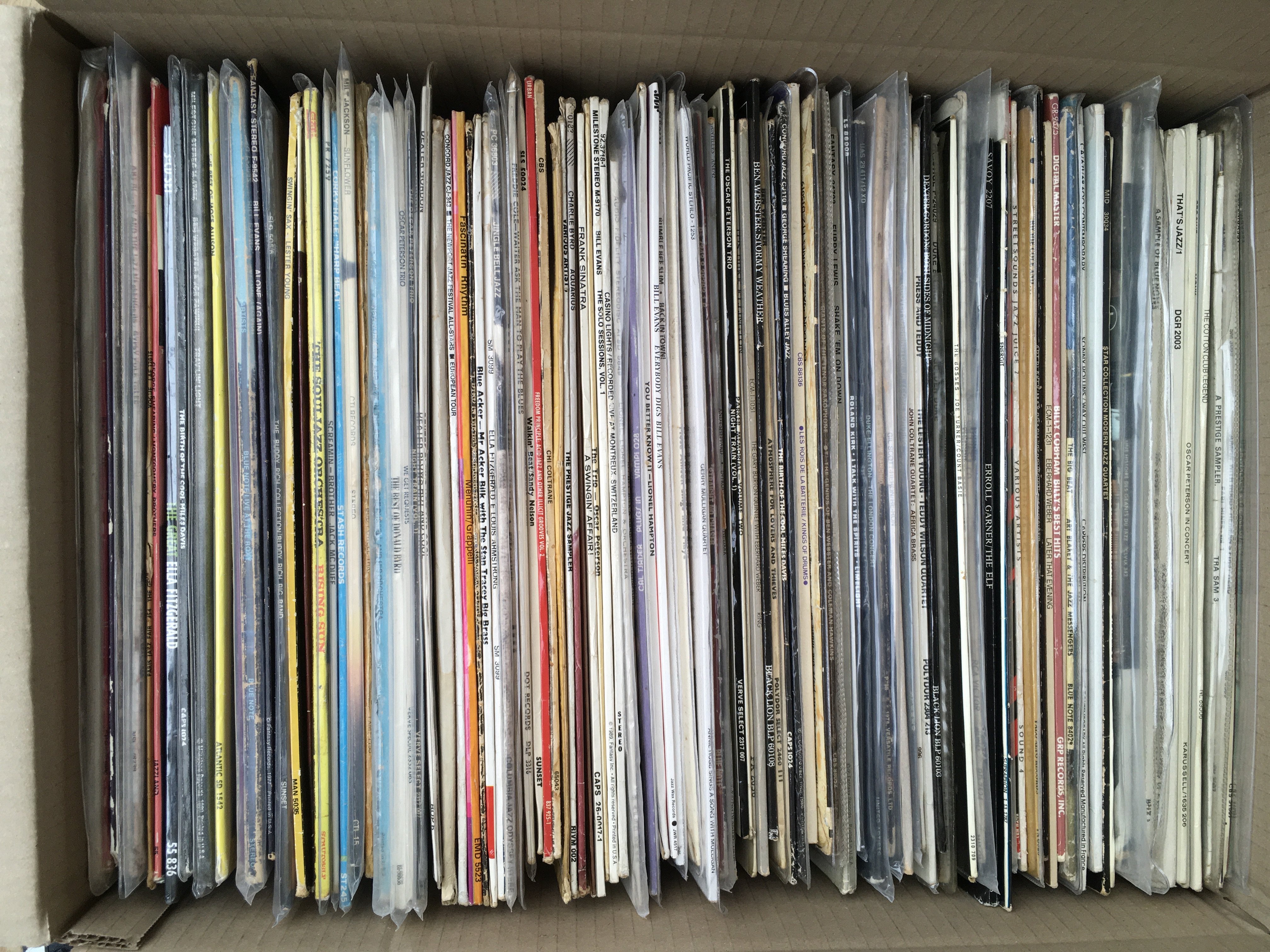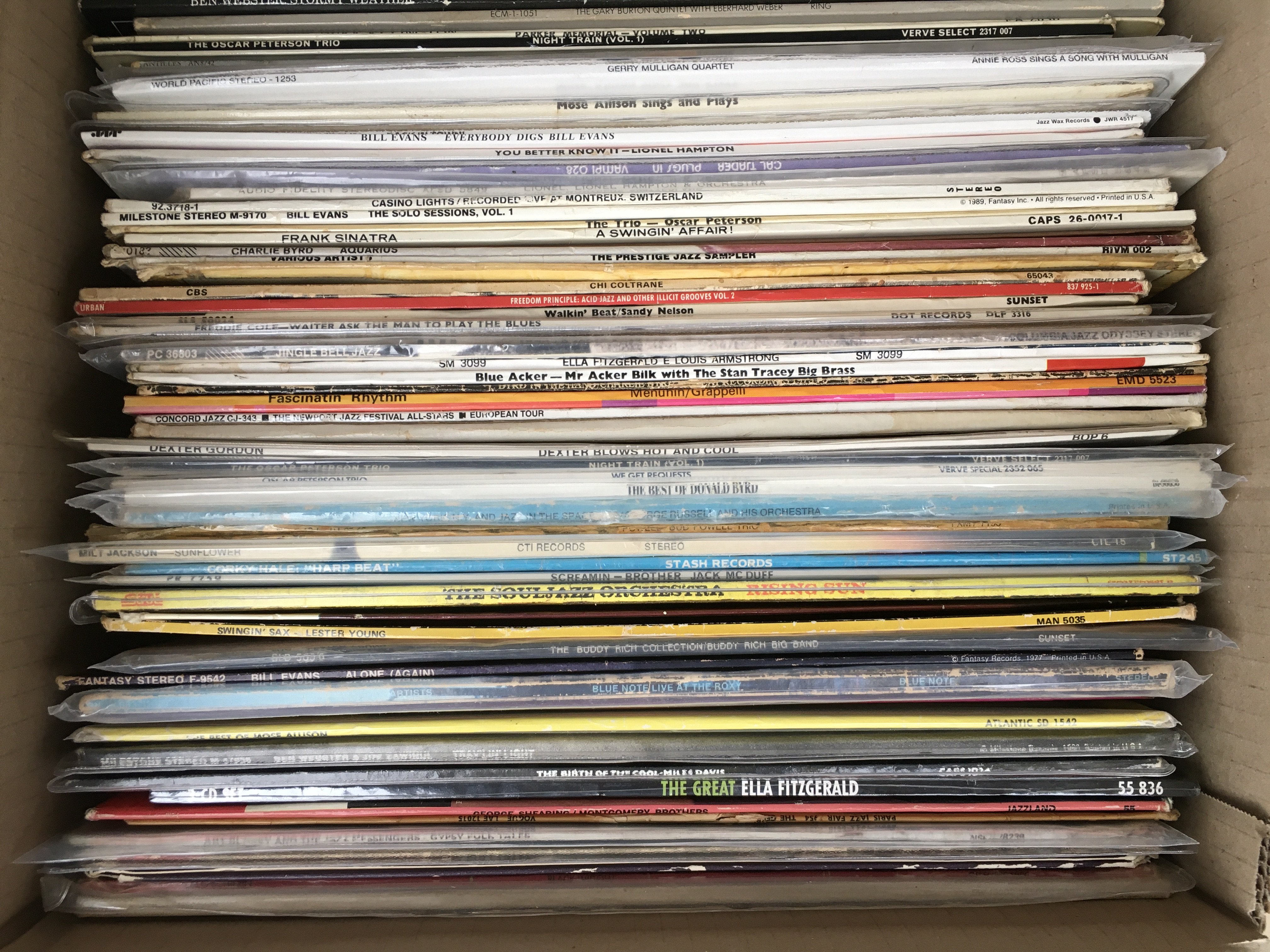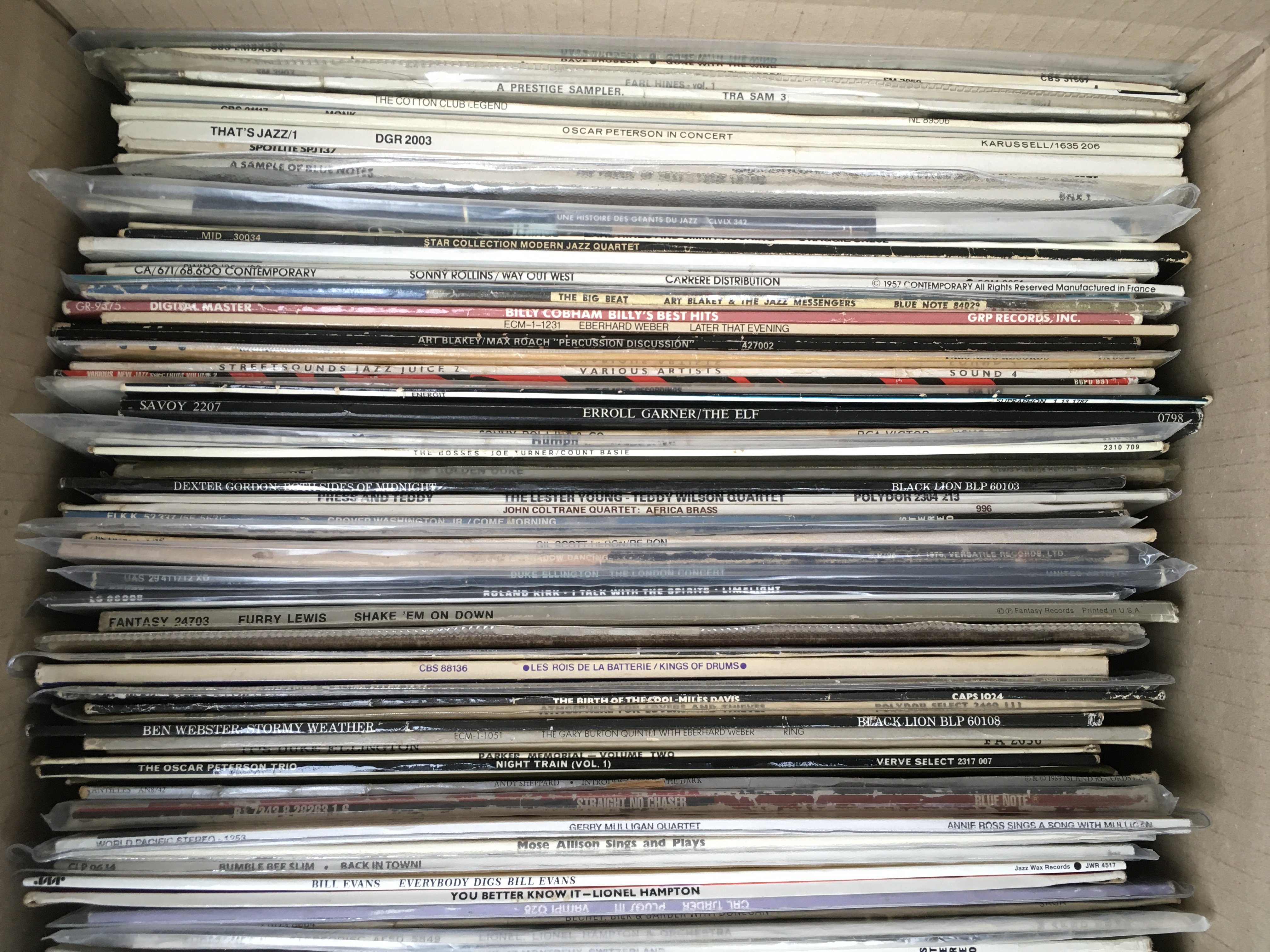 A box of jazz LPs by various artists including Miles Davis, Milt Jackson, Donald Byrd and many more.