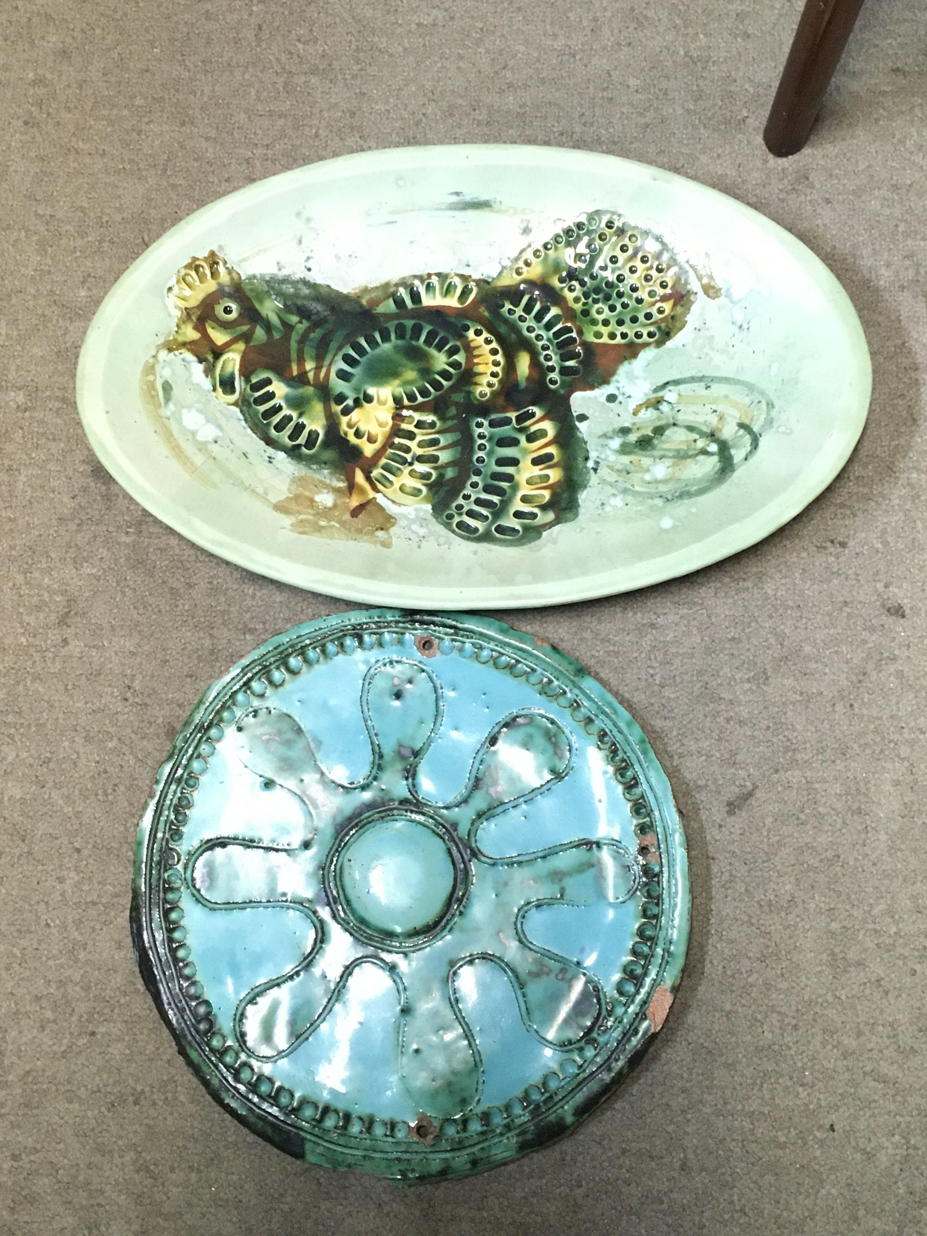 Two art dishes including an oval ceramic cockerel design dish and a Turquoise wall dish. This lot cannot be posted