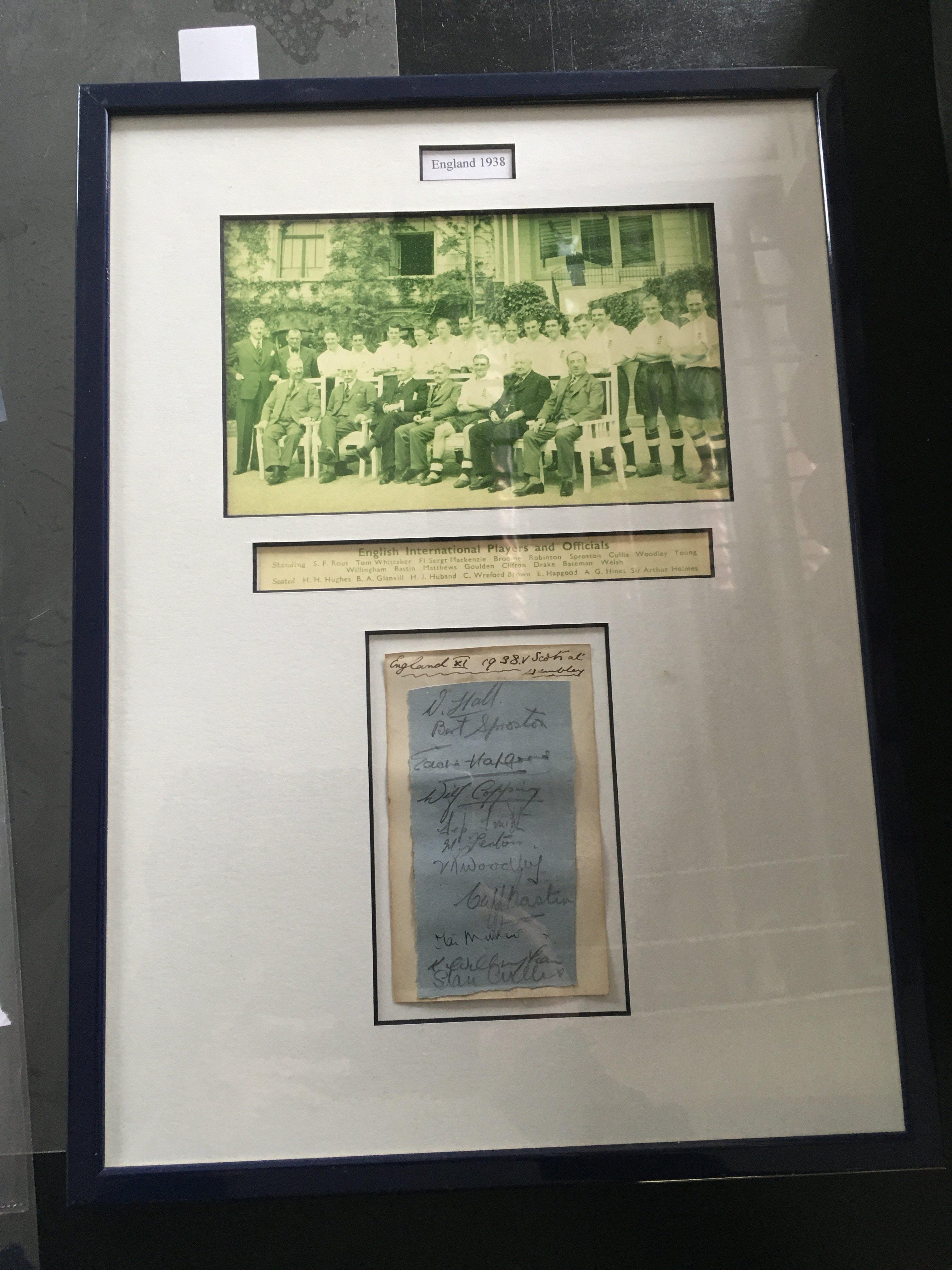 1938 England Football Team Signed Display: Autograph page headed England X1 1938 Scotland Wembley. Beneath in pencil are 11 autographs and include Bastin Copping Sproston Woodley Cullis and Fenton. Team group displayed above. Framed and glazed.