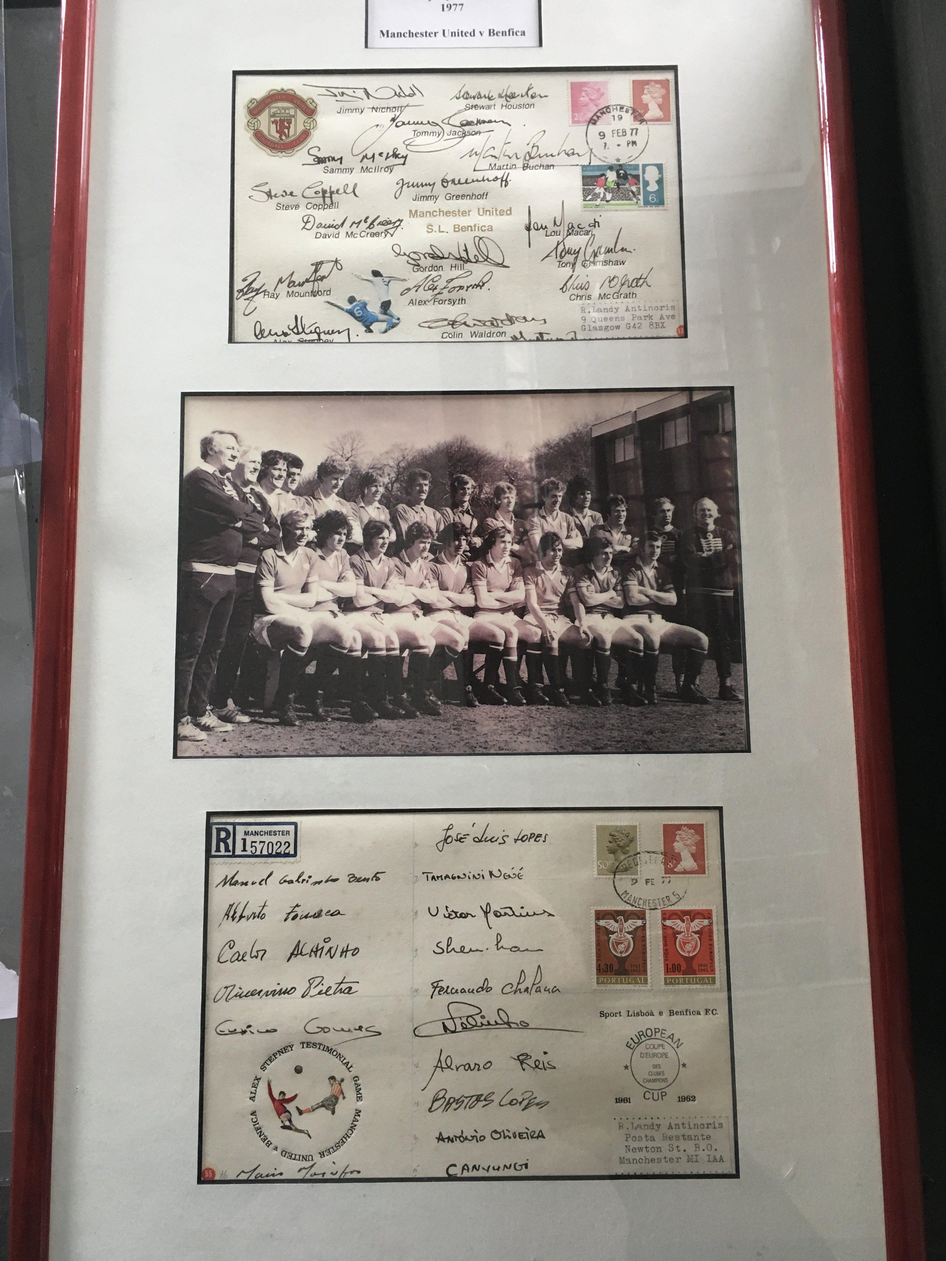 1977 Manchester United v Benfica Fully Signed Display: Alex Stepney testimonial featuring a team picture in the middle of Manchester United. Either side is a large first day cover. The top one is signed by 16 Manchester United players and the bottom one in the display is signed by 16 of the Benfica squad. Nicely framed and glazed.