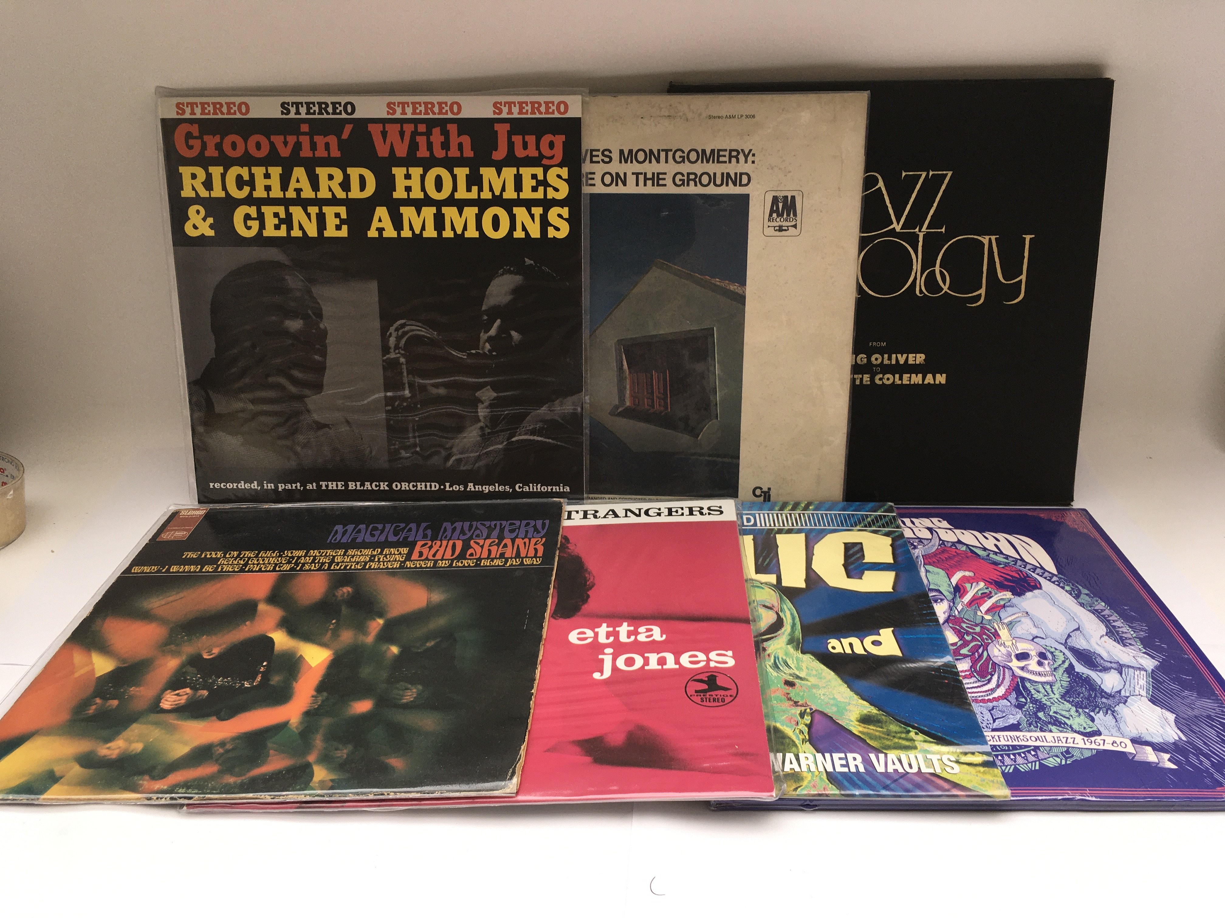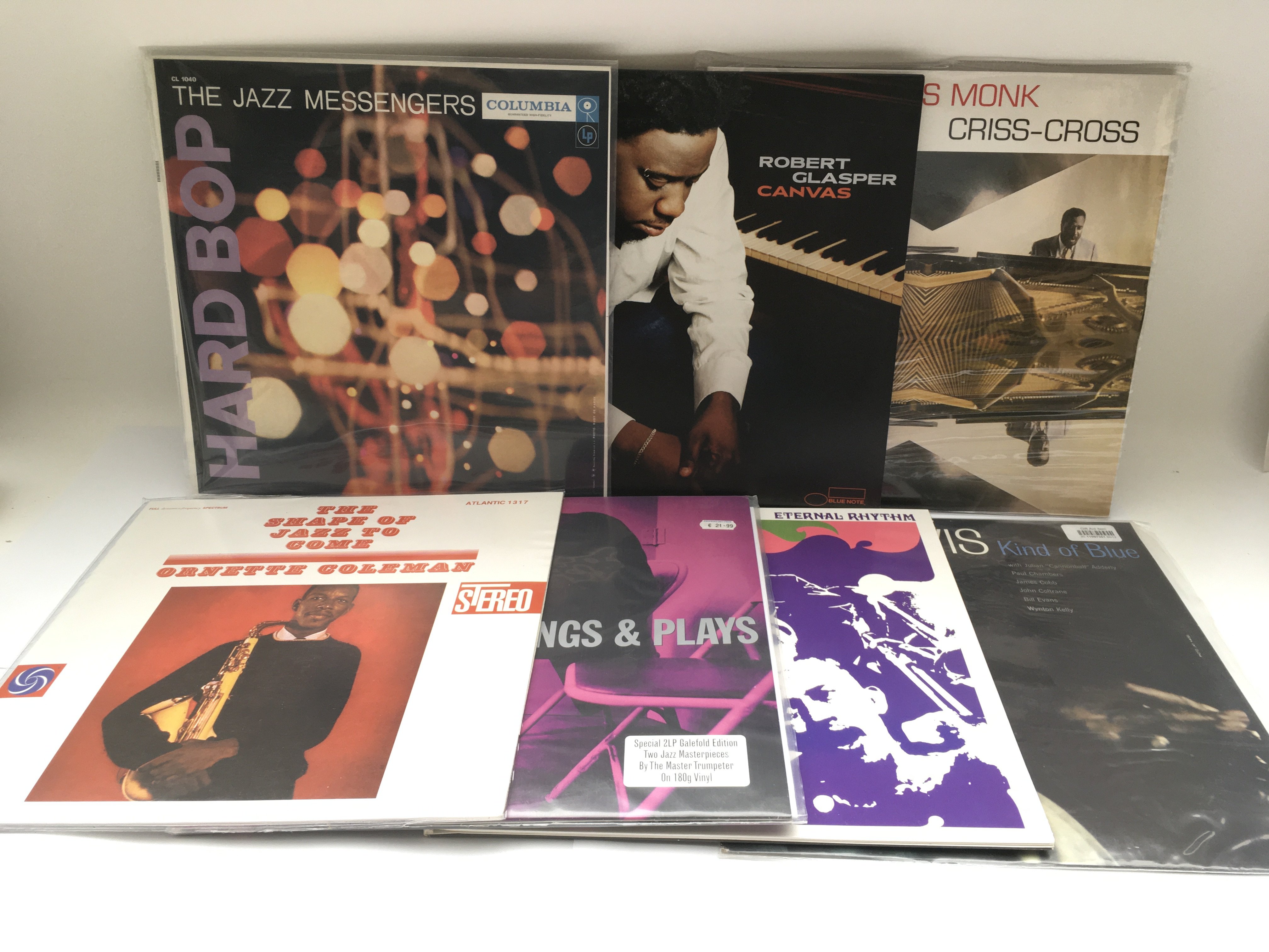 Two bags containing 14 jazz LPs by various artists including Thelonious Monk, Ornette Coleman, Robert Glasper and others. Includes both original pressings and 180g reissues.