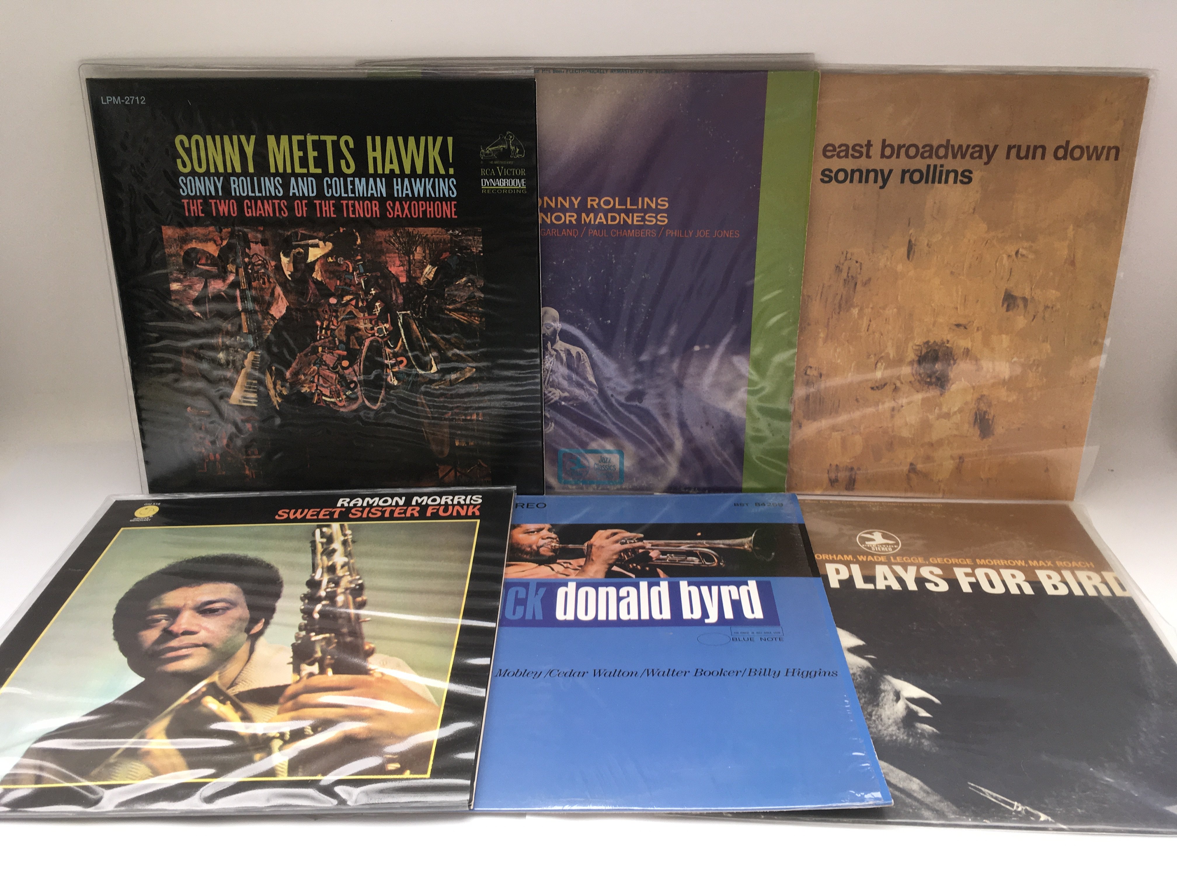 Two bags containing 12 jazz LPs by various artists including John Coltrane, Sonny Rollins, Donald Byrd and others. Includes original pressings and 180g reissues.