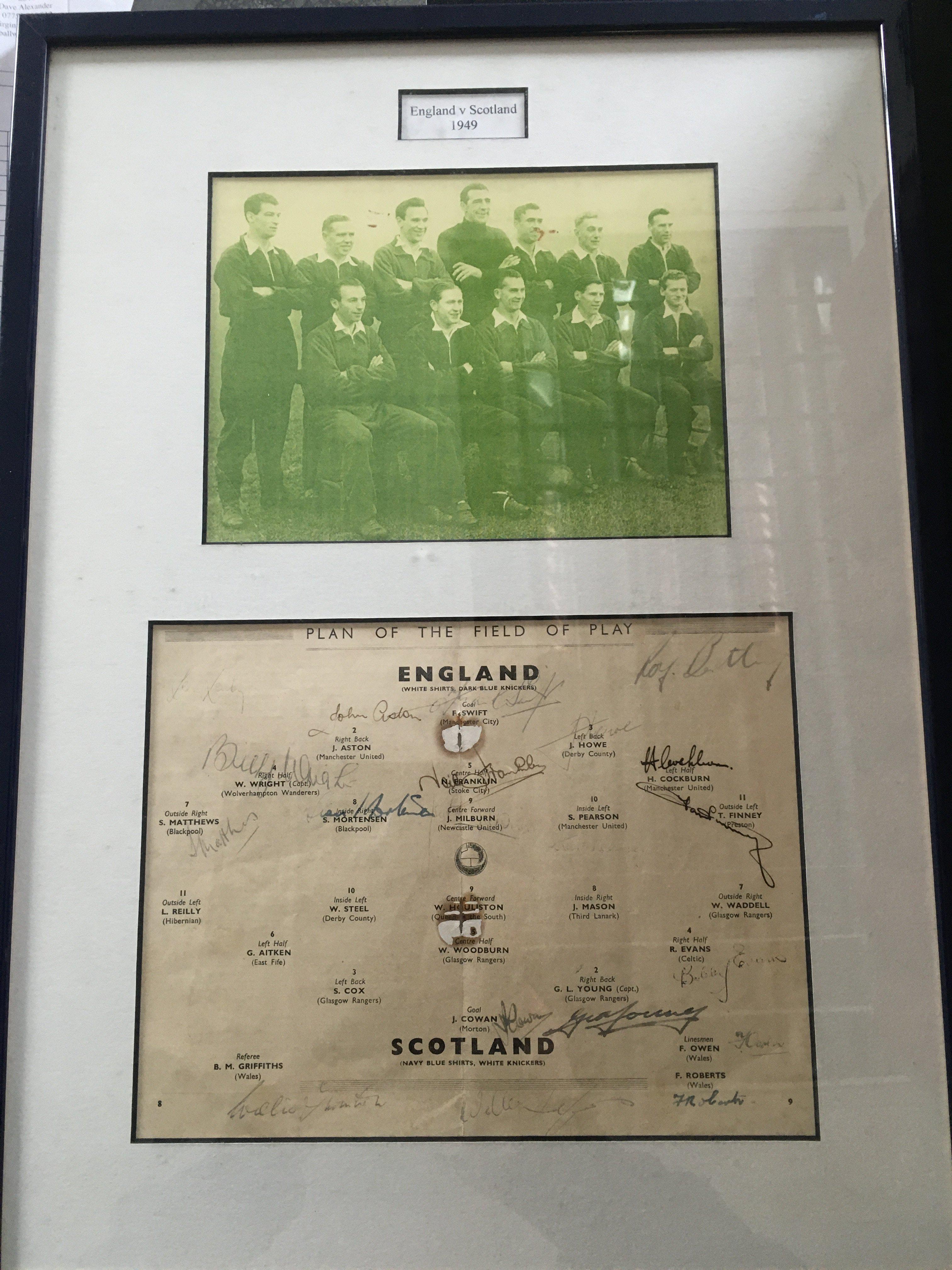 1949 England Football Team Framed Signed Display: Team page for match v Scotland signed by 10 England players and 7 Scottish players. Includes Wright Mortensen Matthews Finney of England and Young of Scotland. Framed with picture of the England team.