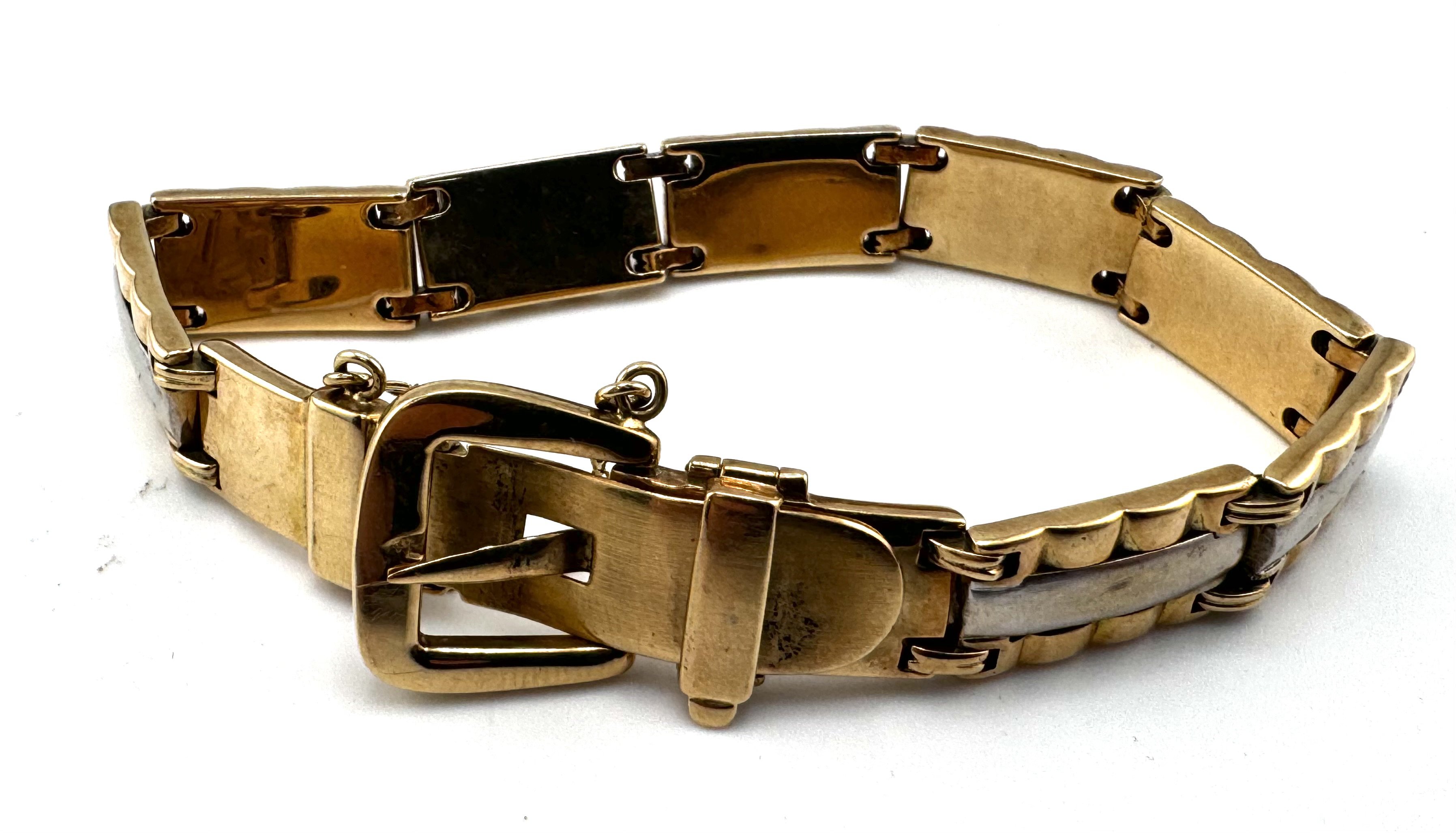 A heavy 14ct yellow and white gold bracelet with a buckle style clasp. 41.5g (A)