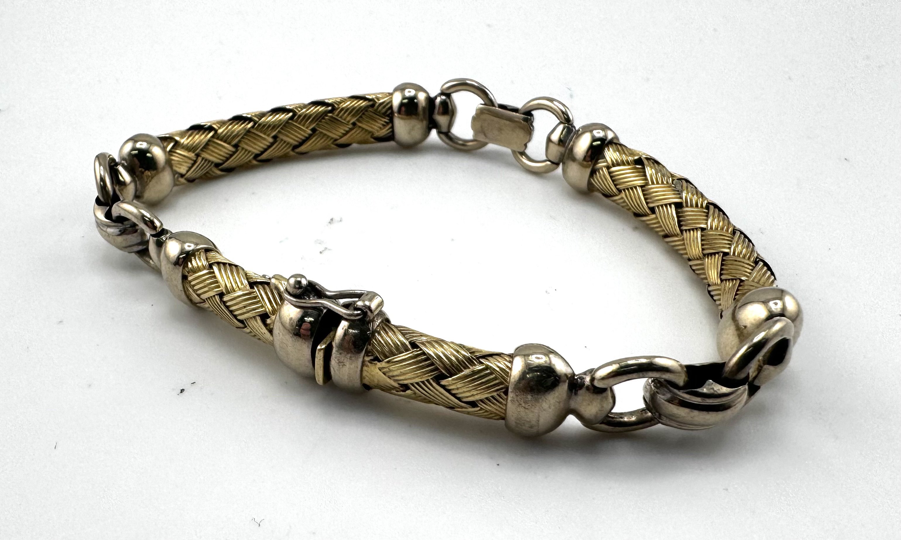 A heavy 14ct yellow and white gold weave design bracelet. 27.7g, 20cm (A)