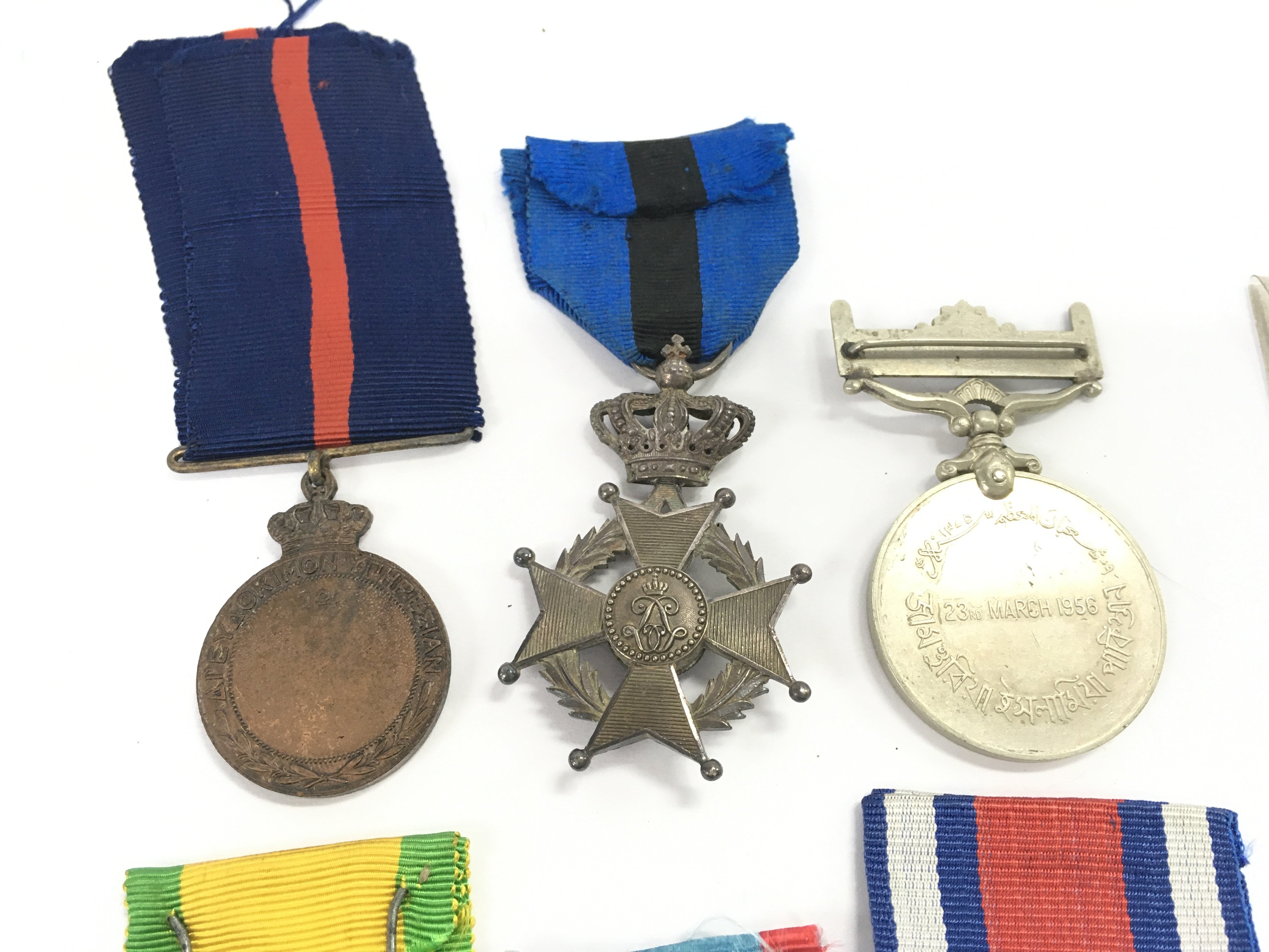 A Collection of military medals including a China 1954 merit, Polish peoples public medal, Belgium Telegraphic Service medal, French military third republic medal, 1956 Islamic Republic of Pakistan commemorative medal, Greek army medal, Belgium Order of Leopold II Medal. Postage category A