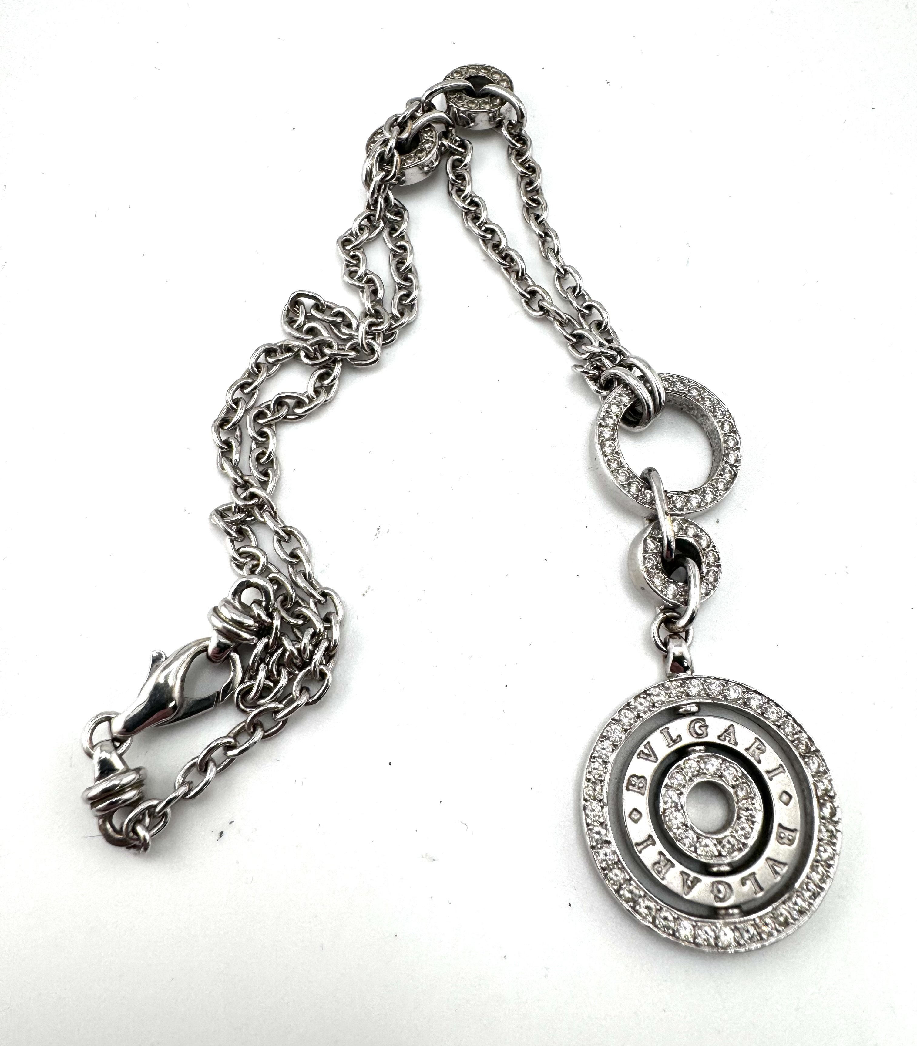 A heavy 18ct white gold necklace in the style of a Bvlgari Cerchi Astrale necklace, unmarked, tested 18ct white gold, inset with a mix of diamonds and white sapphires. Approx 35g (A)