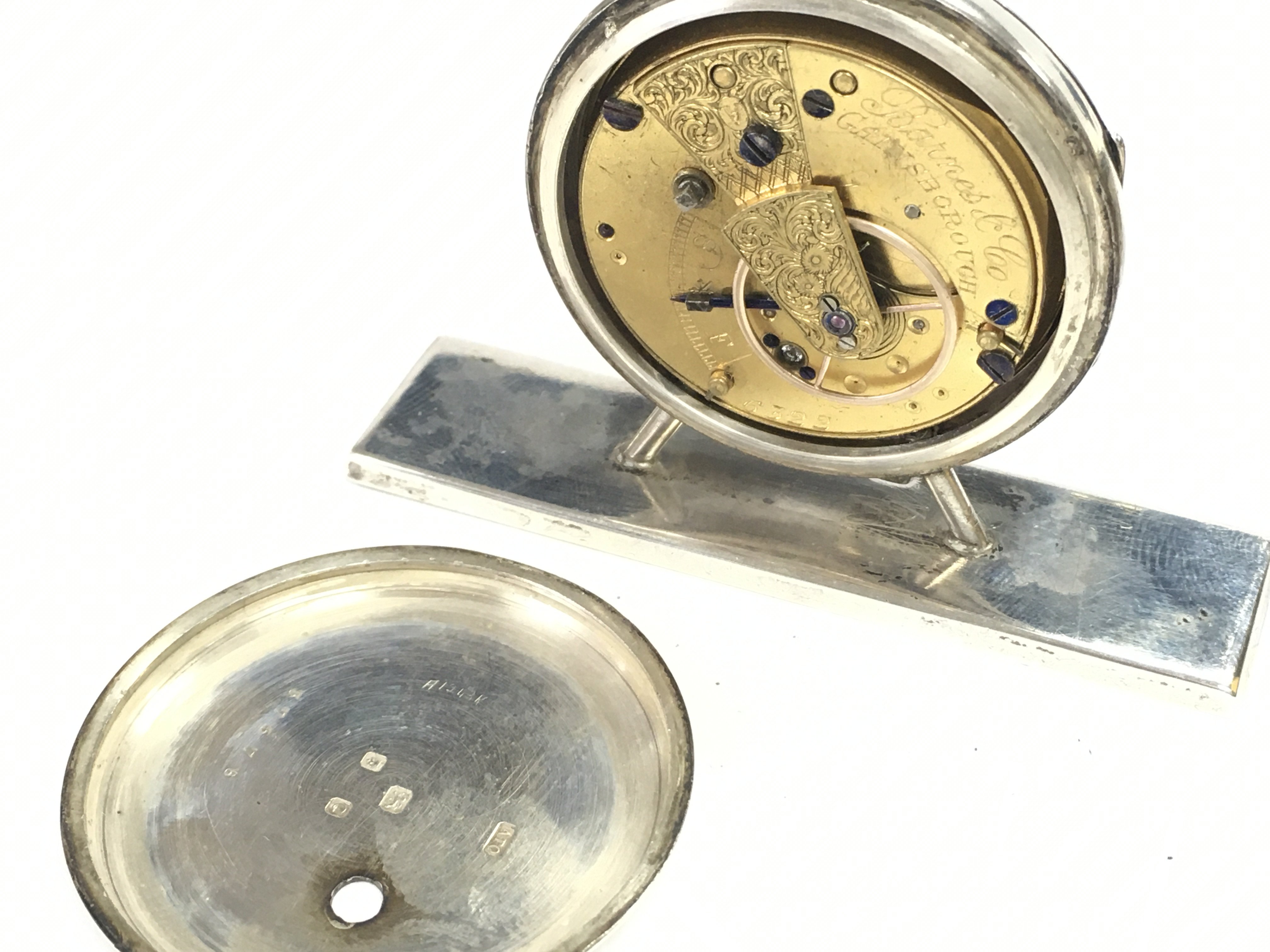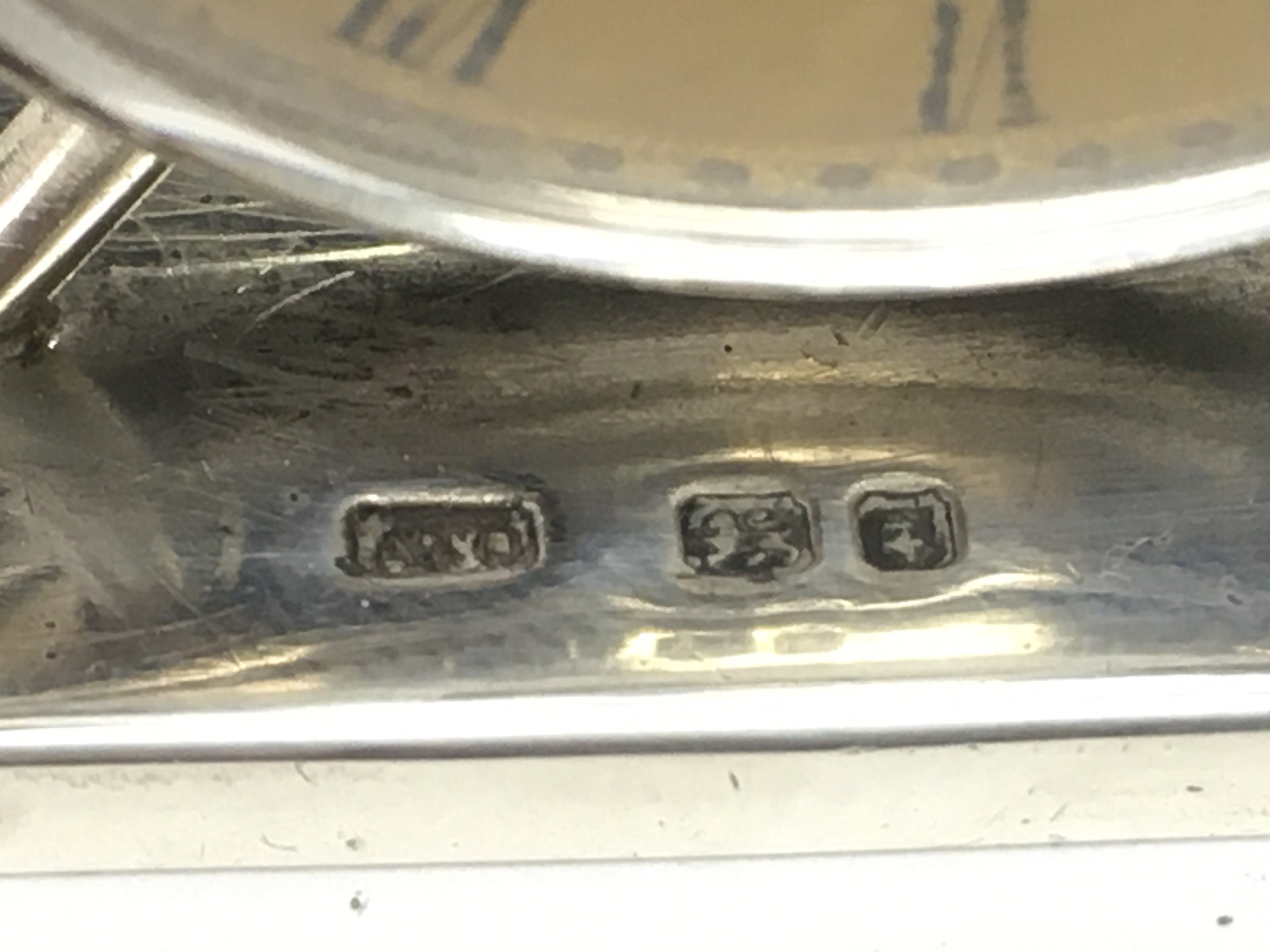 A hallmarked silver dressing table clock. 7cm wide. This lot cannot be posted