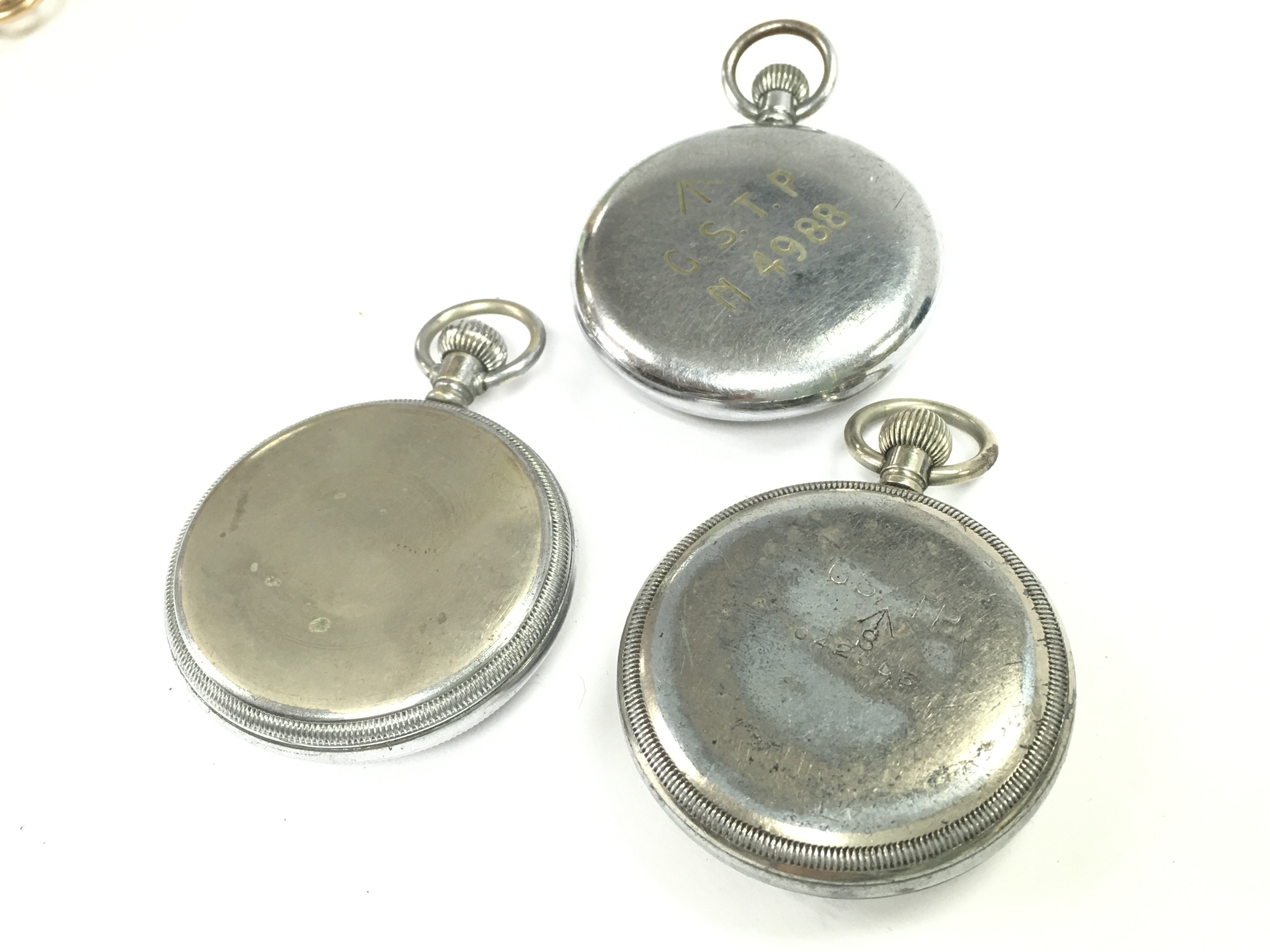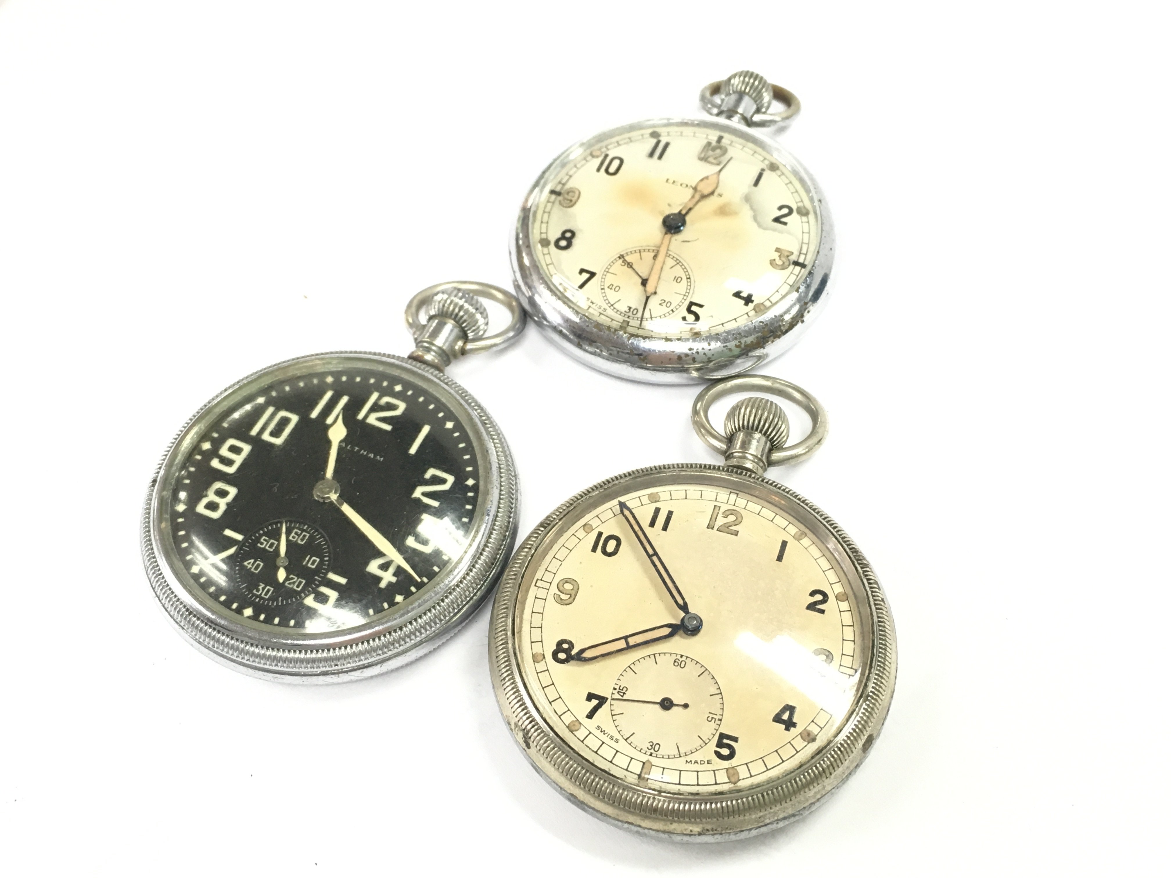 Two military issue pocket watches and a Waltham black dial pocket watch. All seen working. This lot cannot be posted
