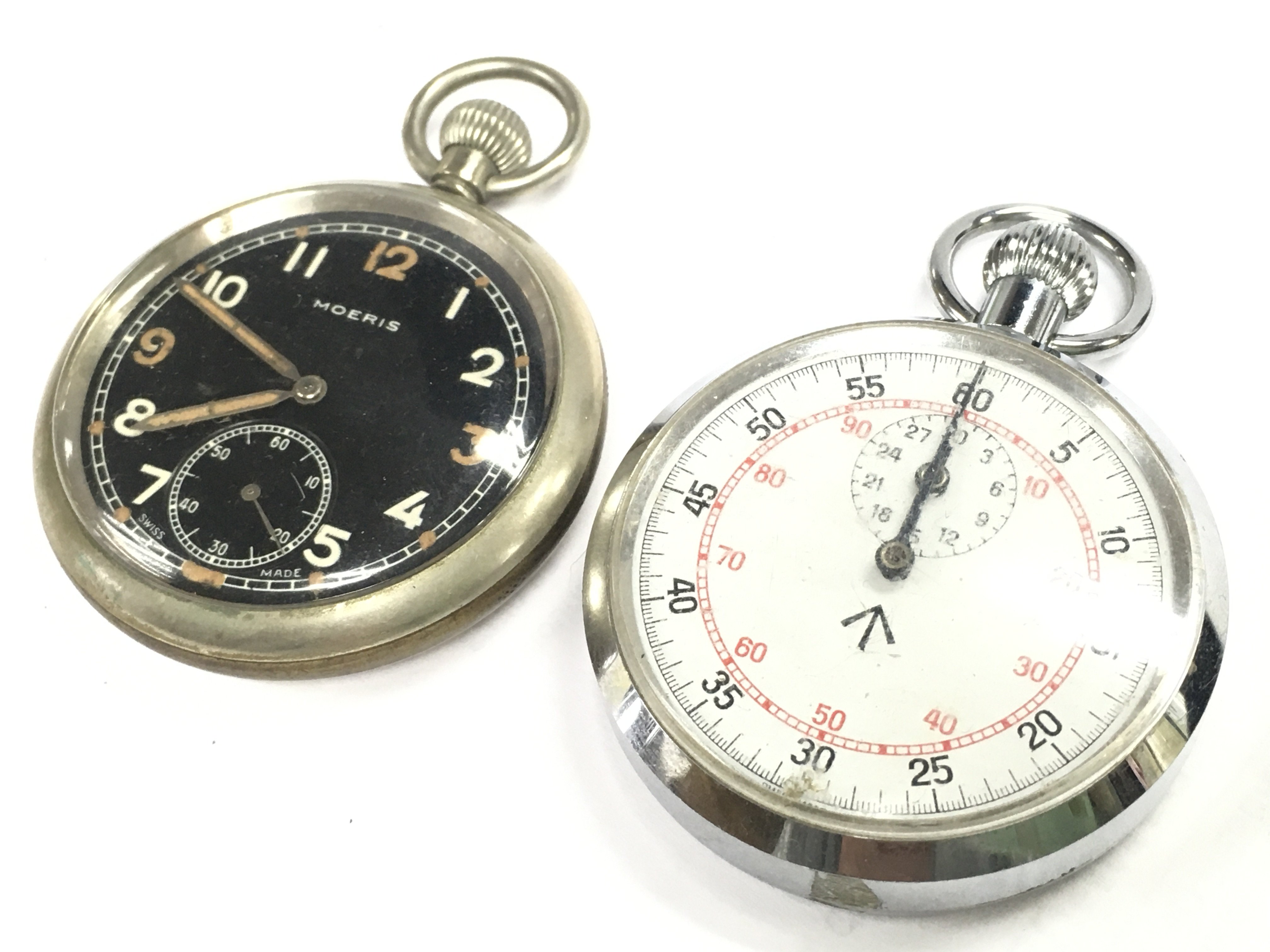 Military issue pocket watch and a Moeris black dial pocket watch. This lot cannot be posted