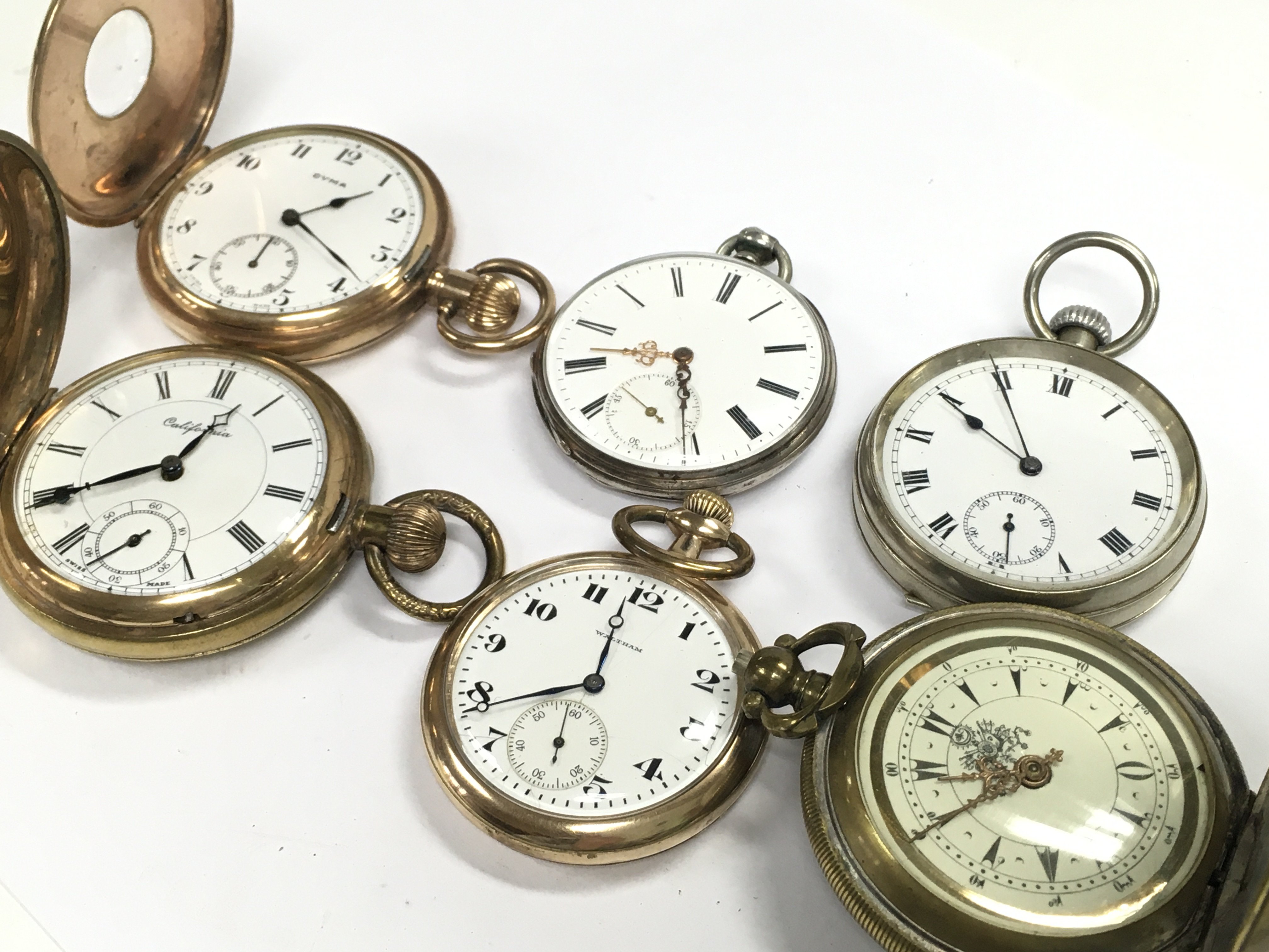 Six various vintage pocket watches including Waltham, California, Cyma etc. this lot cannot be posted