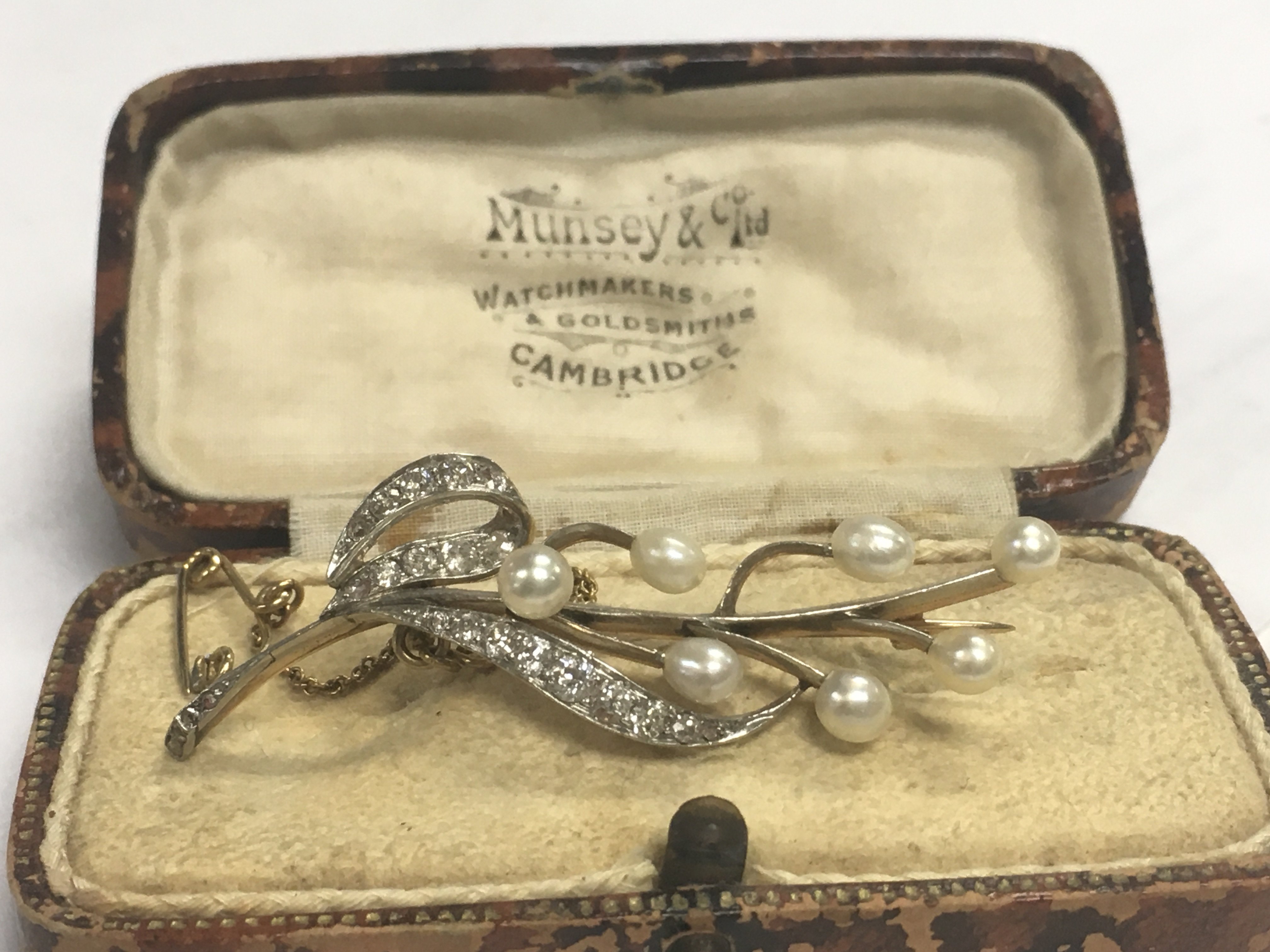 A 9 carat gold Edwardian pearl and diamond brooch, total weight 6.5g postage category A