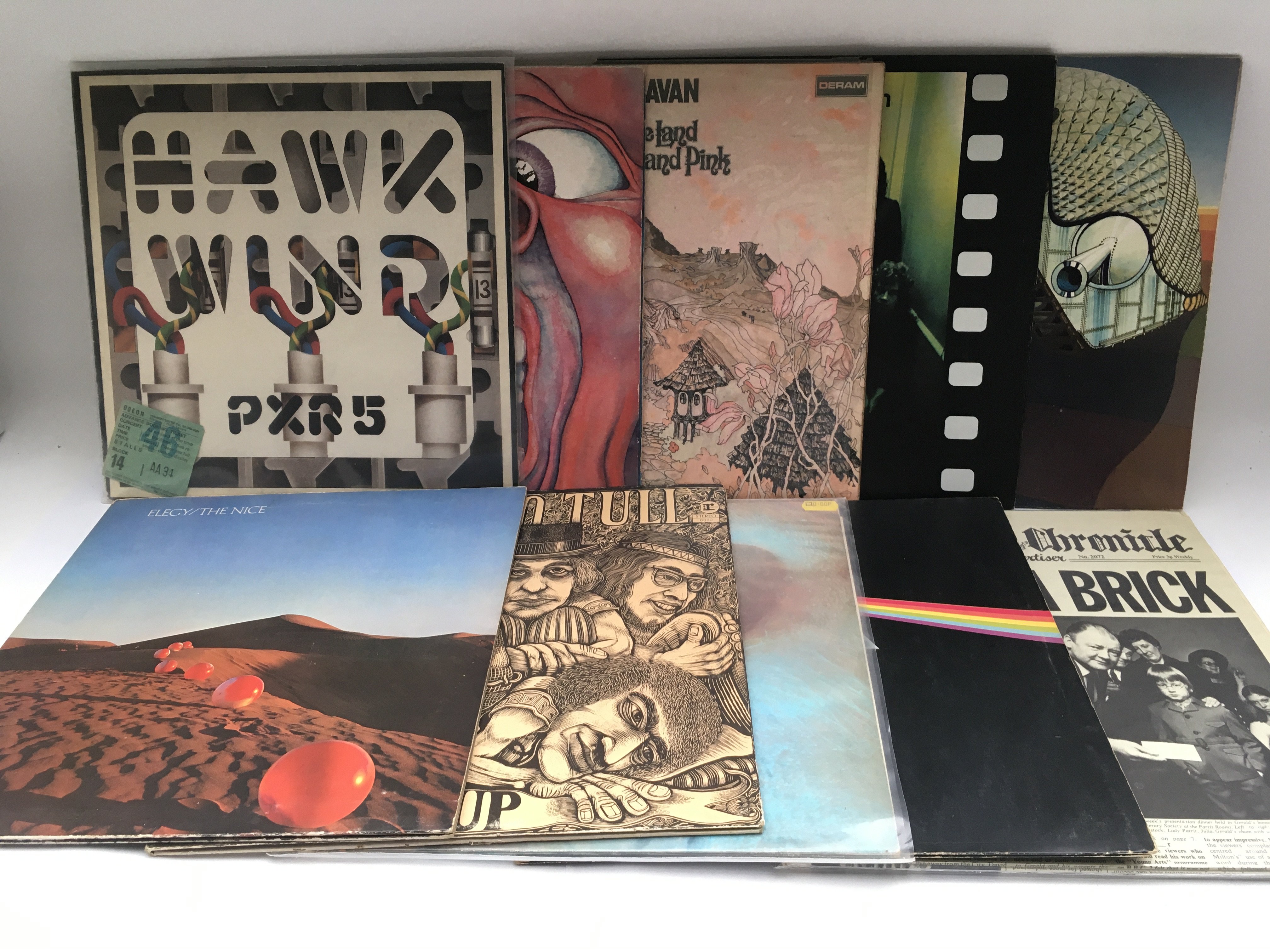Ten prog rock LPs by various artists including King Crimson, Pink Floyd, Caravan and others. Also includes a Hawkwind ticket stub.