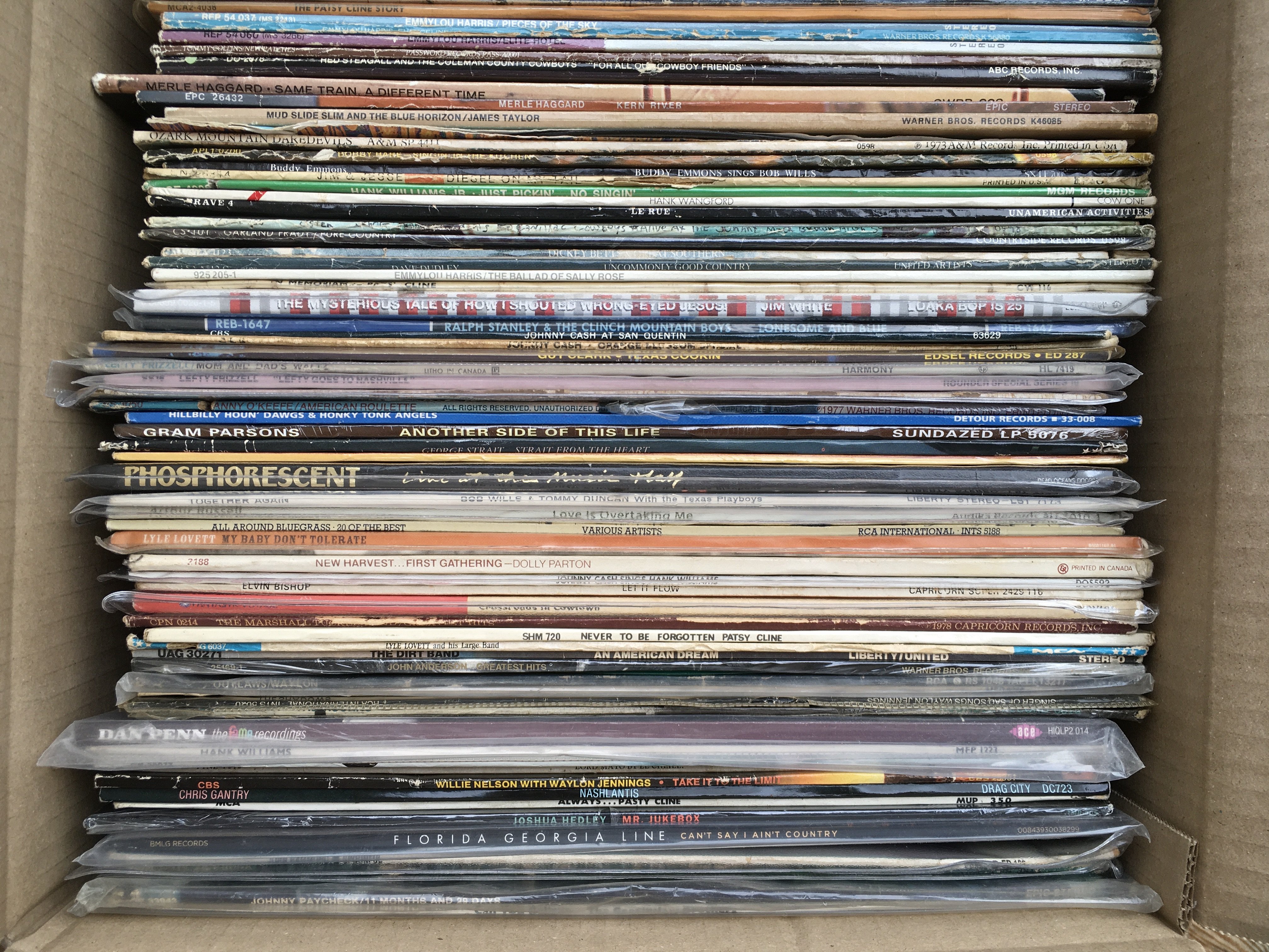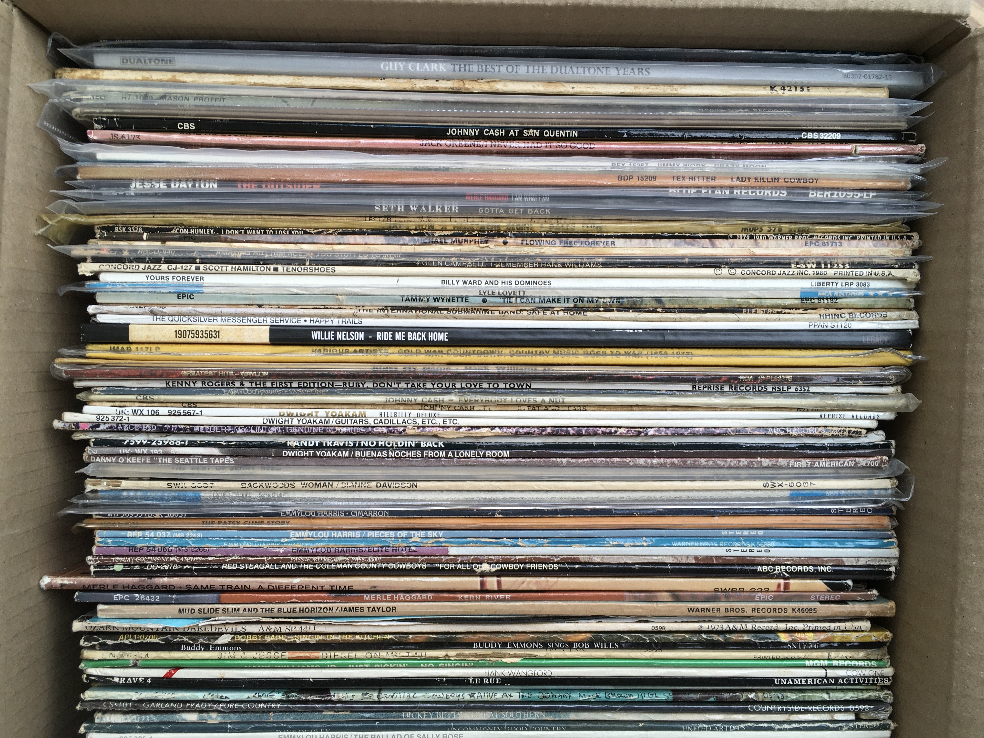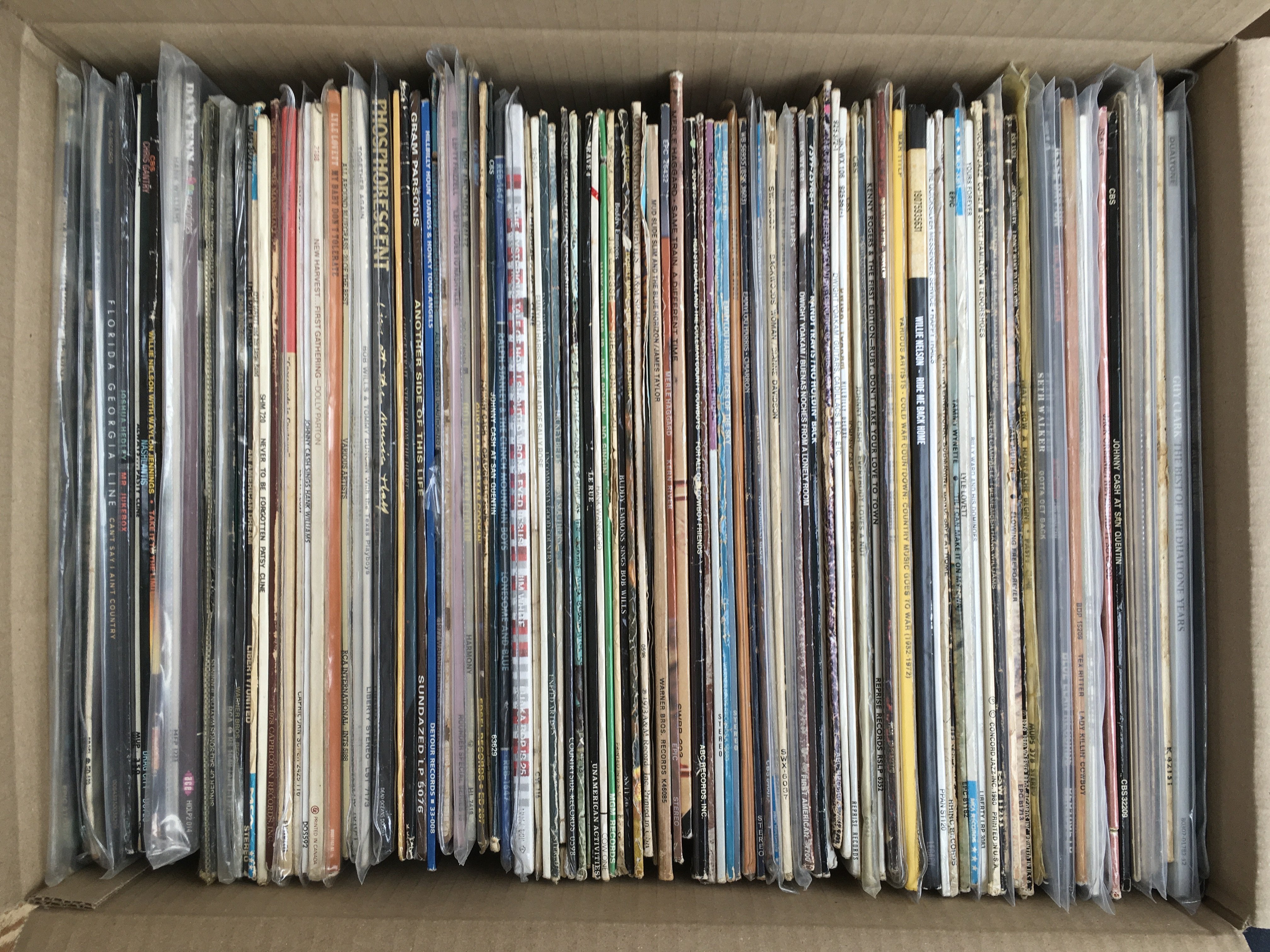 A box of country and western LPs including original and 180g pressings by various artists including Willie Nelson, Johnny Cash, Lyle Lovett and many more.
