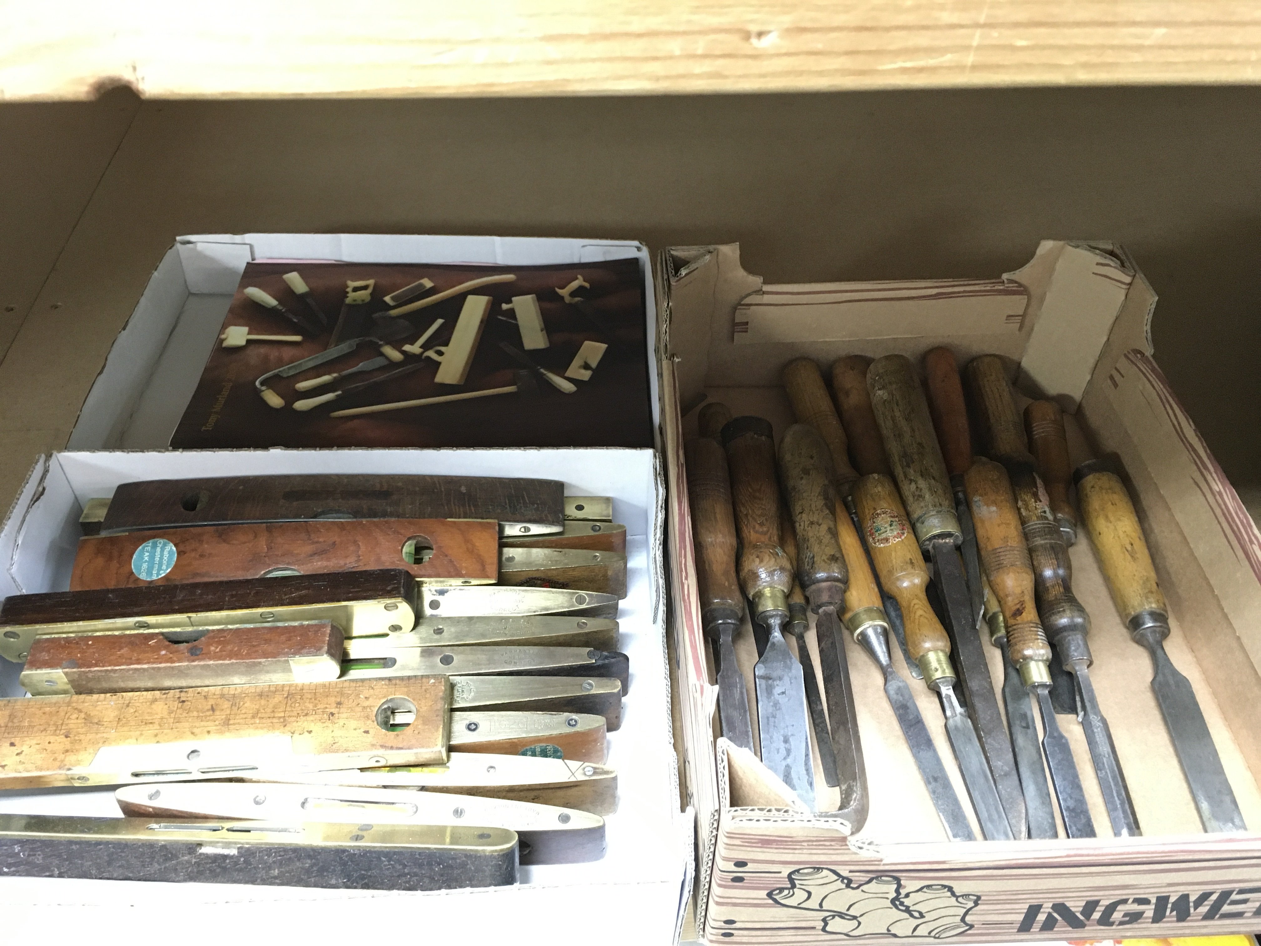 Various vintage woodworking chisels , woodworking auction catalogues, wood and brass spirit levels. This lot cannot be posted
