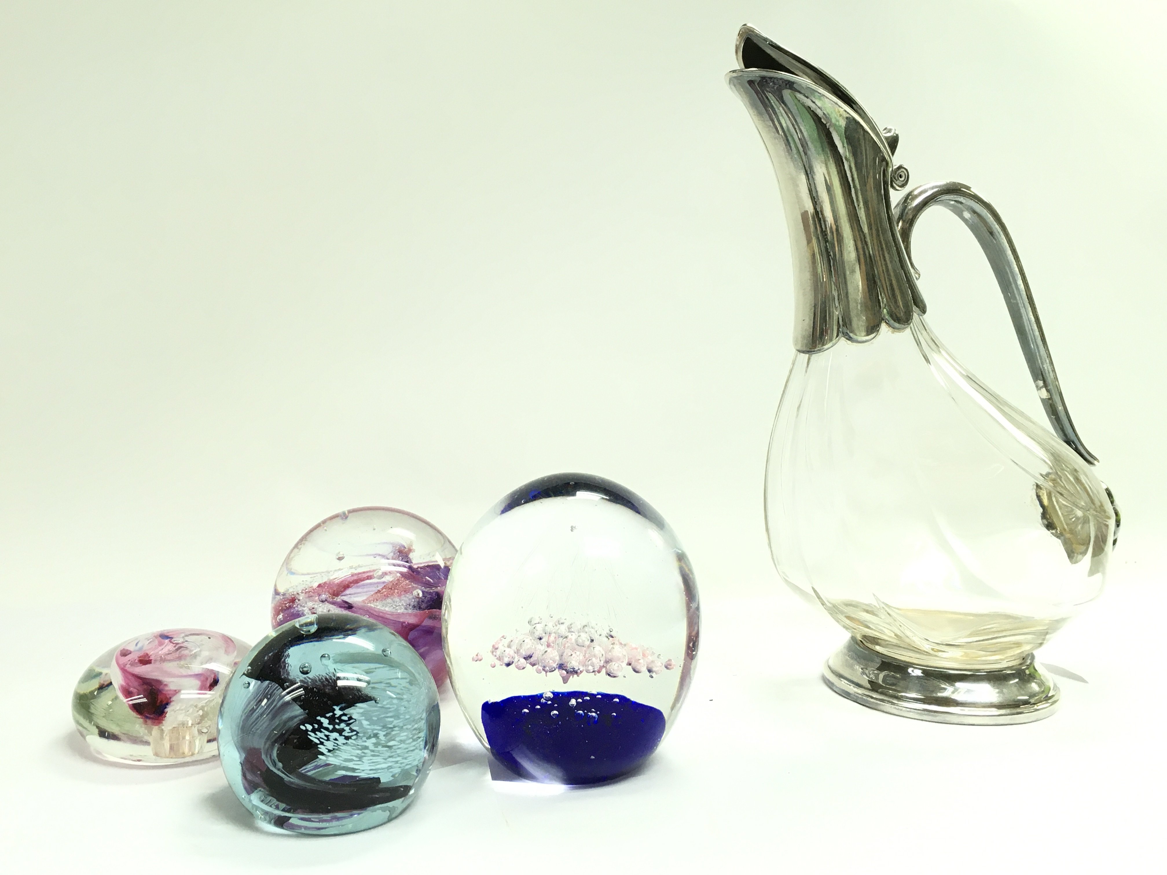 A silver plated duck shaped claret jug and Caithness paper weights and other. This lot cannot be posted
