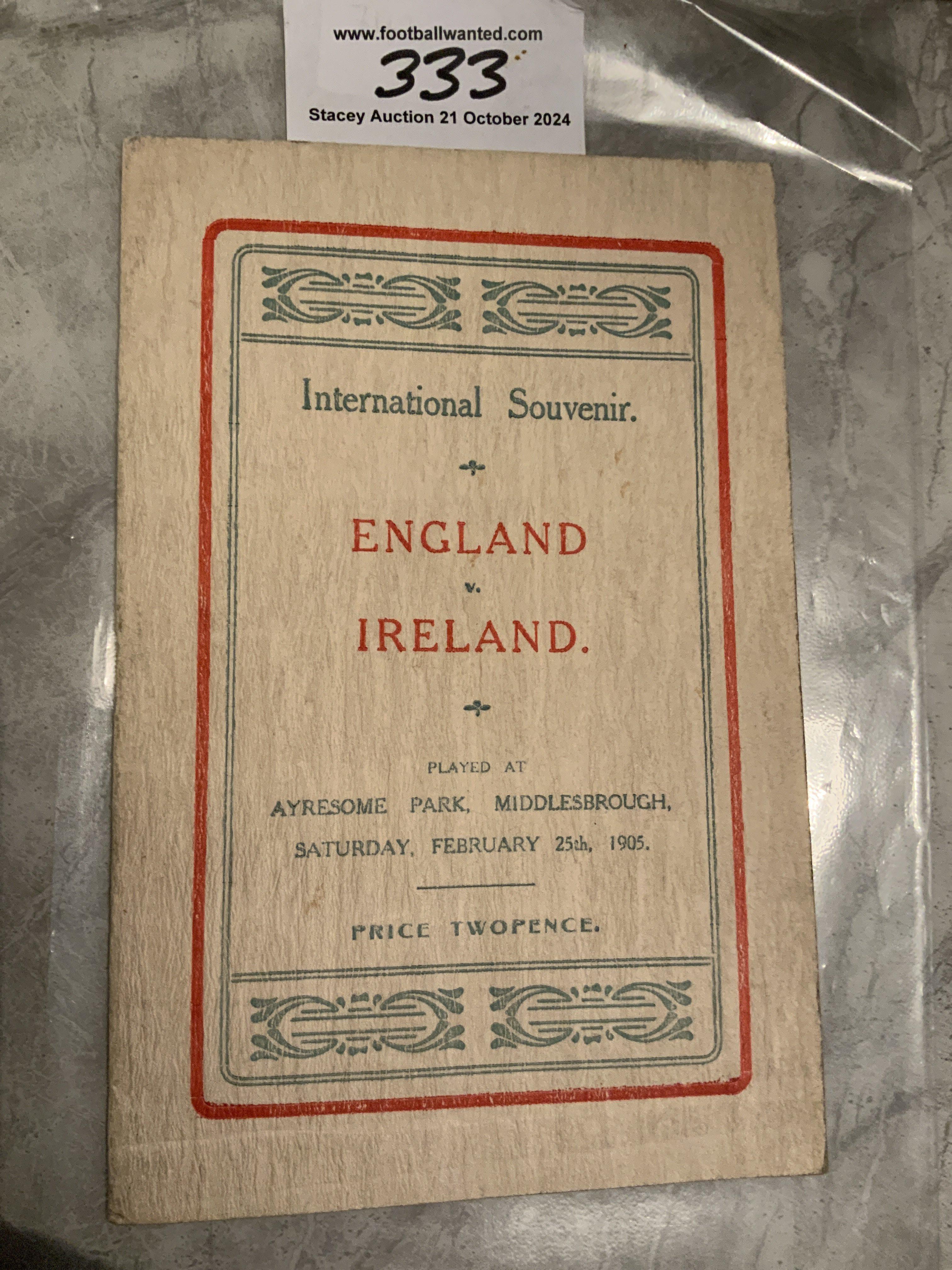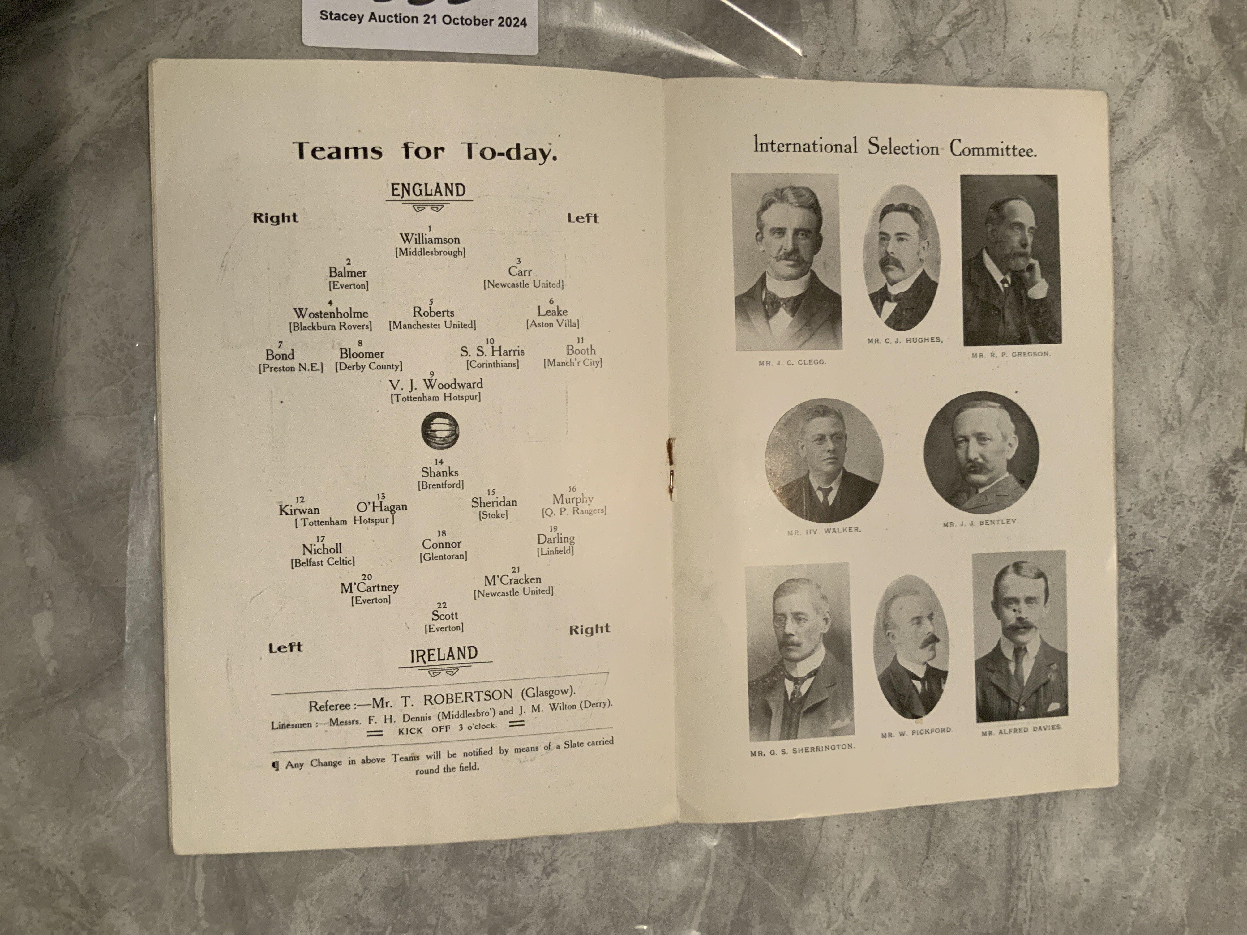 1905 England v Ireland Football Programme: Full international played at Ayresome Park Middlesbrough. Excellent condition rare programme with no team changes.
