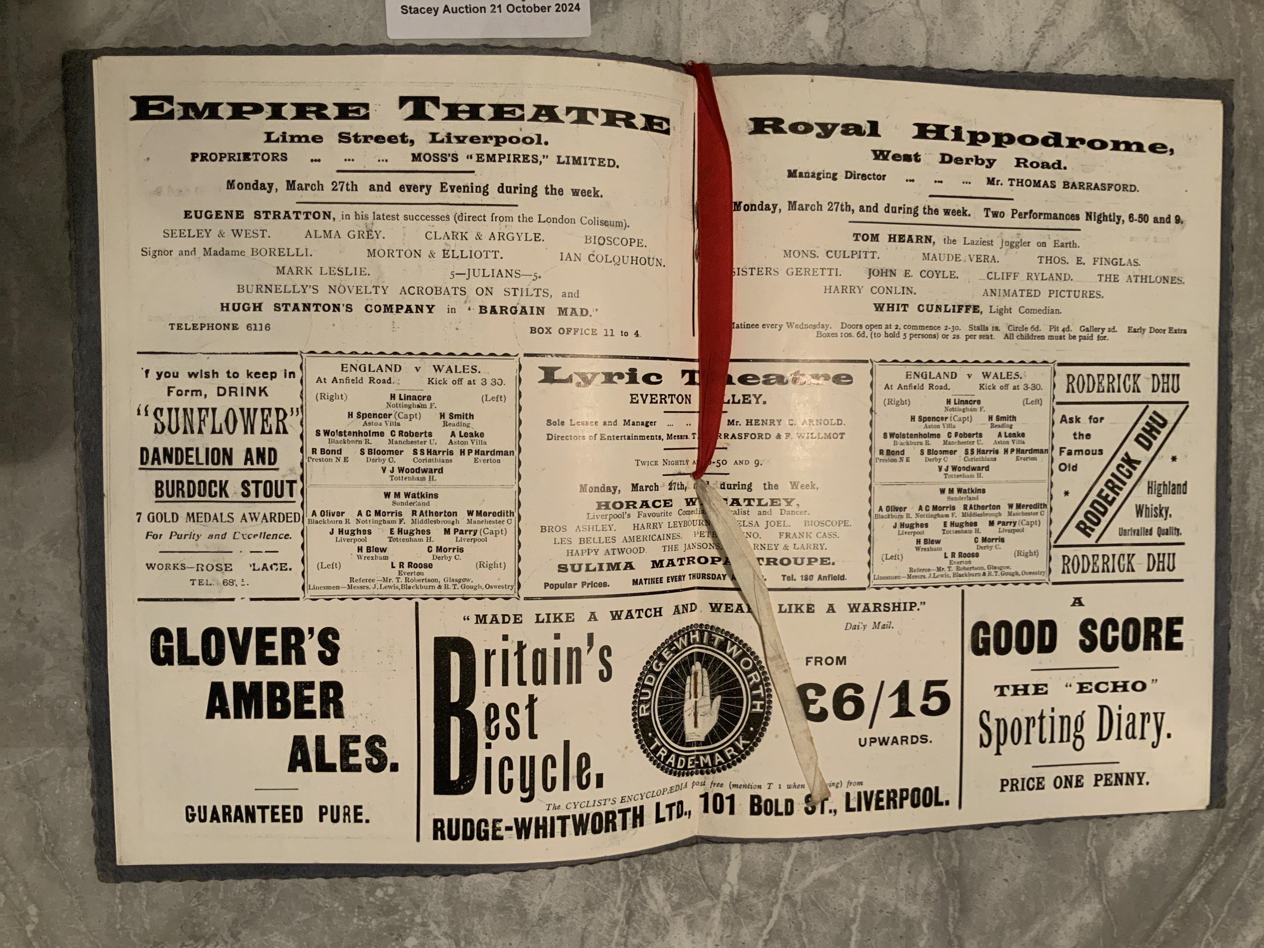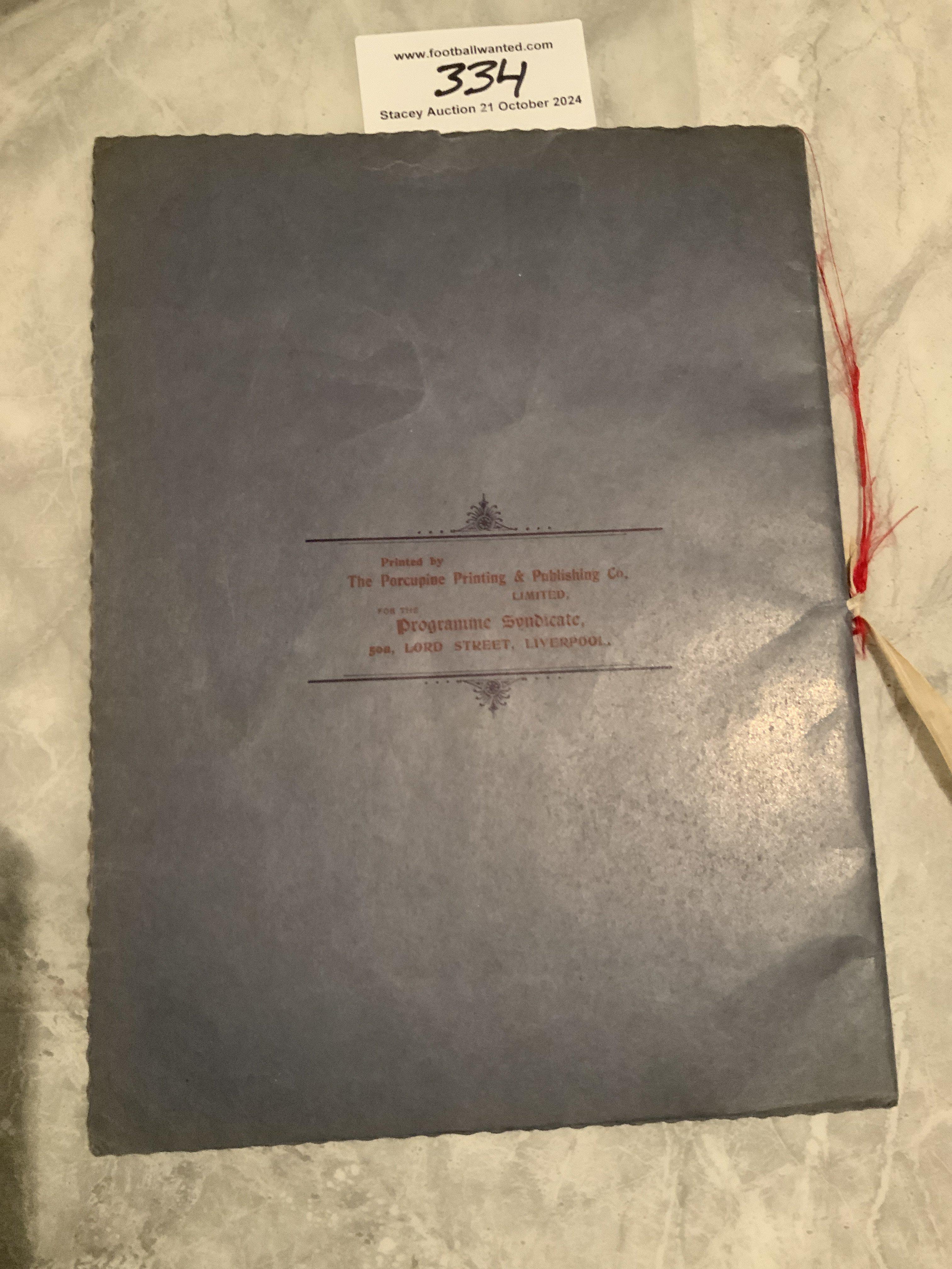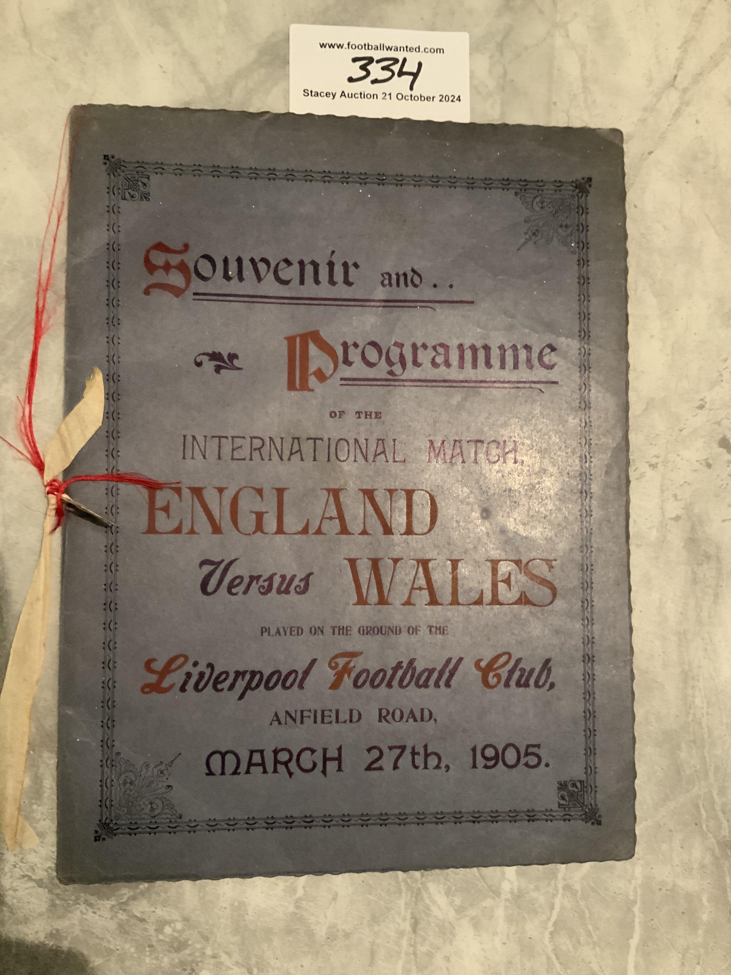1905 England v Wales VIP Football Programme: Full International played at Anfield Liverpool. Excellent condition with white and red ribbon. VIP cover. Stunning programme with no team changes.