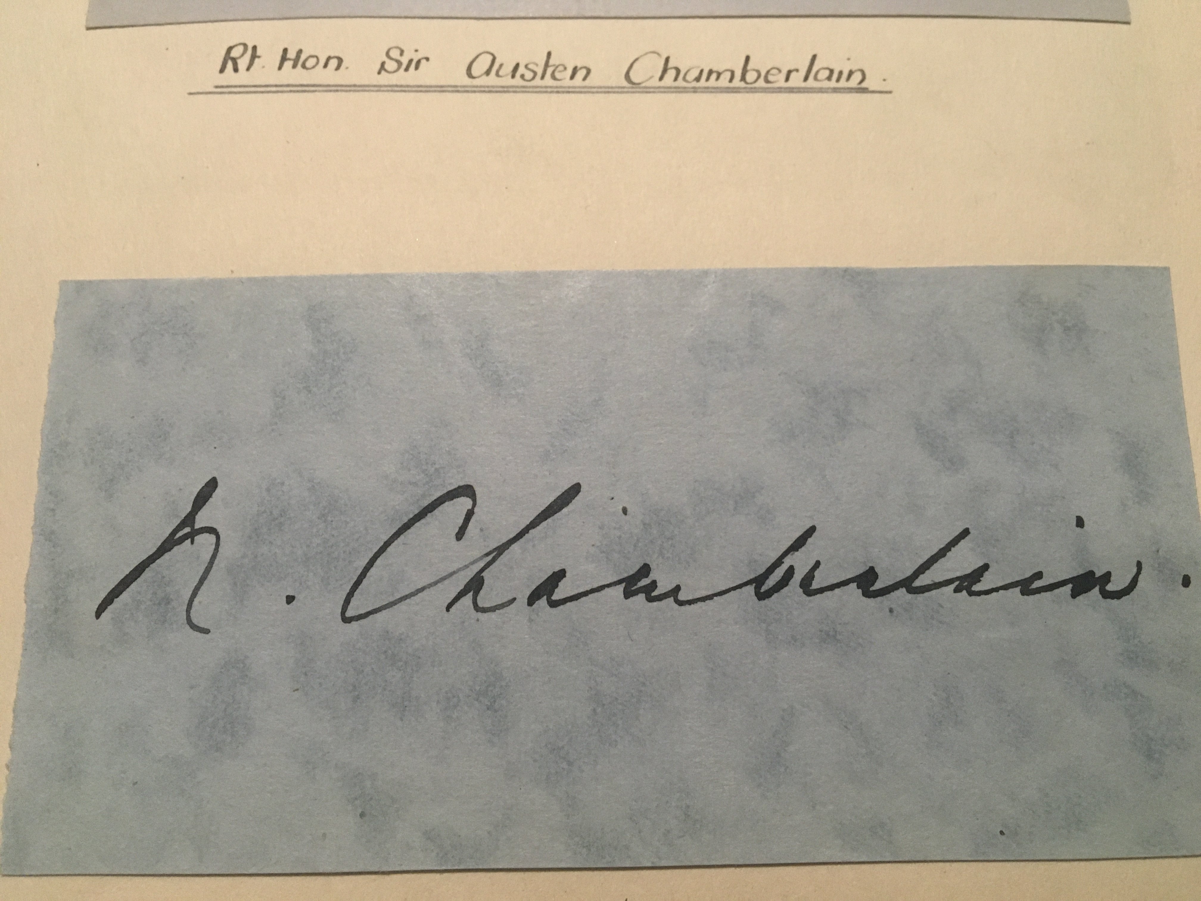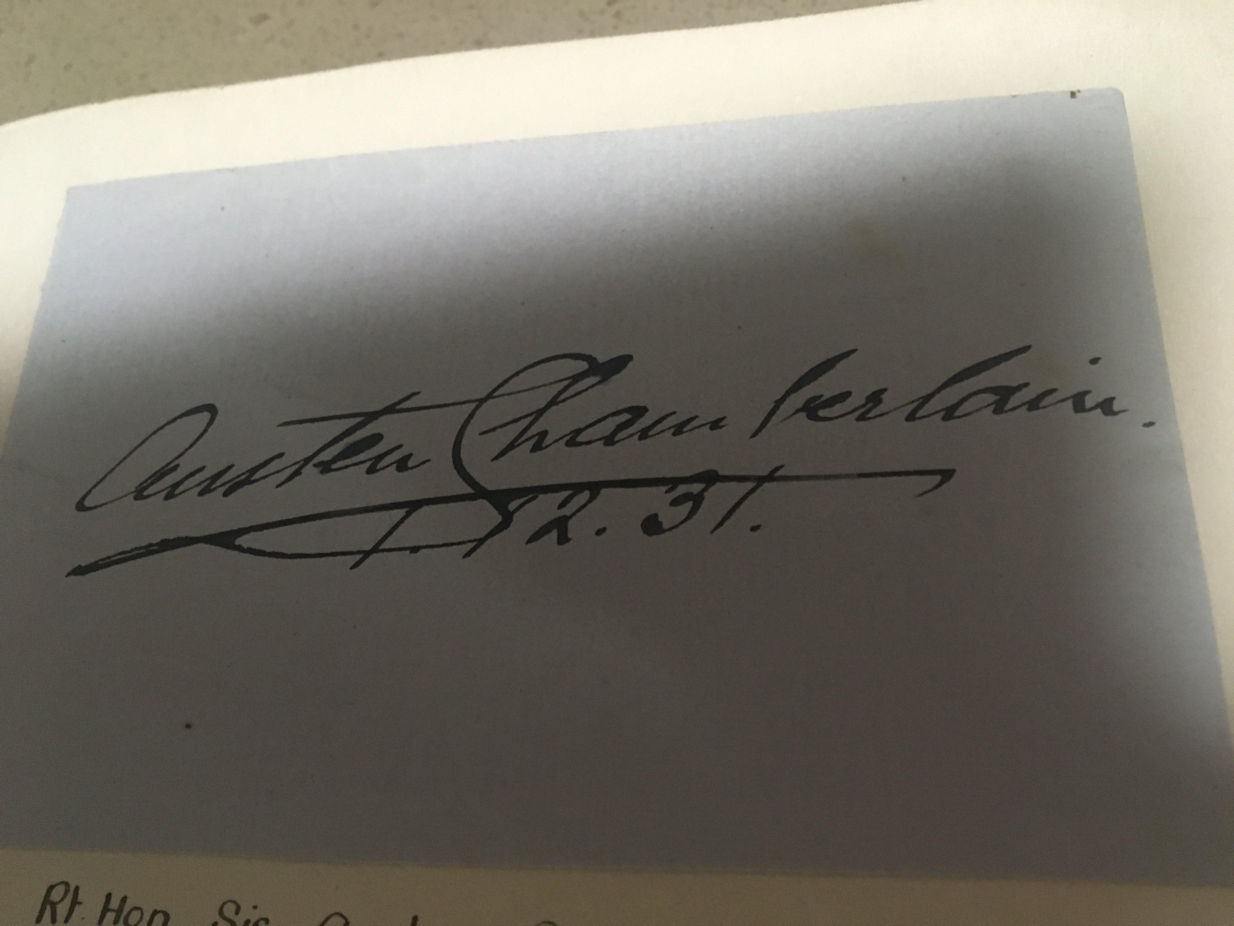 Guaranteed to be Authentic Autograph Signatures. Important British Politicians David Lloyd George (1863-1945) British Prime Minister signed on House of Commans Card, Nevil Chamberlain (1869-1940) British Prime Minister announced war against Nazi Germany 1939. Also his Brother Sir Austen Chamberlain 1863-1937 Twice Chancellor of the Exchequer. Also W T Cosgrave (1880-1965) considered to be Irish Free state first President 1922-32. (4)
