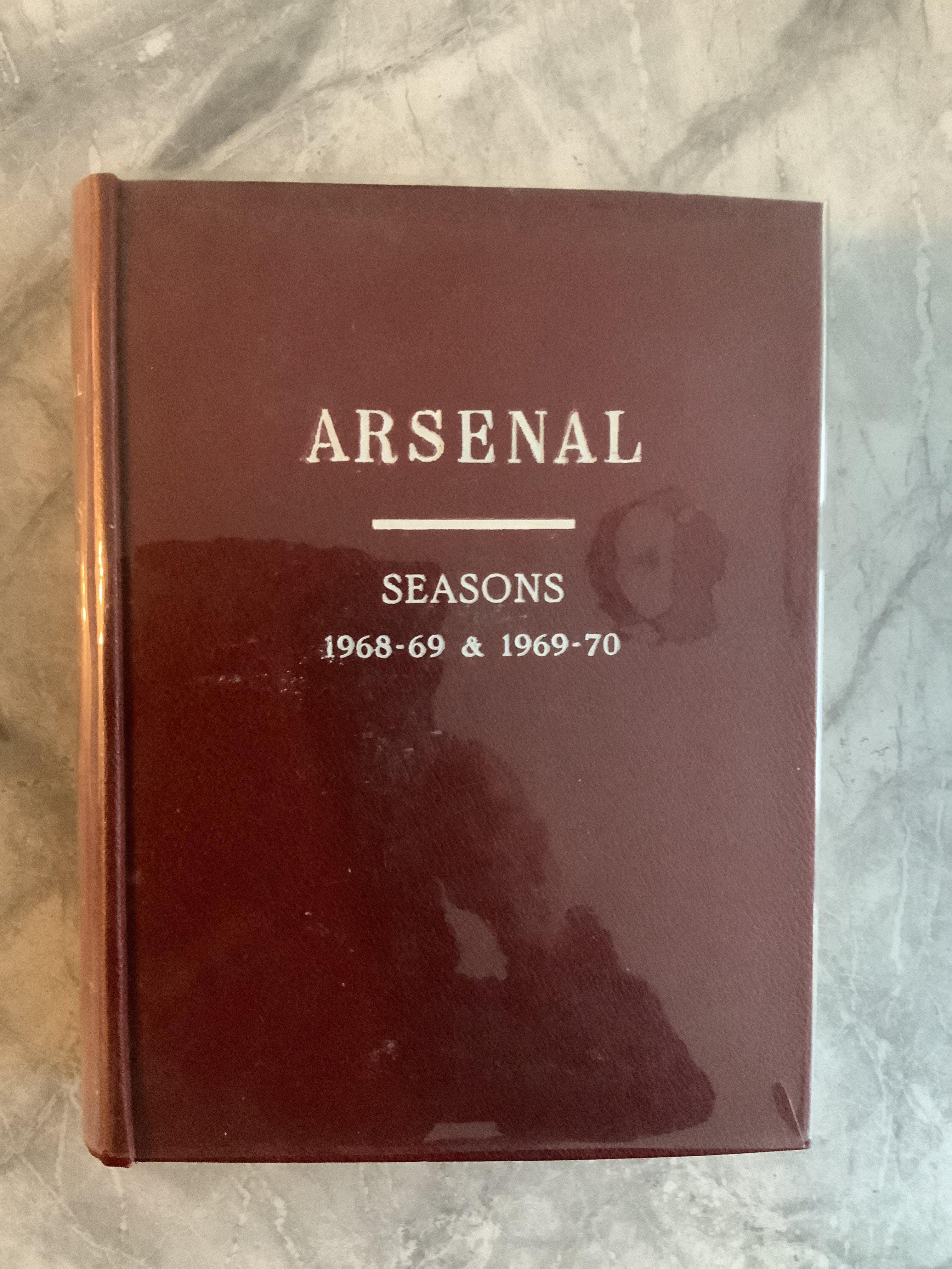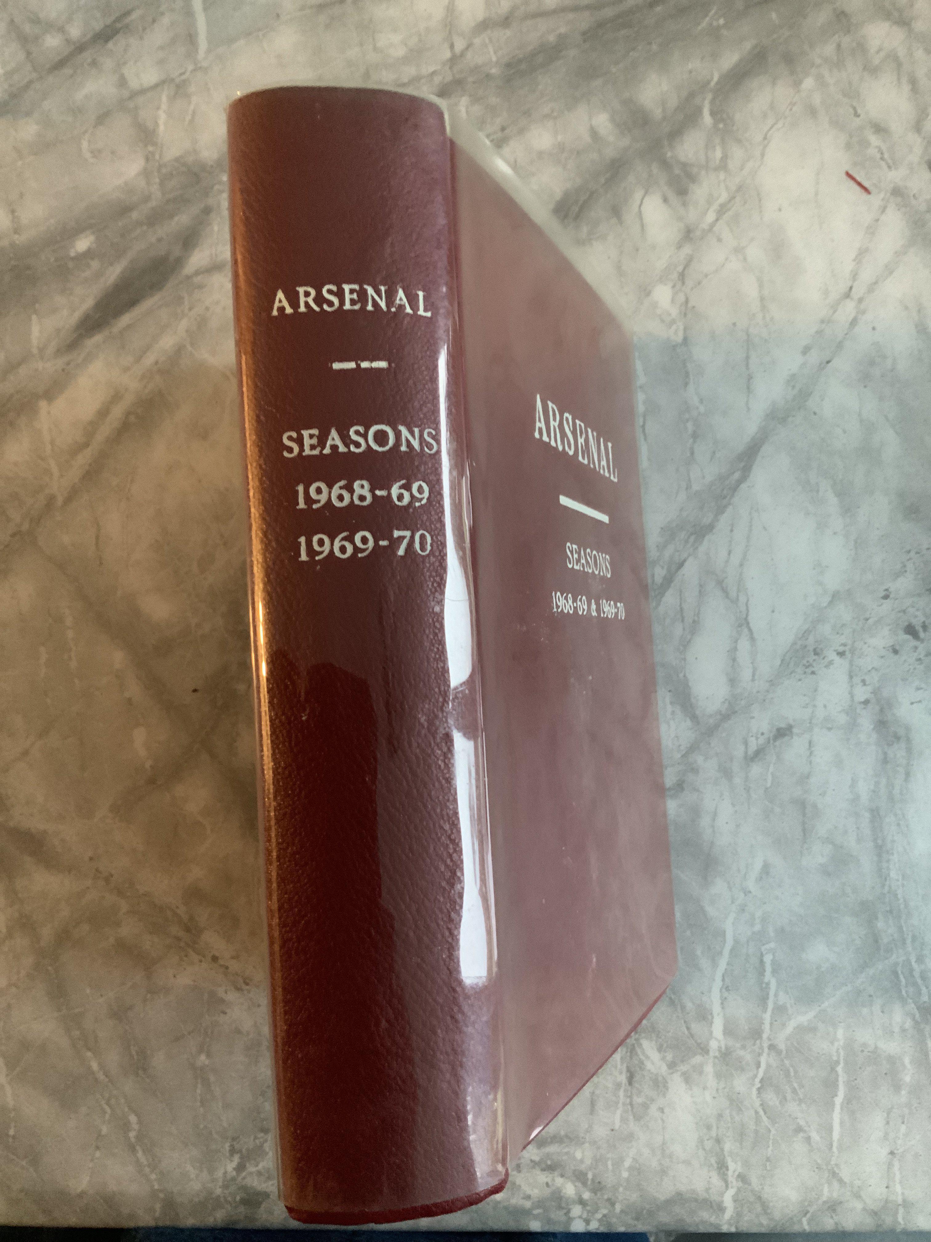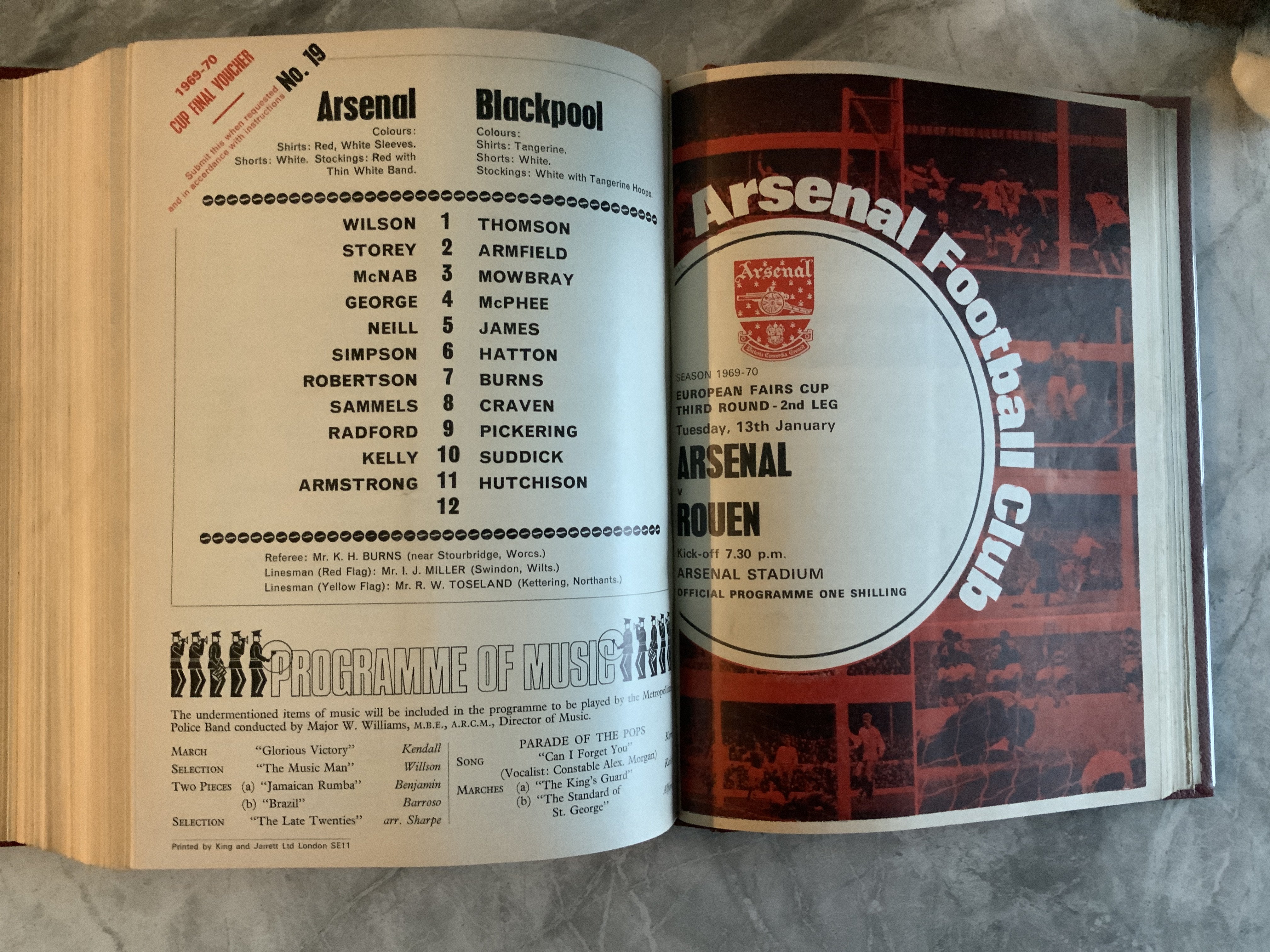 Arsenal 68/69 + 69/70 Bound Volume Of Football Programmes: Heavy top quality thick bound volume as covers two seasons in one volume. Consists of 1st team matches which included the great 69/70 Fairs Cup run. All programmes appear unwritten and with tokens intact. (1)