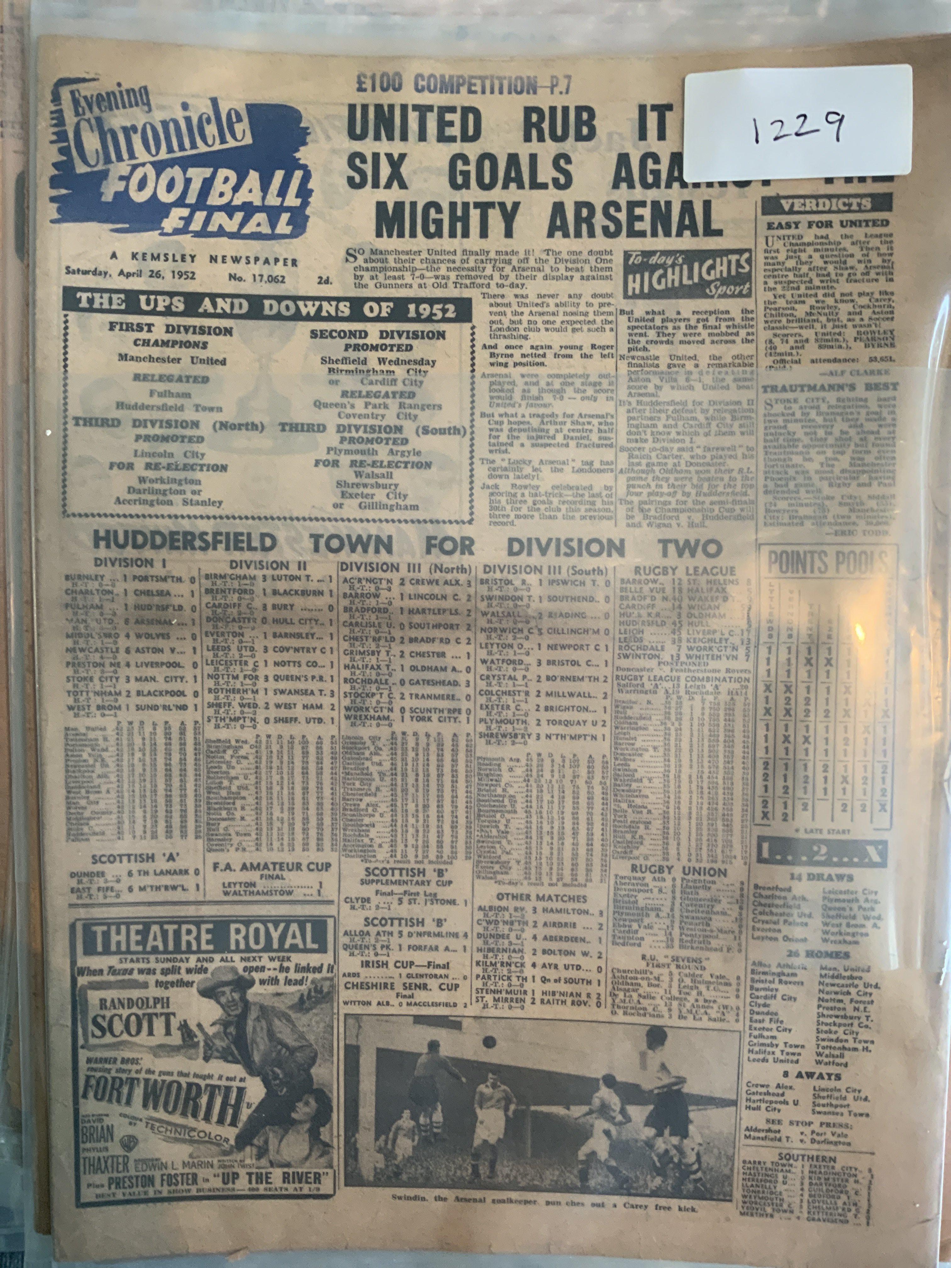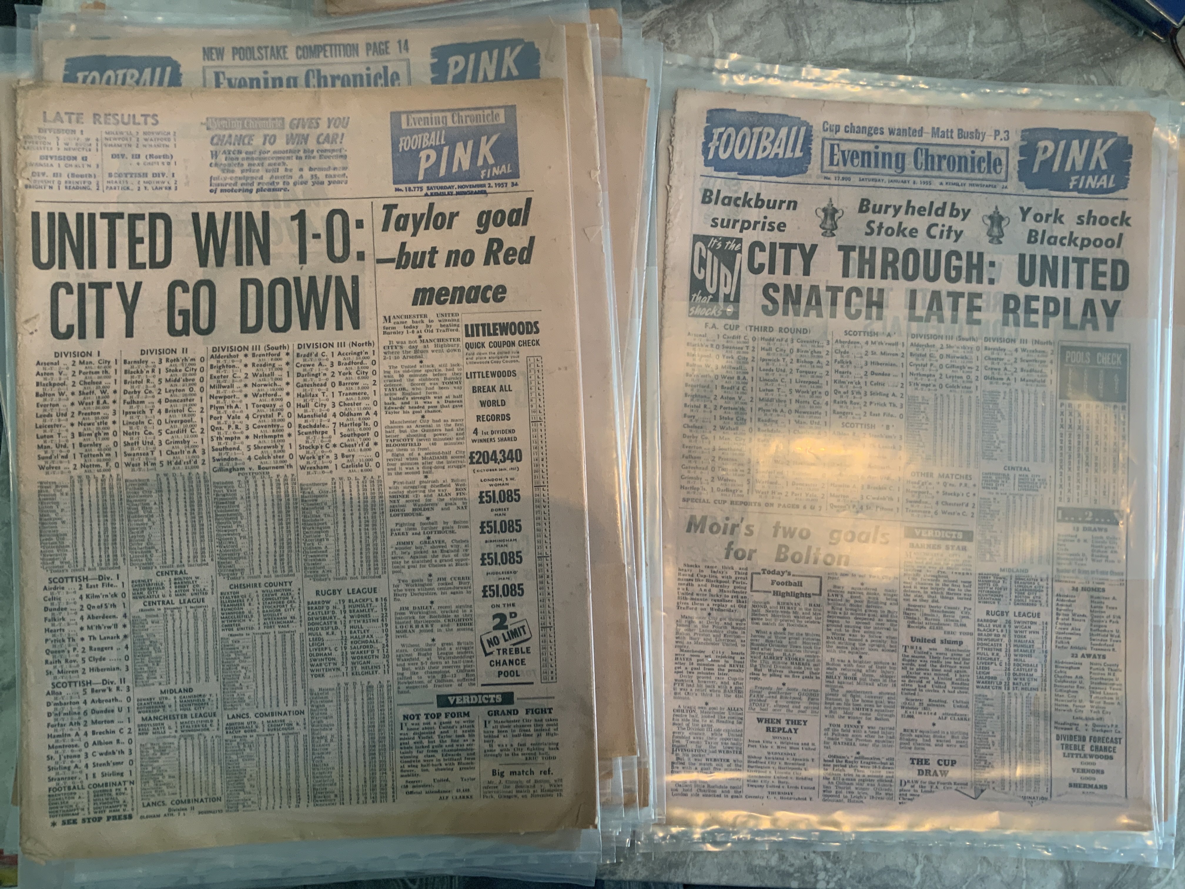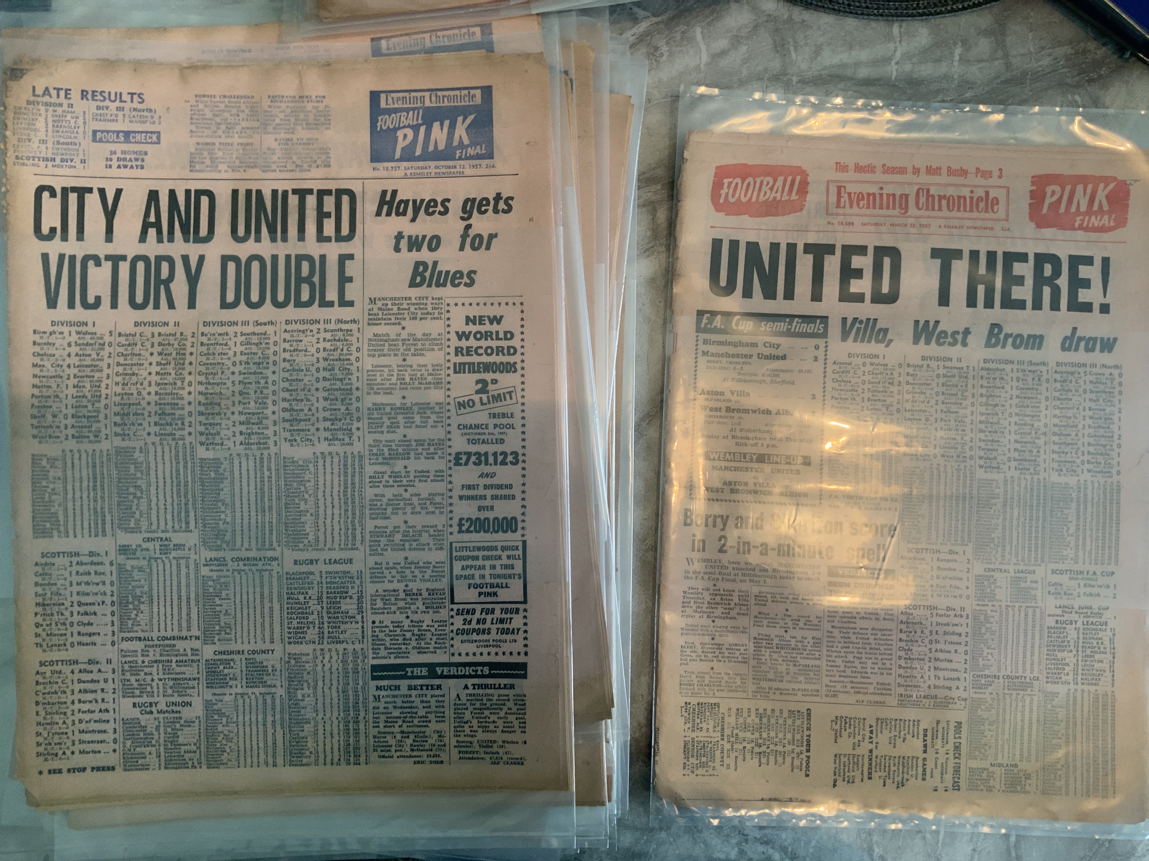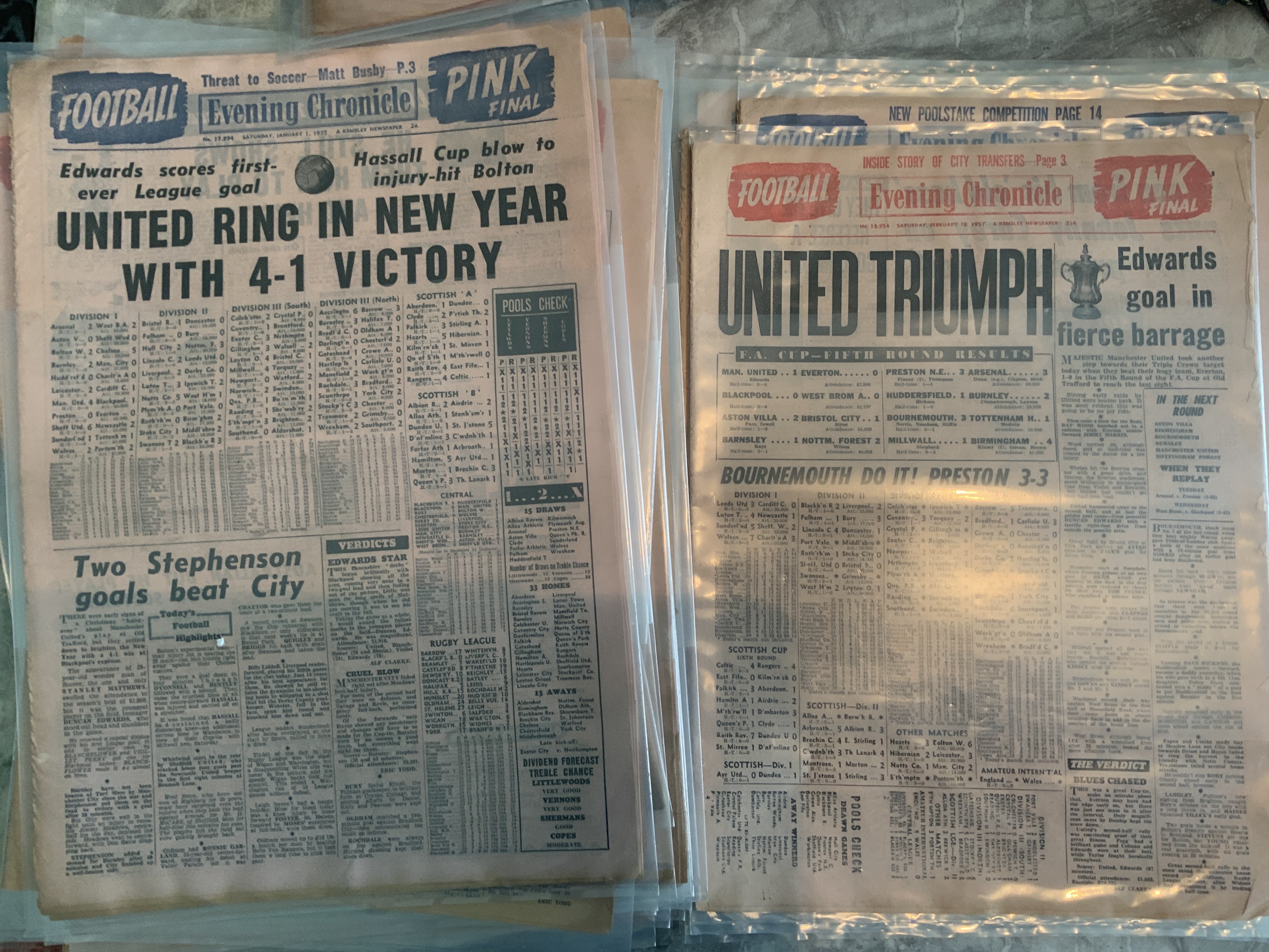 Manchester United 1950s Football Newspapers: Hard to find full Evening Chronicle newspapers which also covered Manchester City. Each one kept in plastic wallet. This paper was known as the Football Pink. Starting with 26 4 1952 when a 6-1 win over Arsenal made Man Utd champions. The rest look 1954 to 1957. Excellent condition. (60)
