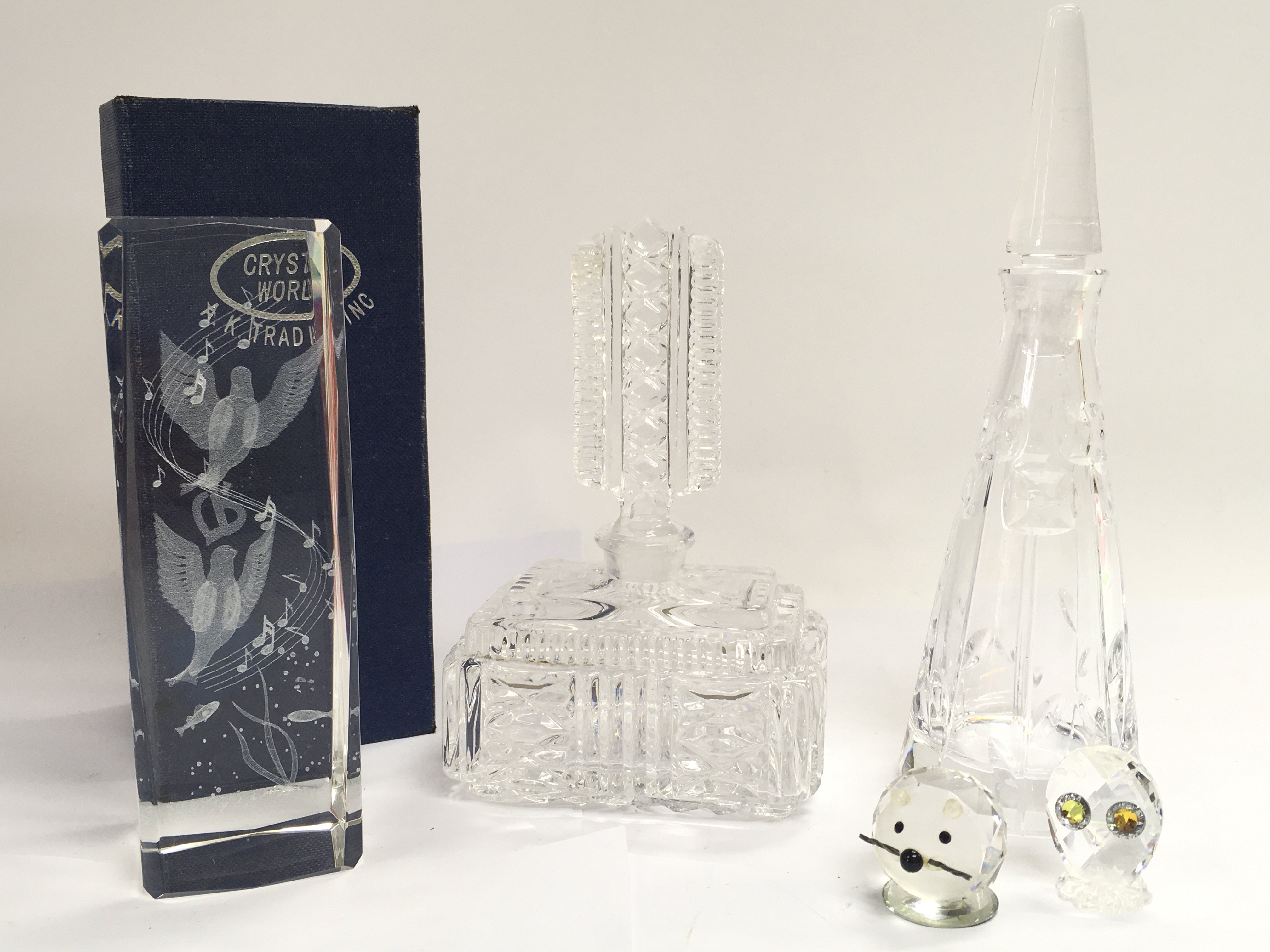Cut glass scent bottles including Stuart , small figures and a 3D Crystal ornament. This lot cannot be posted