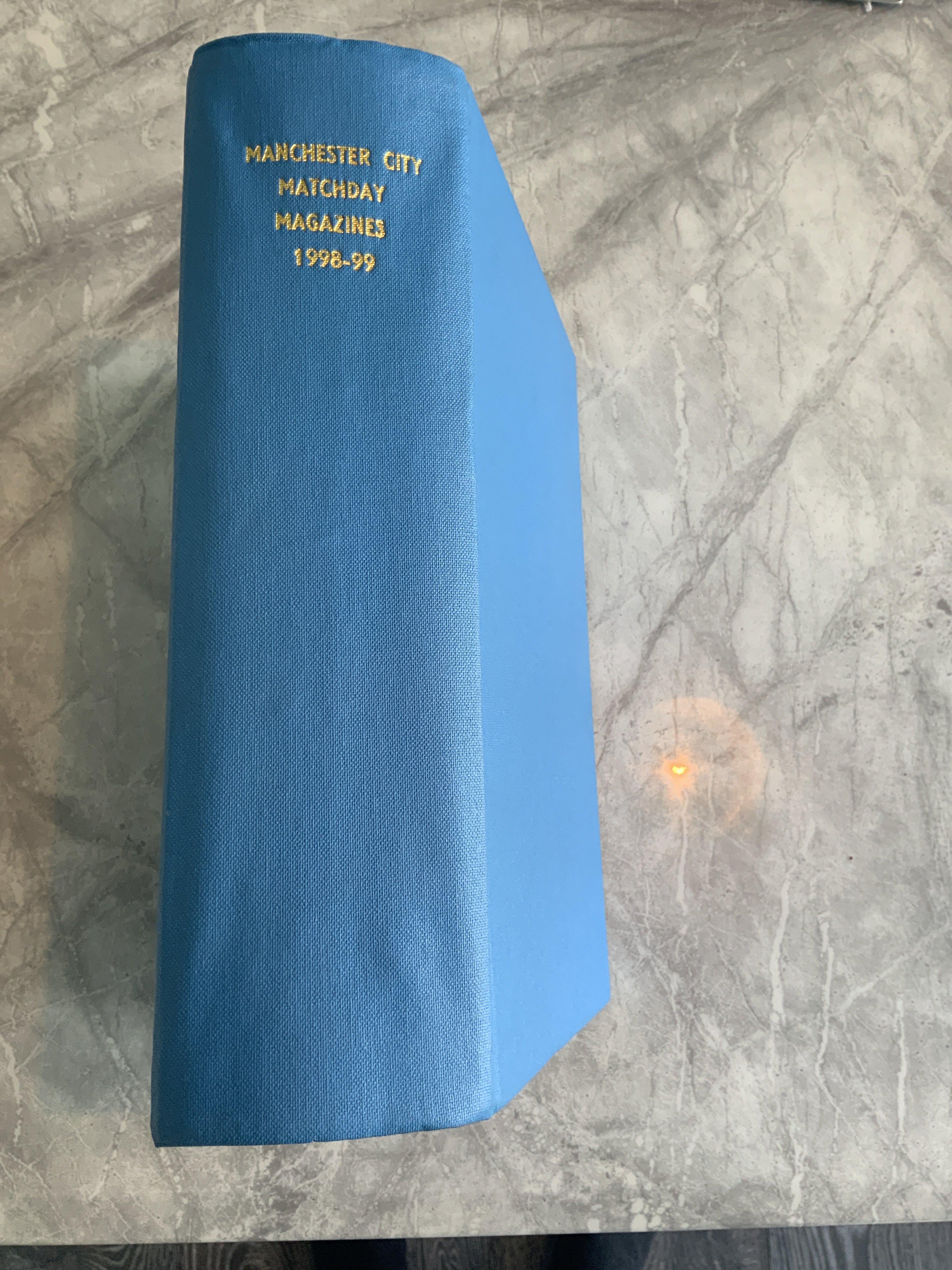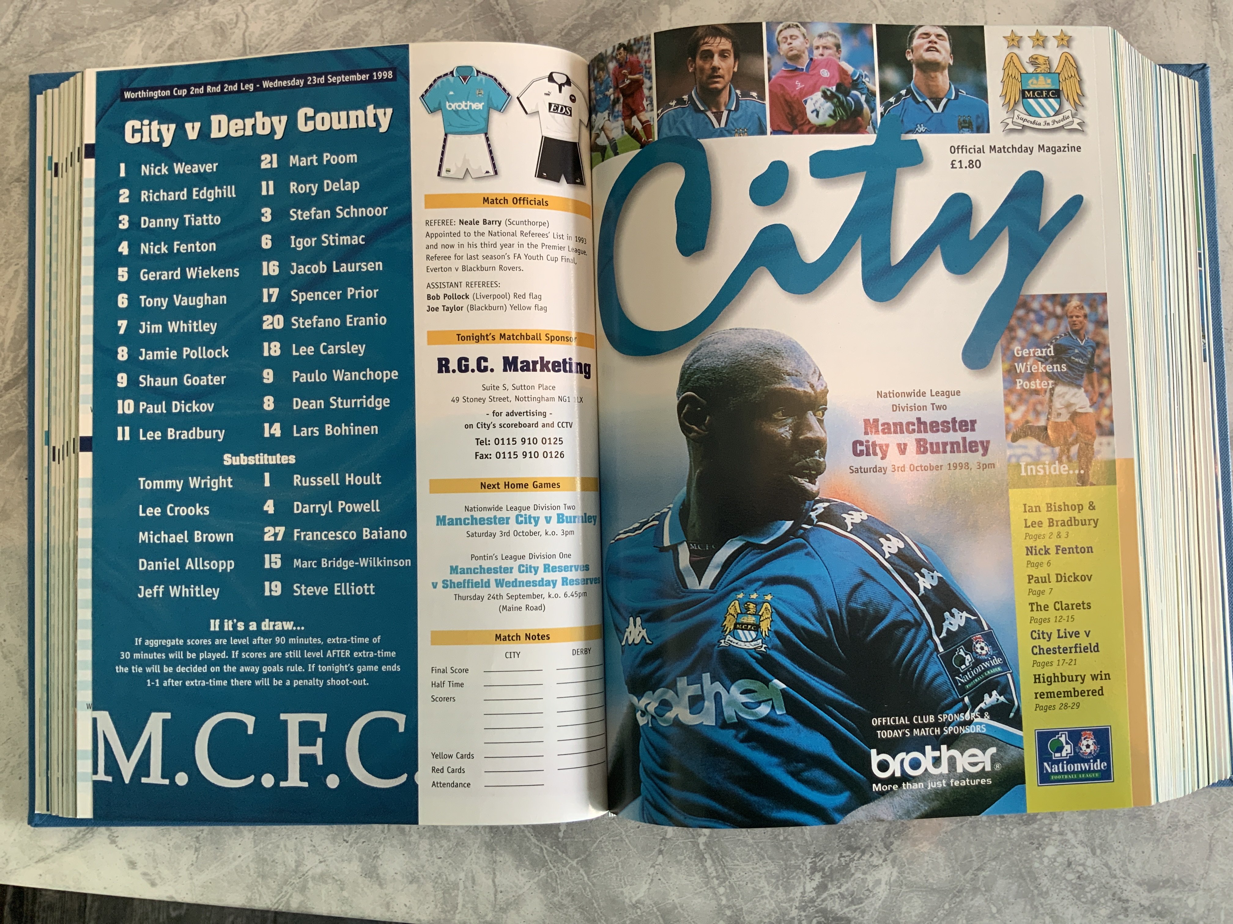 Manchester City 98/99 Bound Volume Of Football Programmes: Heavy volume in blue boards with gold lettering to spine. Appears to be complete of first team matches. Instructions to sell.