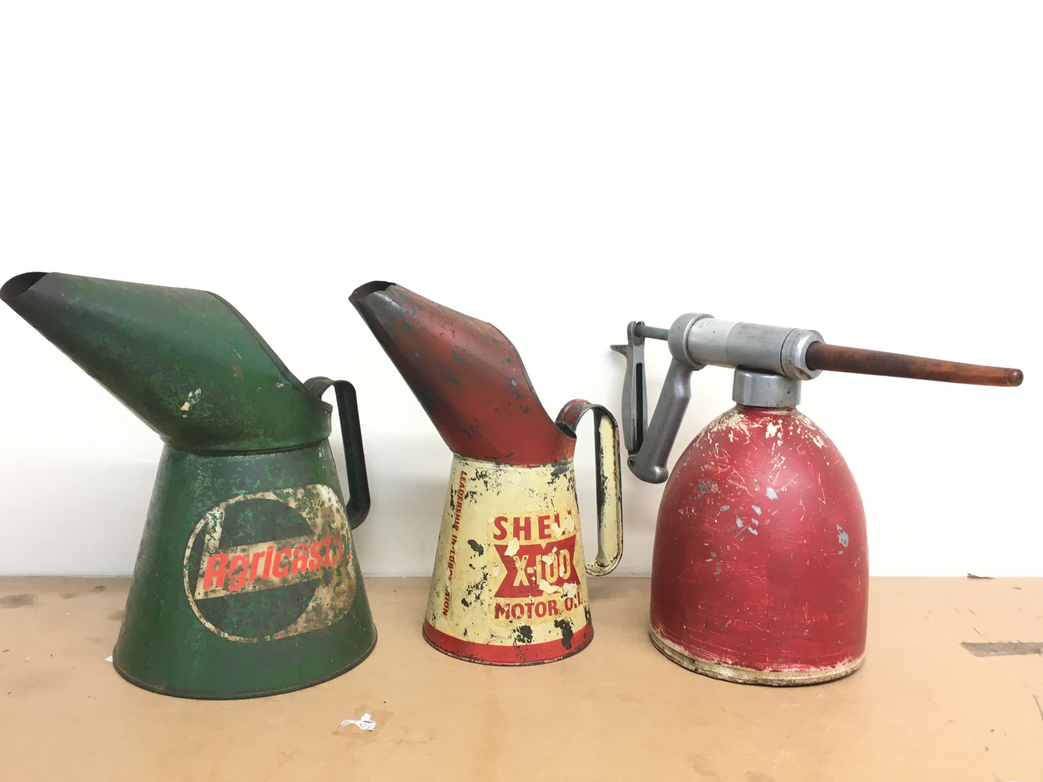 A Vintage shell cylinder lube squirted and two vintage oil jugs , shell x100 and agricastrol. Postage category C