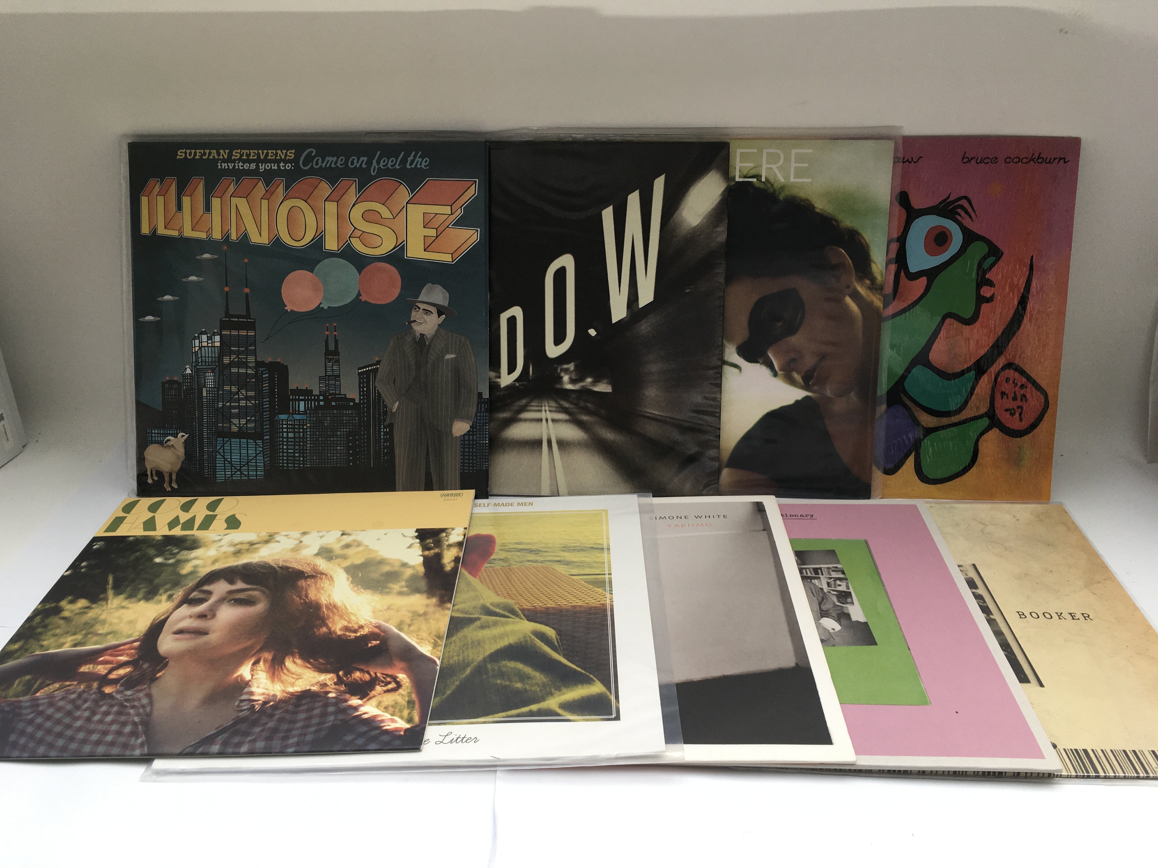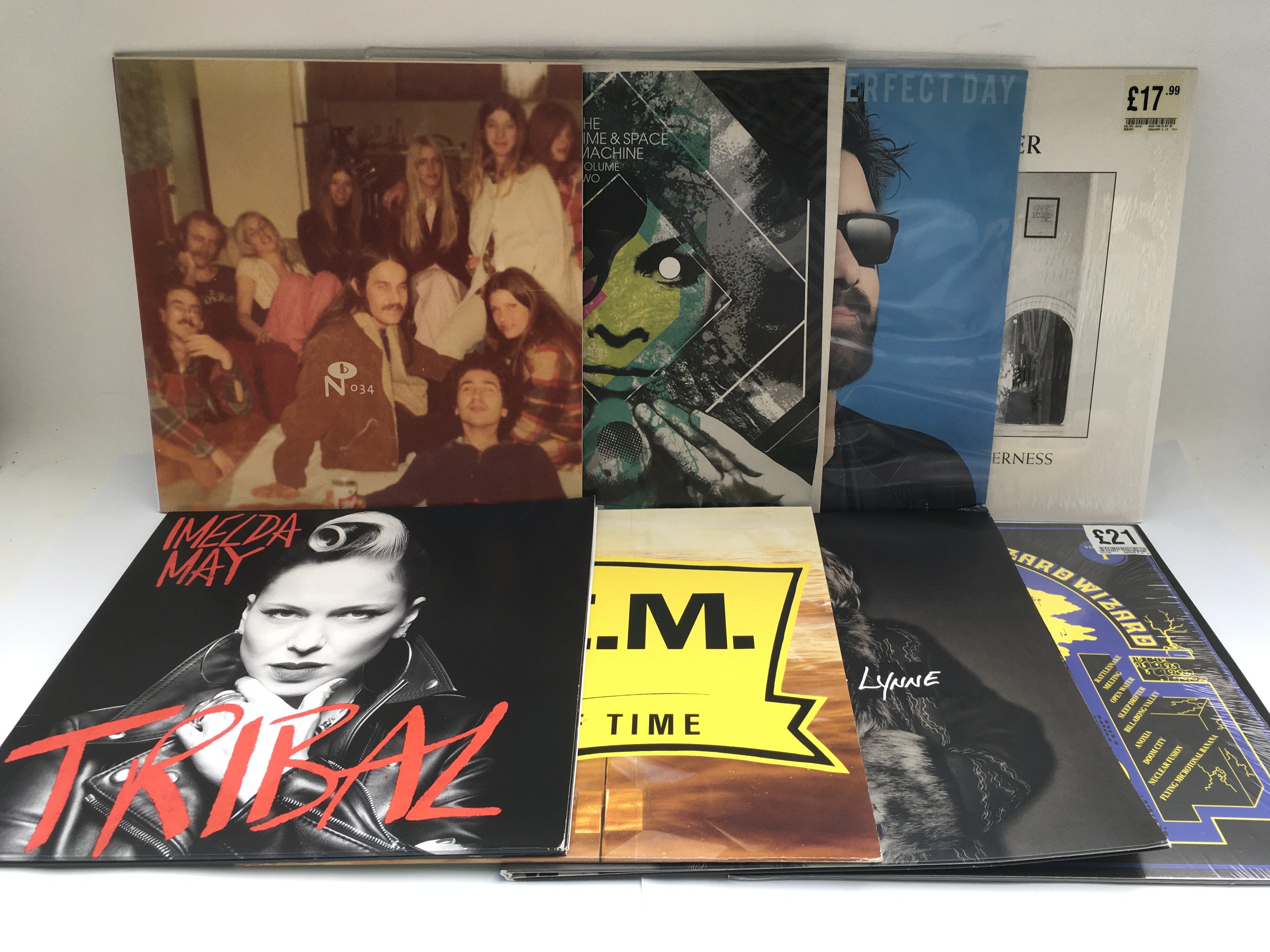 Two bags containing 17 indie rock and pop LPs by various artists including REM, Imelda May, Sufjan Stevens and others. Includes original and 180g pressings.