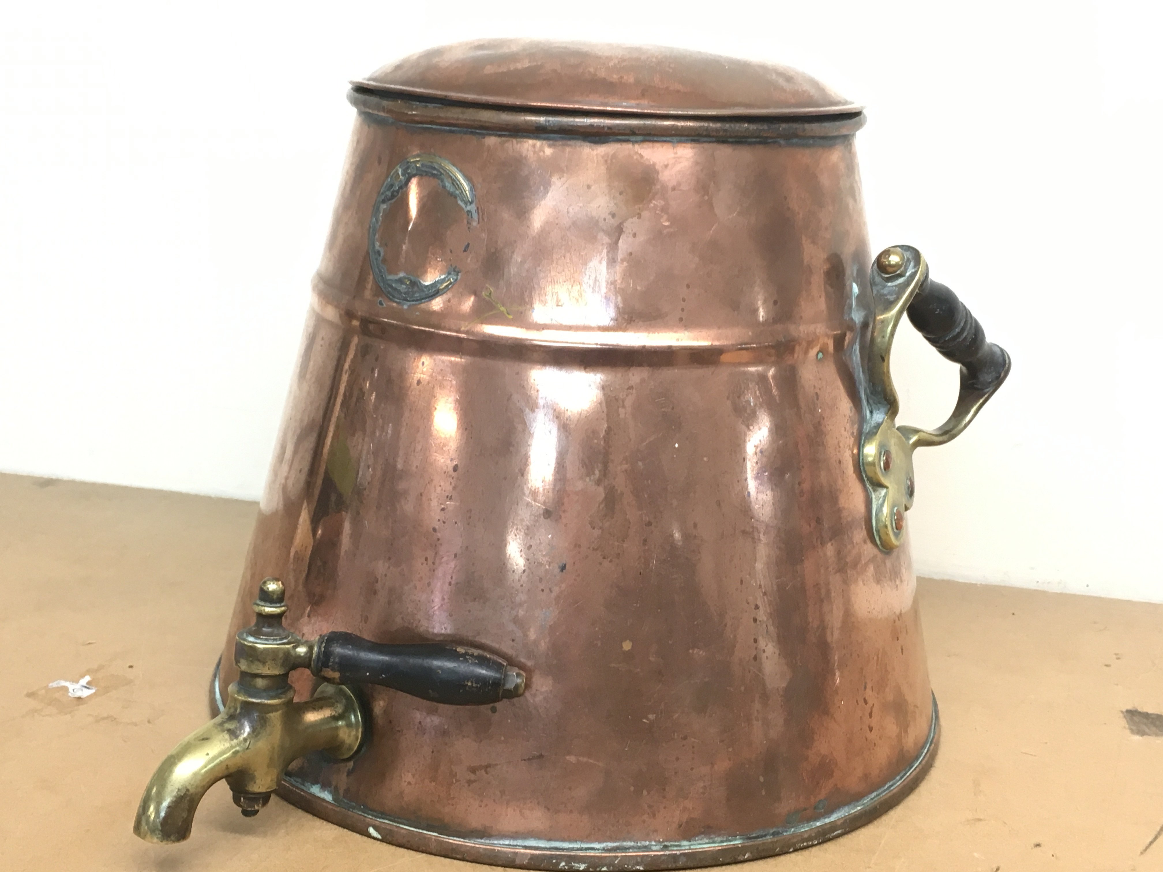 An unusual antique copper hot water urn with tap and two offset handles , 26cm tall. Postage category C