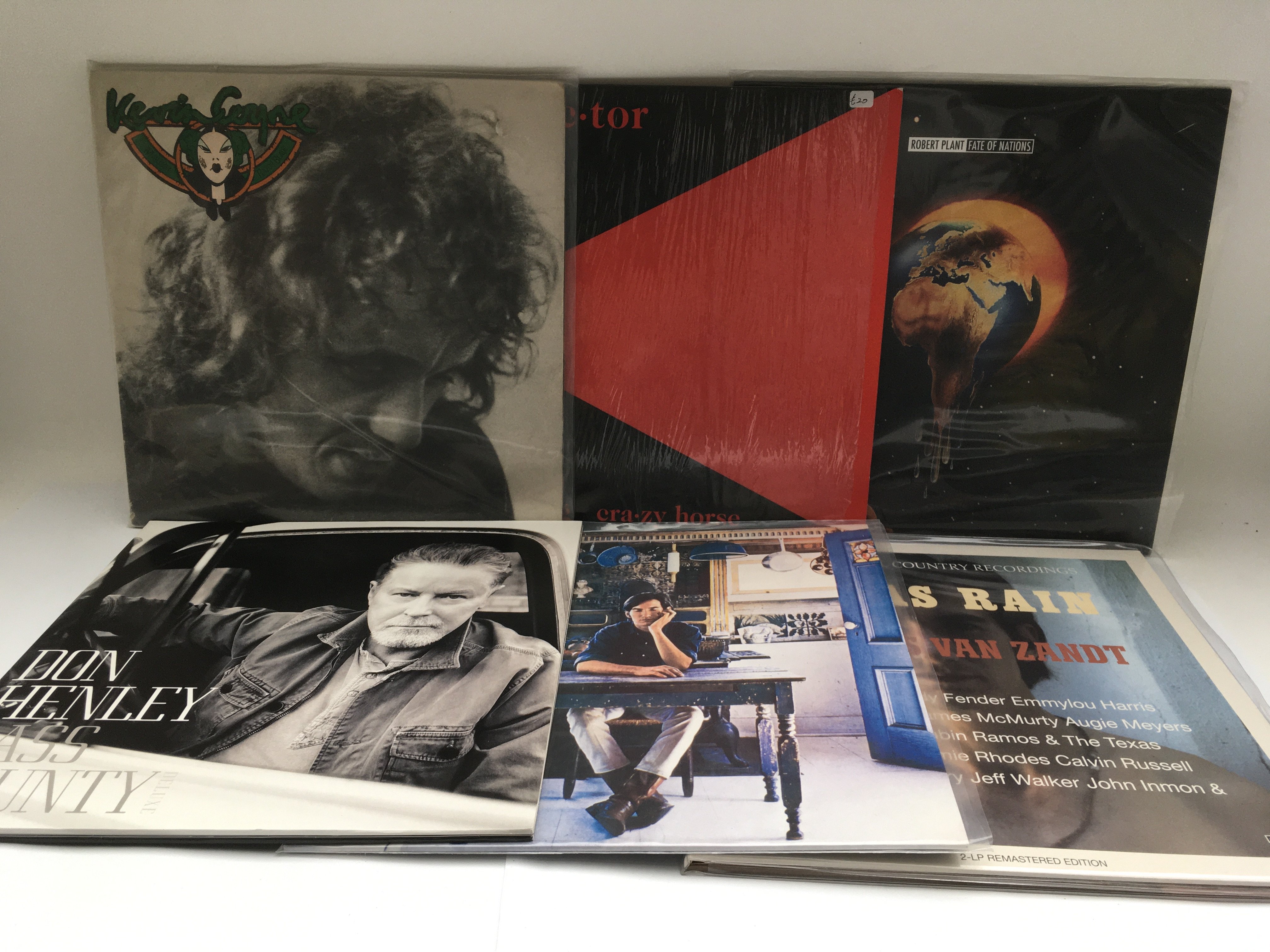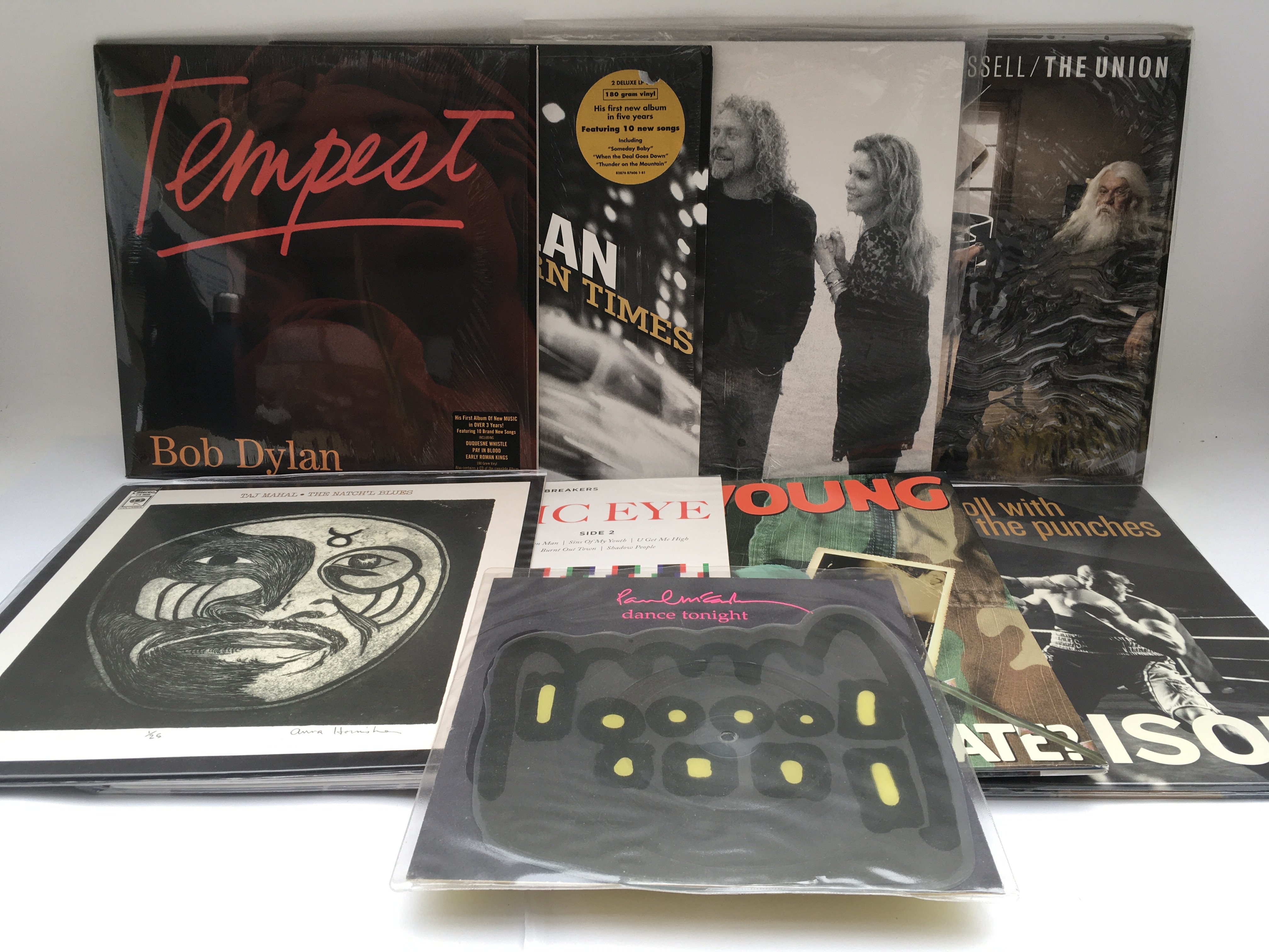 Two bags containing 14 LPs and a shaped 7" single by various artists including Bob Dylan, Robert Plant, Taj Mahal and others. Includes original and 180g pressings.