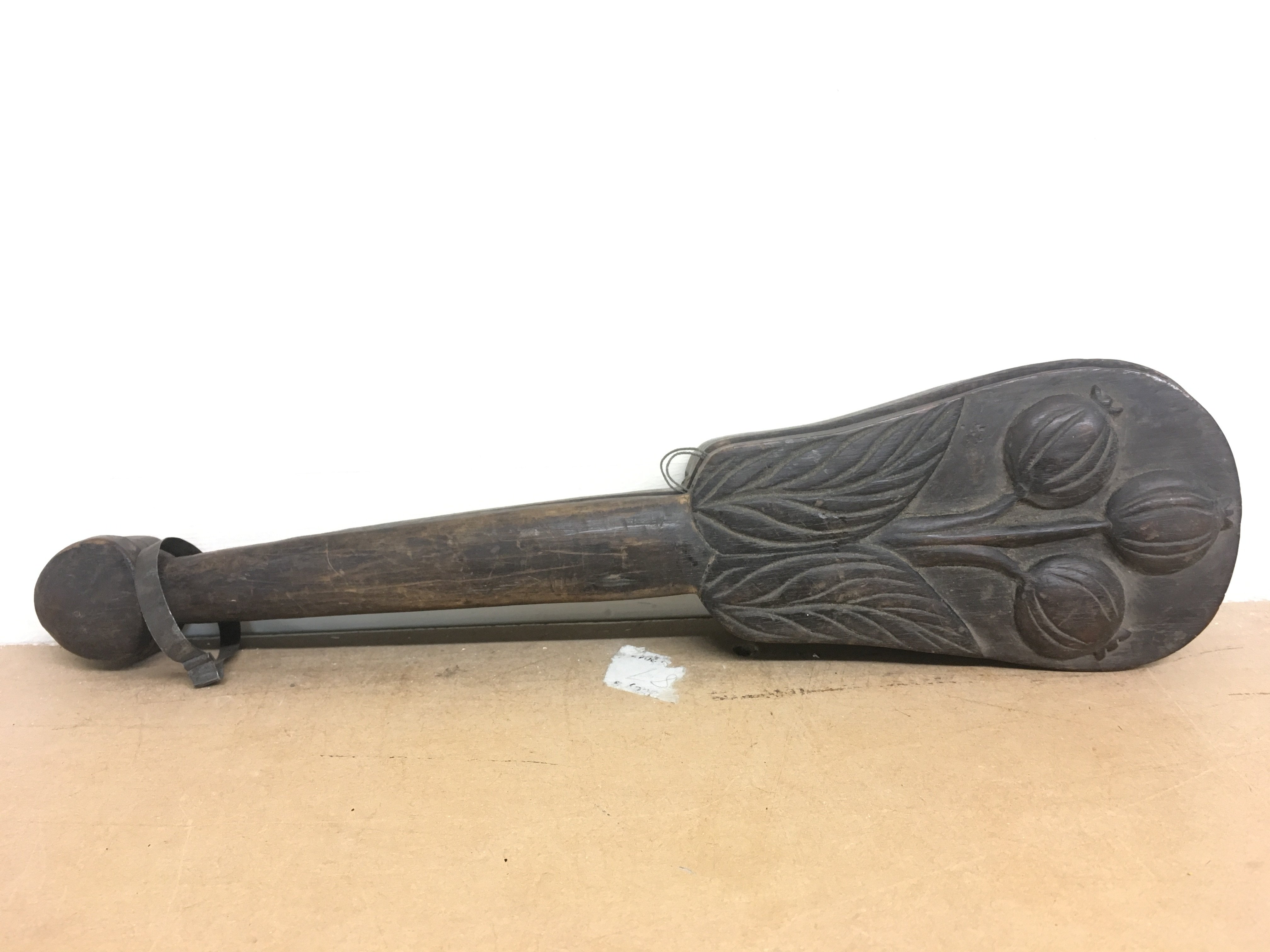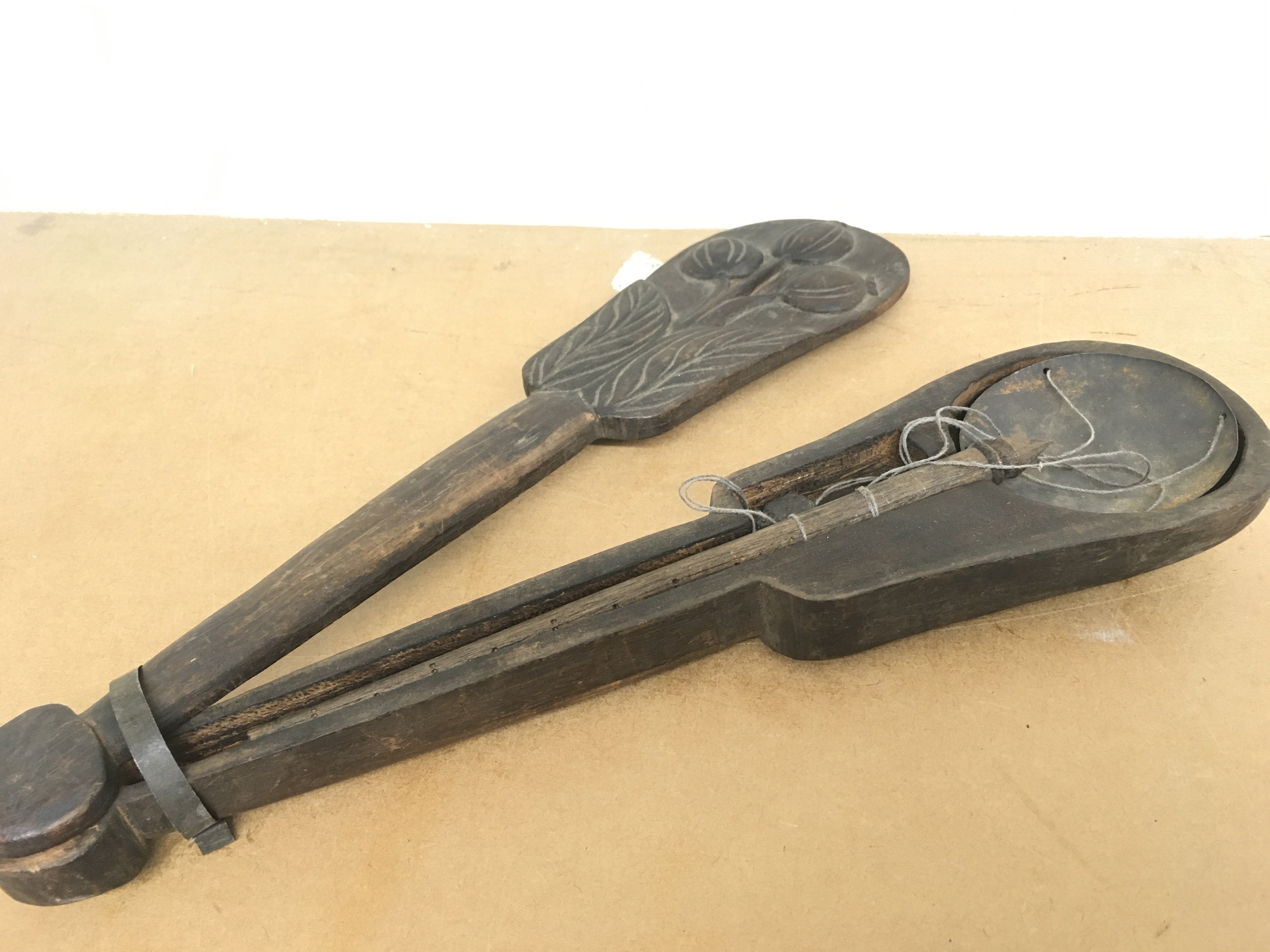 Unusual wooden carrying scales in a floral design case. Possibly African. Postage category B