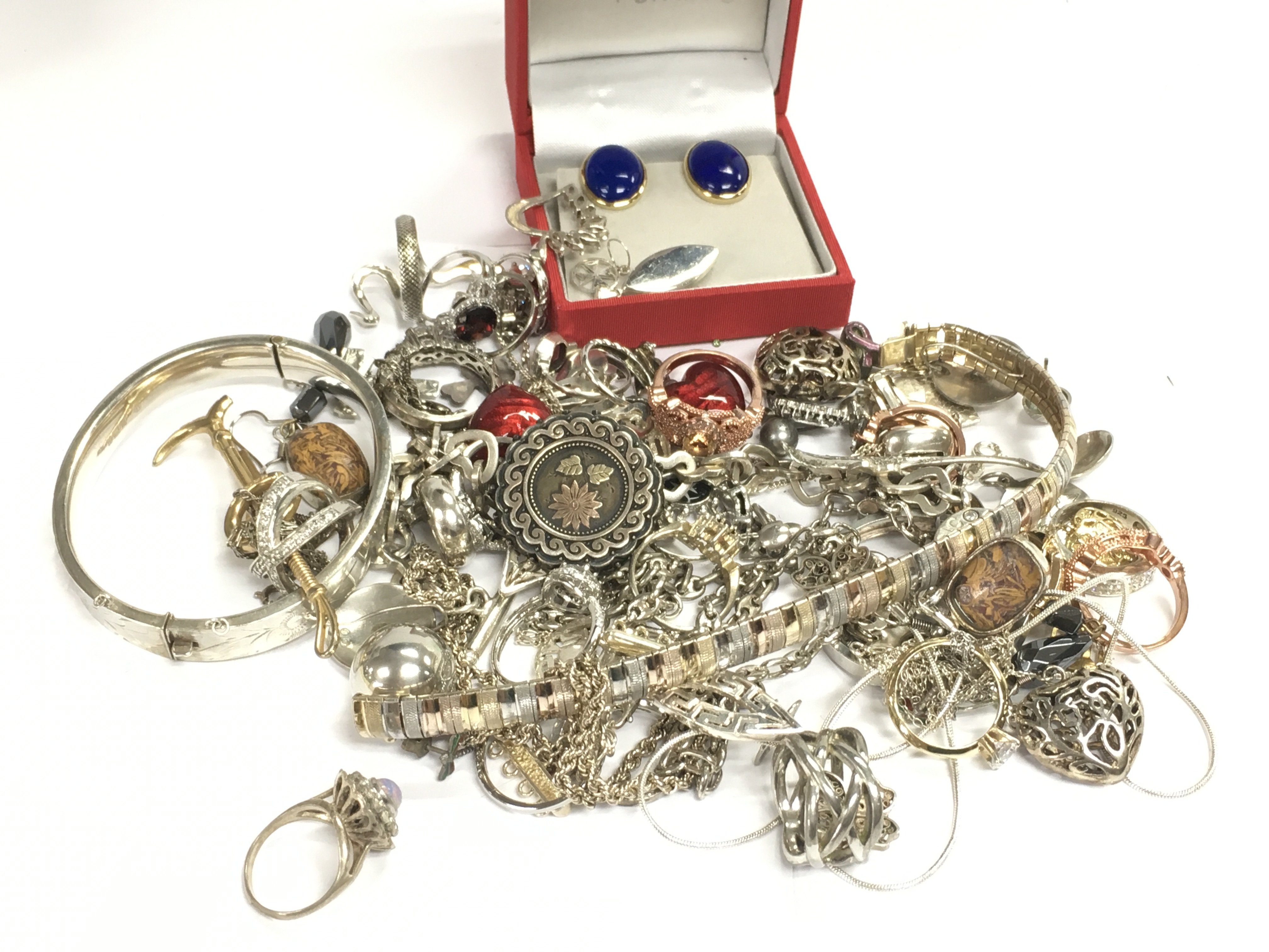 A collection of silver jewellery including necklaces, rings, earrings. Postage category A