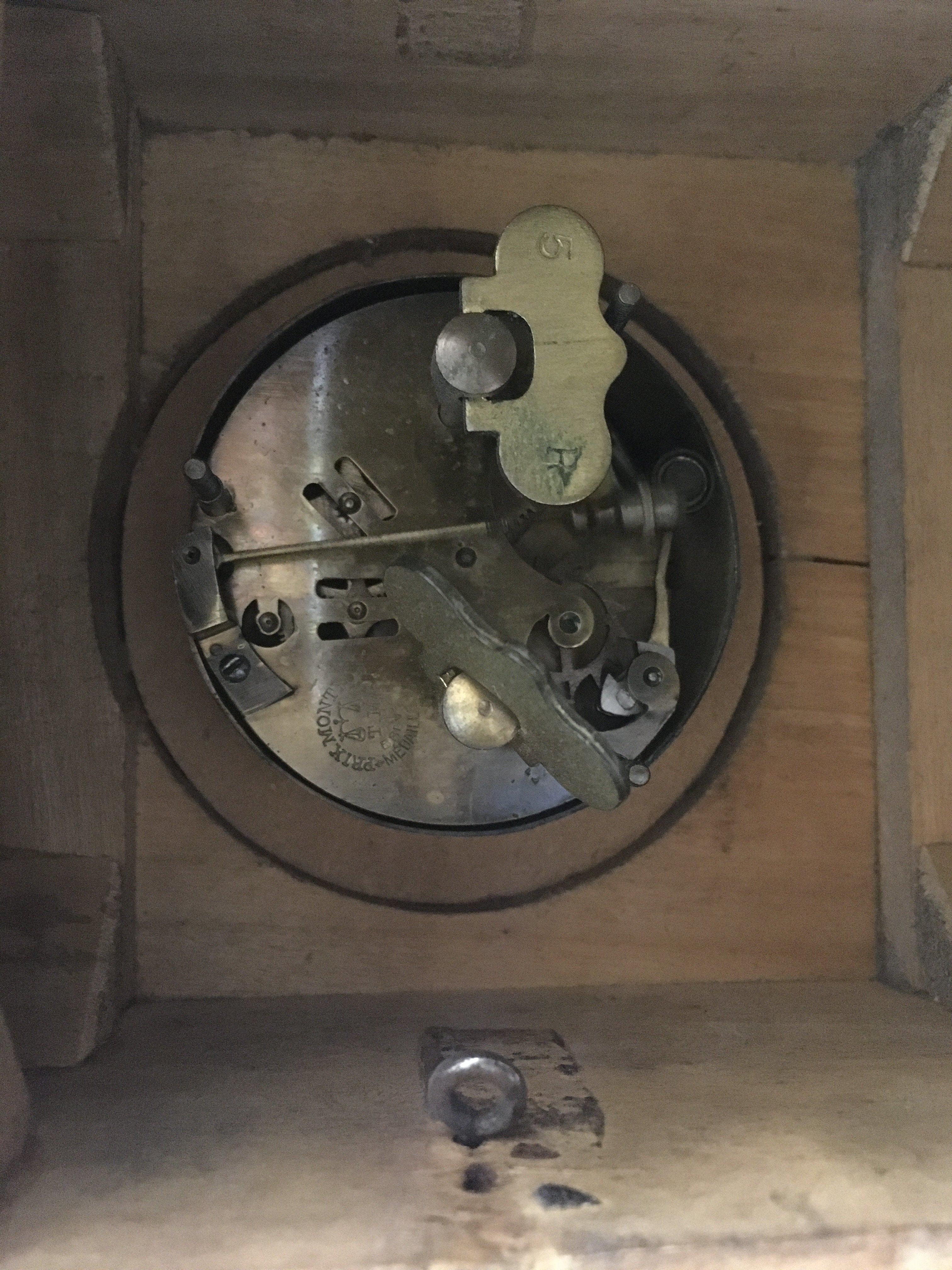 A black wooden mantle clock, the circular dial having Roman Numerals NO RESREVE