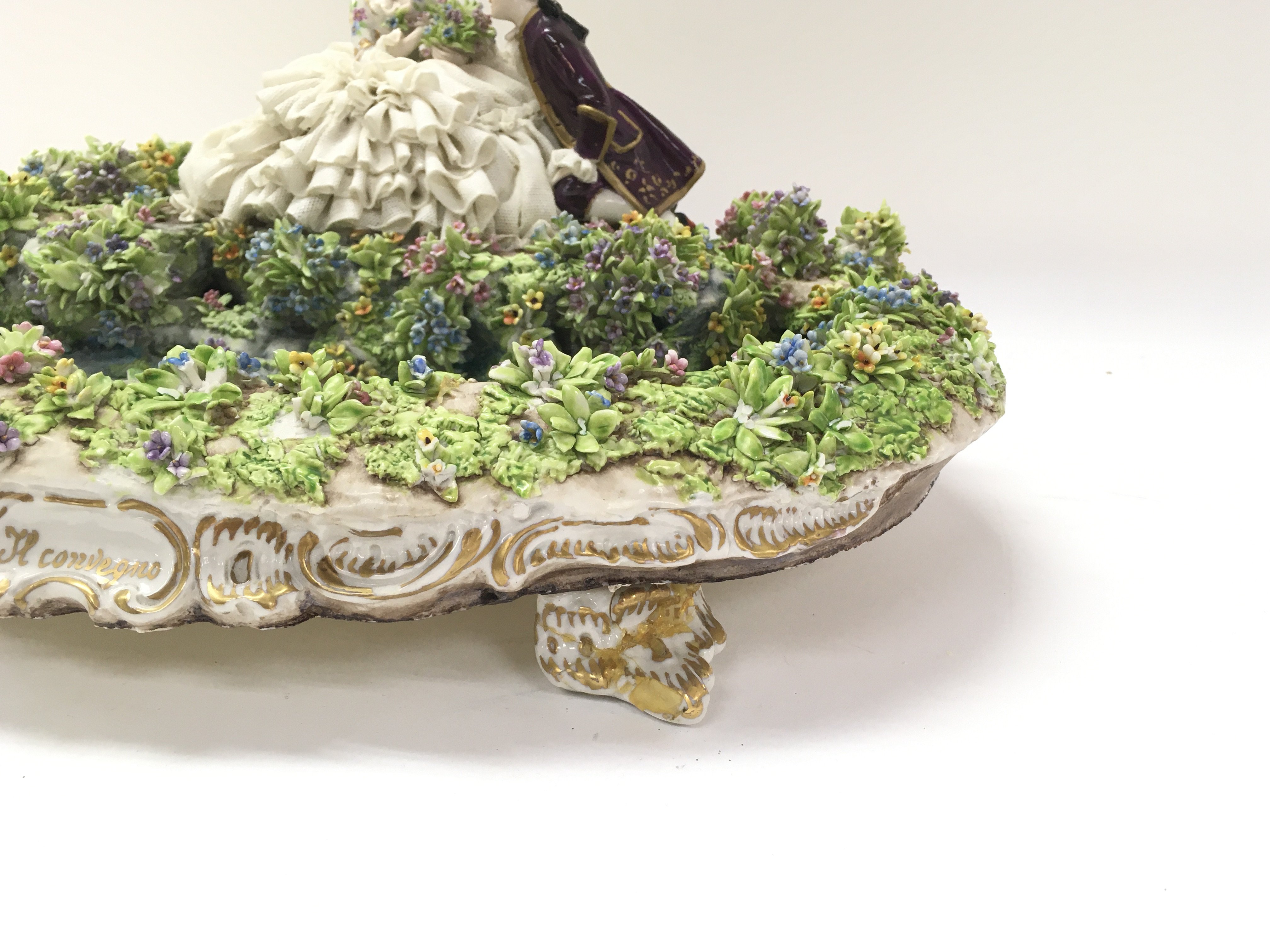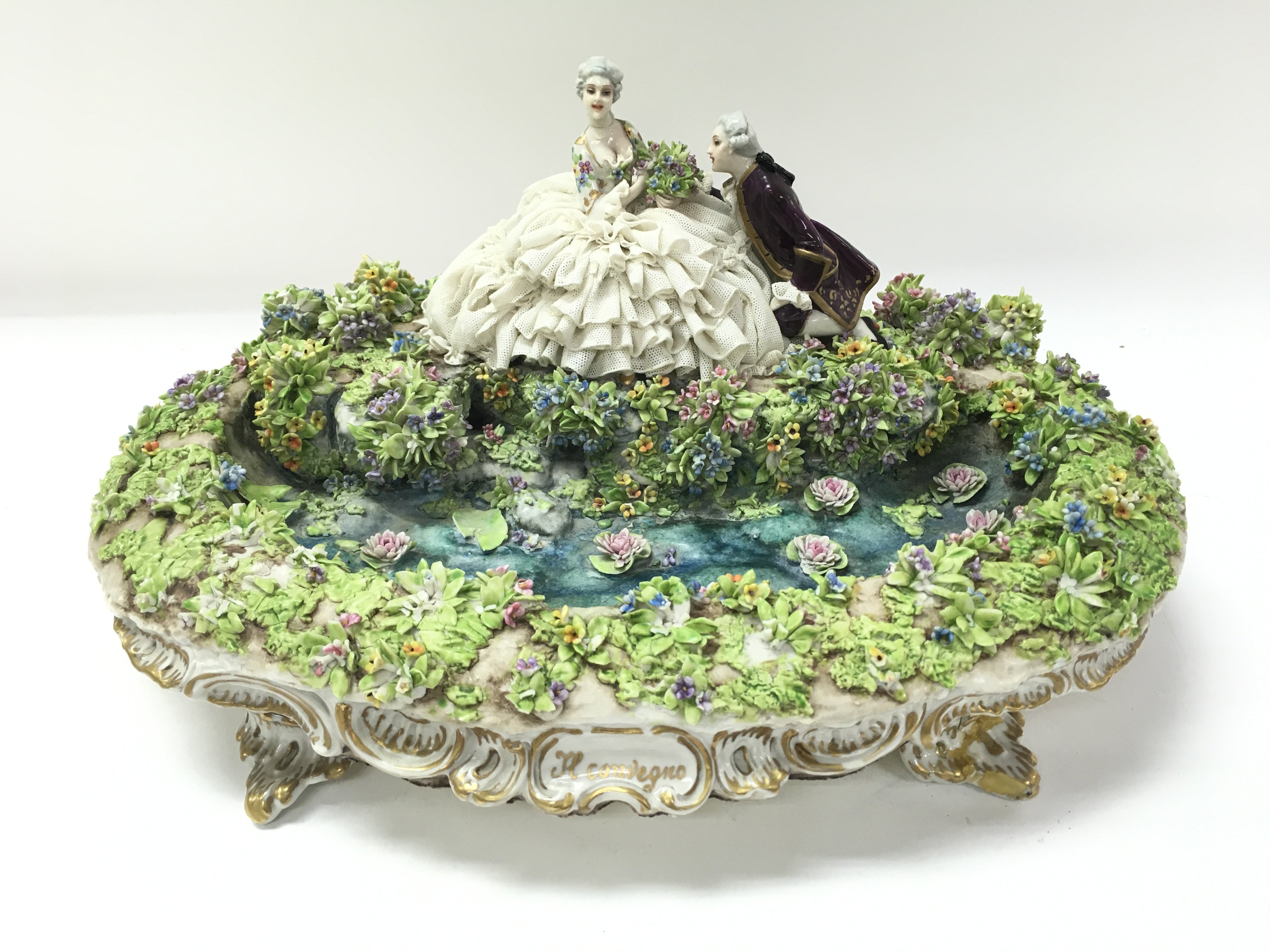 A large Dresden fine porcelain figurine. Repair to front right leg and damaged noted on dress and areas of foliage. 37cm wide 16cm tall