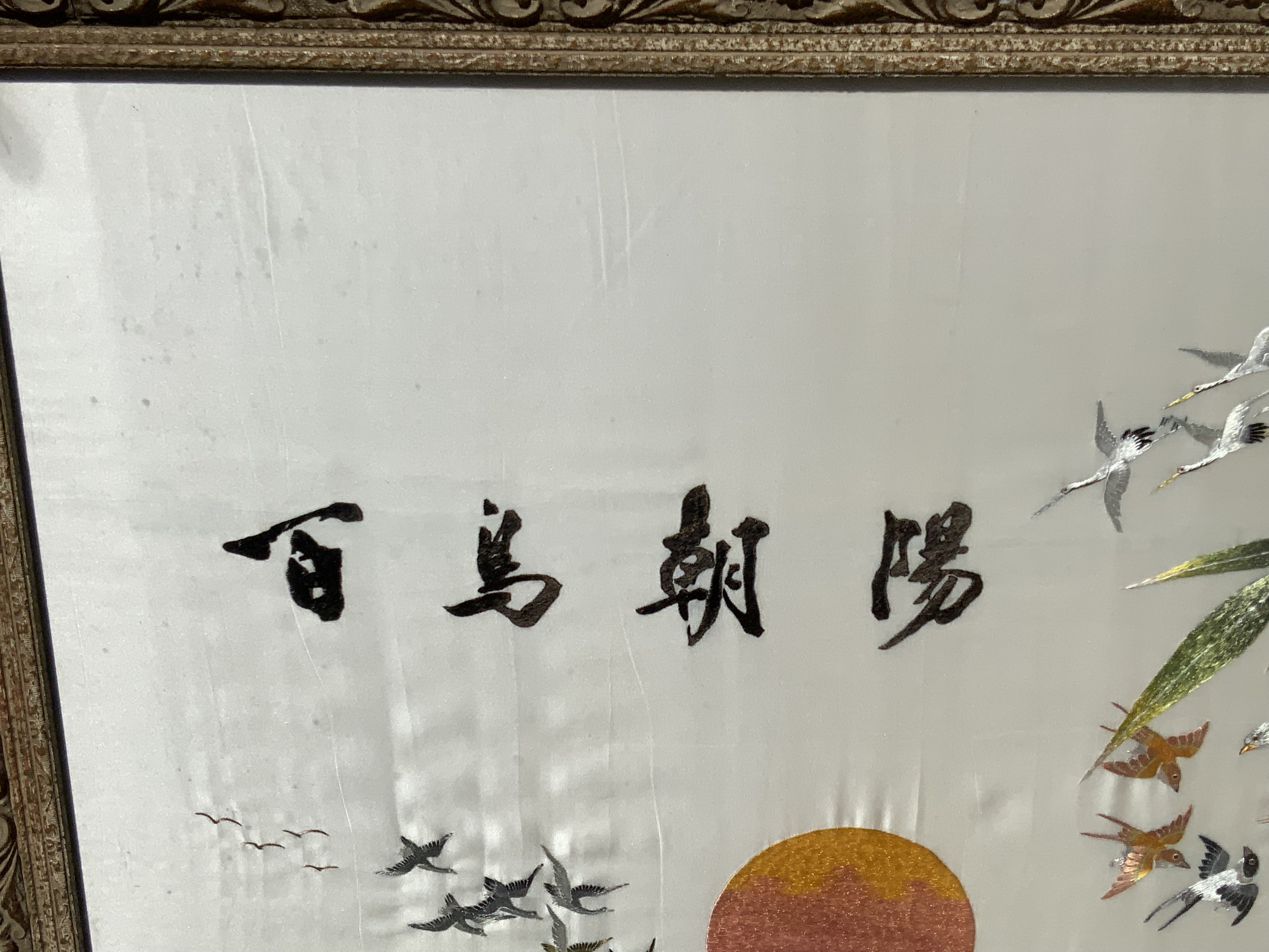 An intricate and wonderfully decorative large mid century Chinese silk embroidery of 100 Birds. Hundred Birds paying court to the Phoenix (Bainiao Chao Feng ????), the phrase carries the meaning of Peace under a wise ruler," (155cm x 95cm). (Previously owned and from the estate of Sid James unfortunately no provenance).