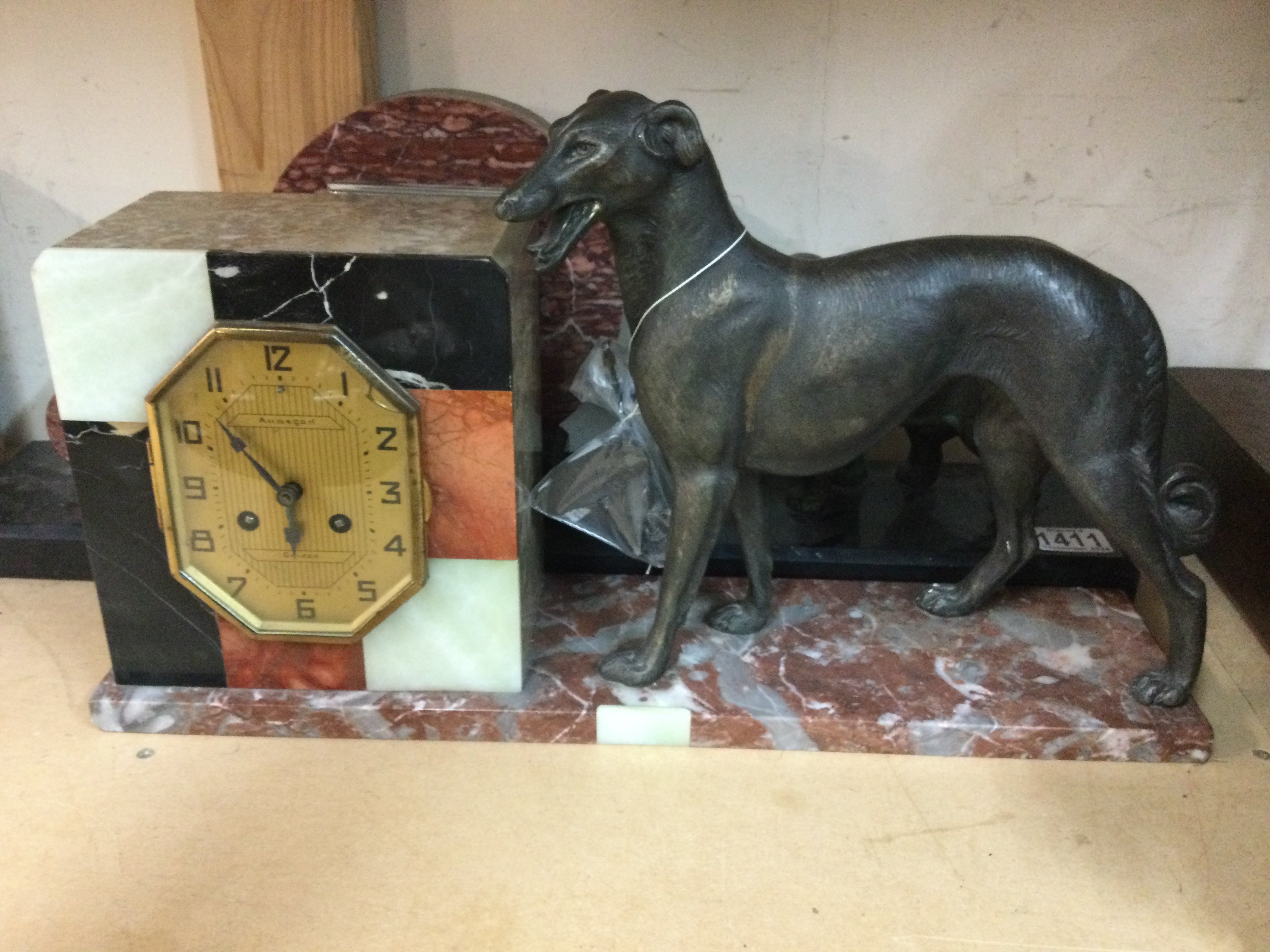 Three Art Deco mantle clocks surmounted with figures, dog and elephant.0