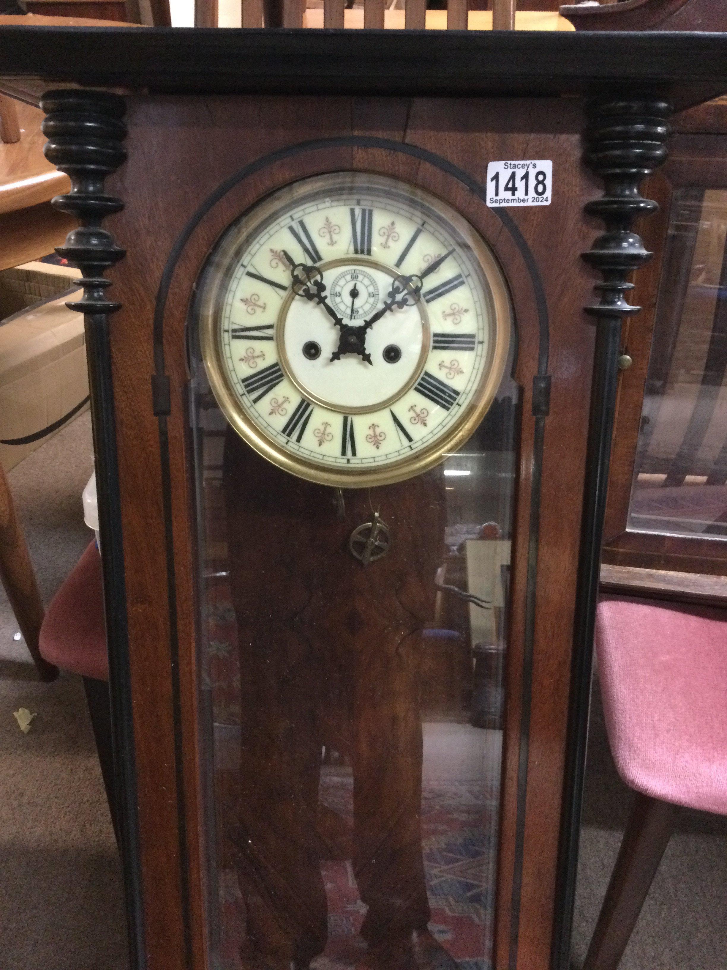 A mahogany wall clock with double weight the dial with Roman numerals. NO RESERVE