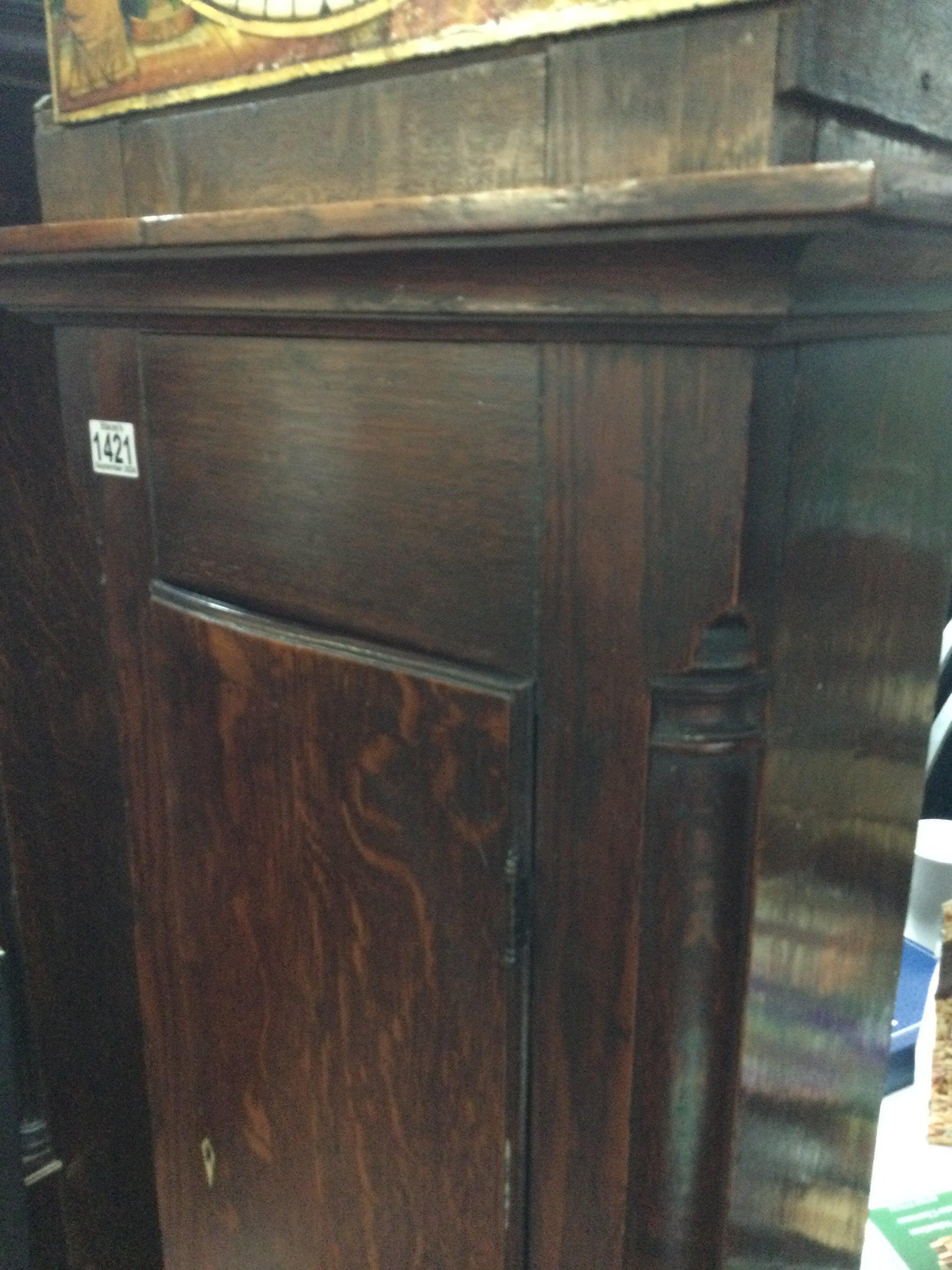 A oak long case clock the arched painted dial with Roman numerals. NO RESERVE