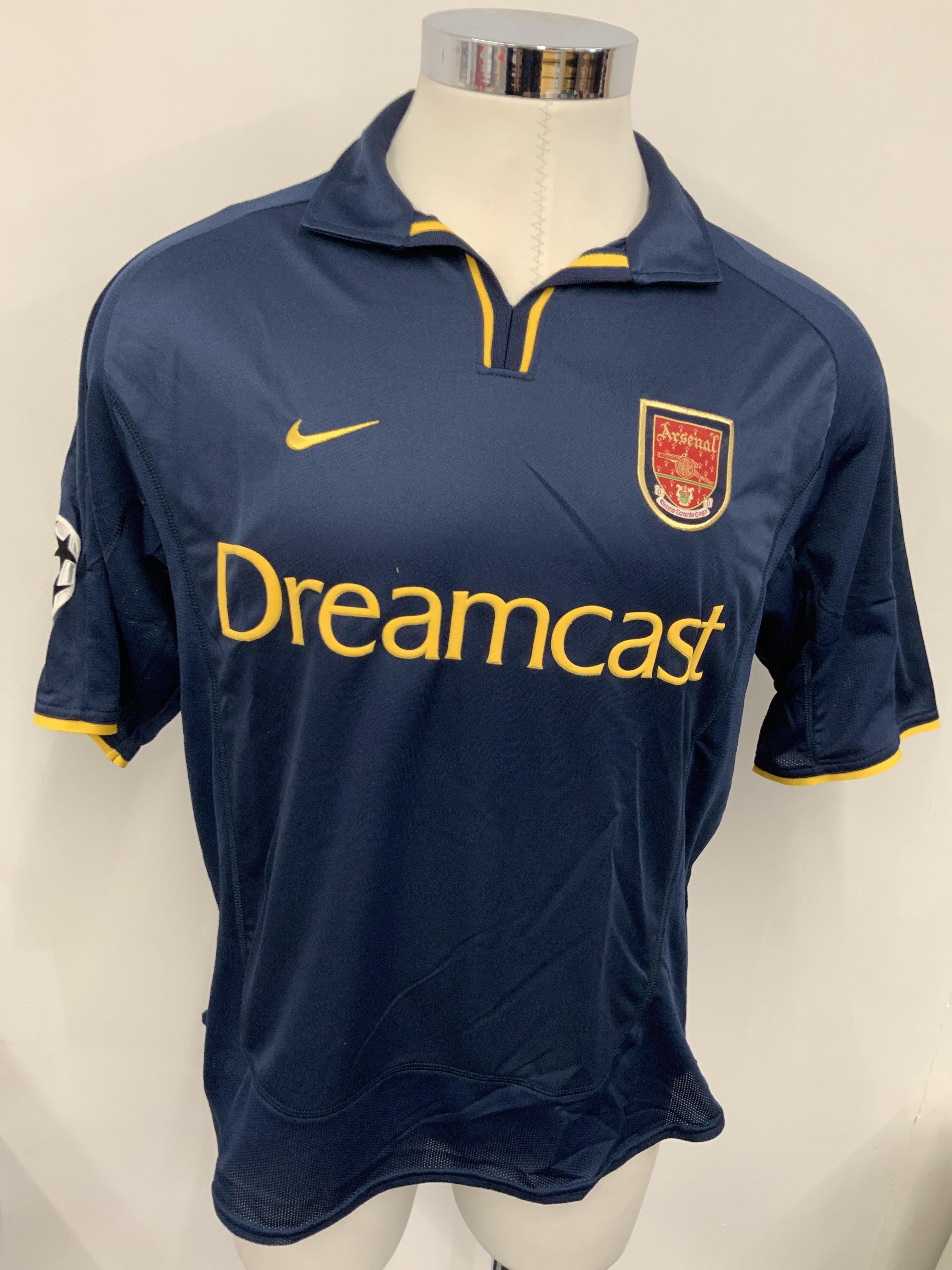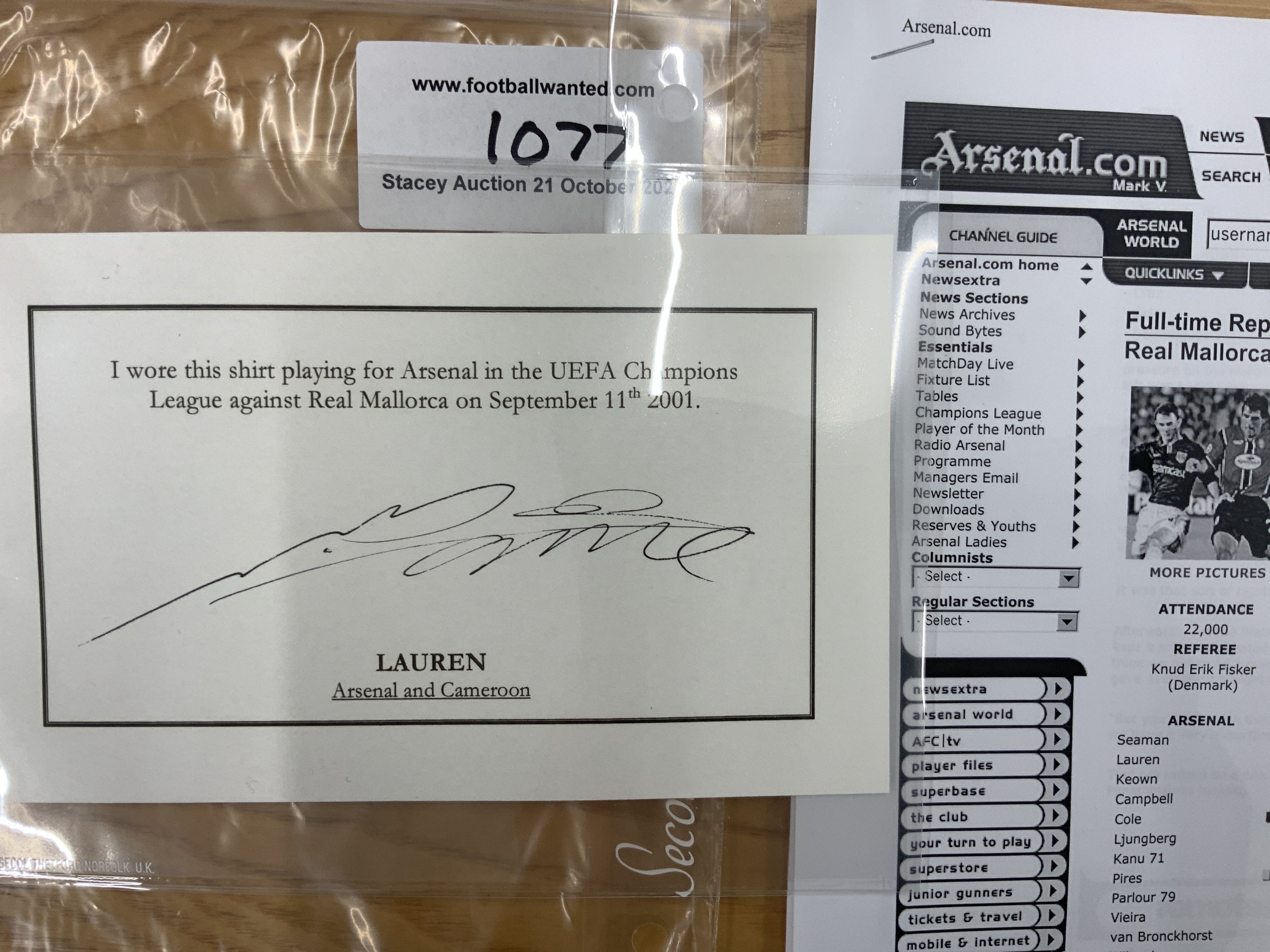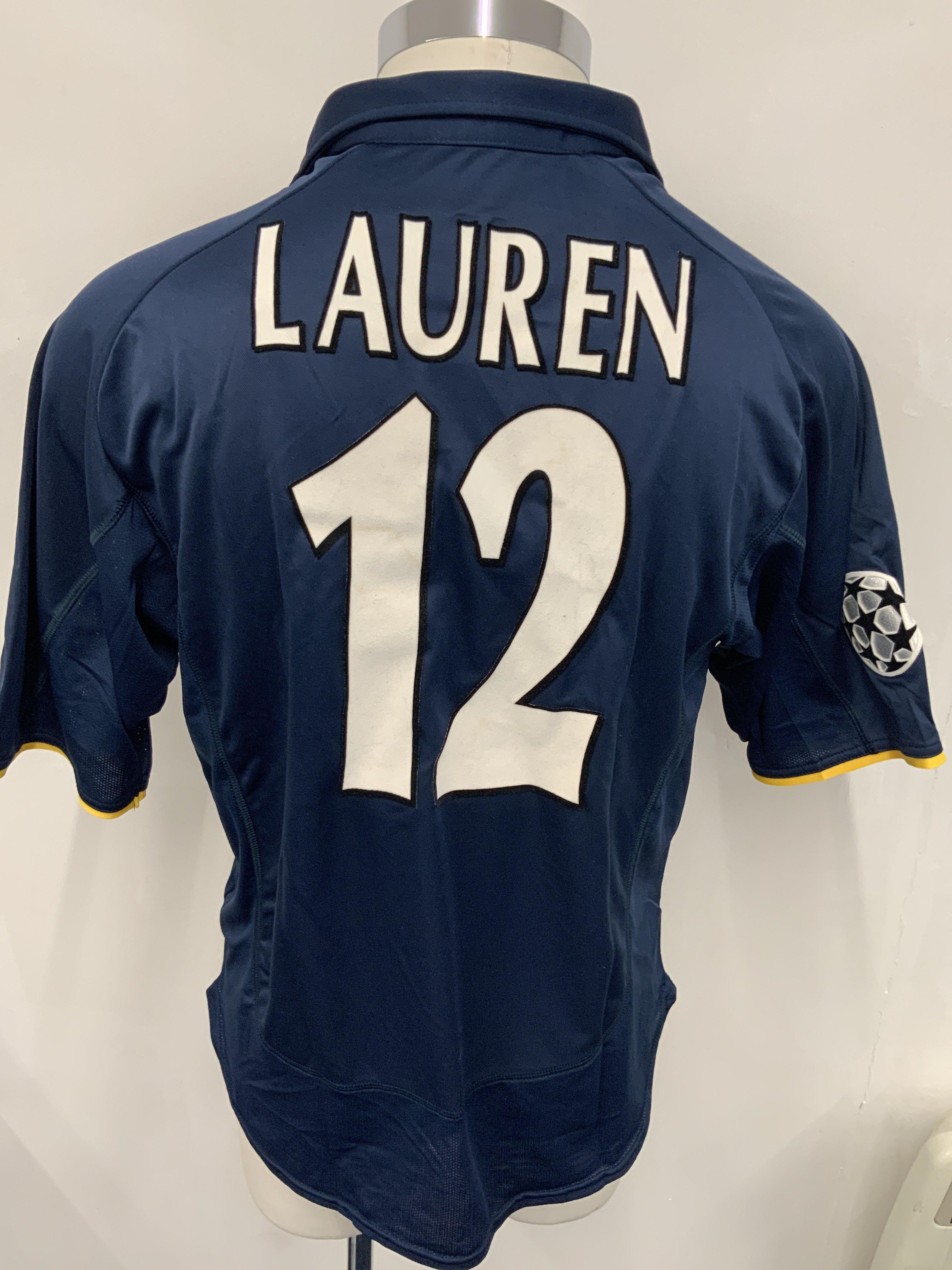 Arsenal 2001 - 2002 Match Worn Football Shirt: Short sleeve blue 3rd kit with Champions League badging to sleeve. Lauren number 12 to rear. Dreamcast sponsor. Signed COA stating I wore this shirt v Real Mallorca on September 11th 2001 a historic day in history.